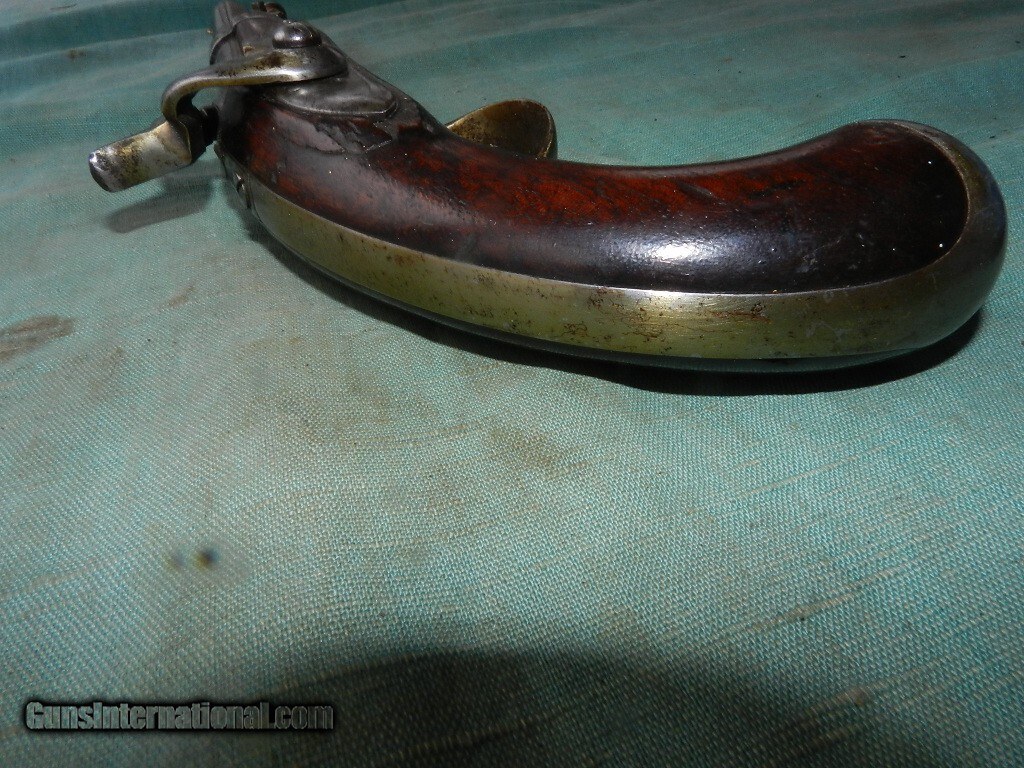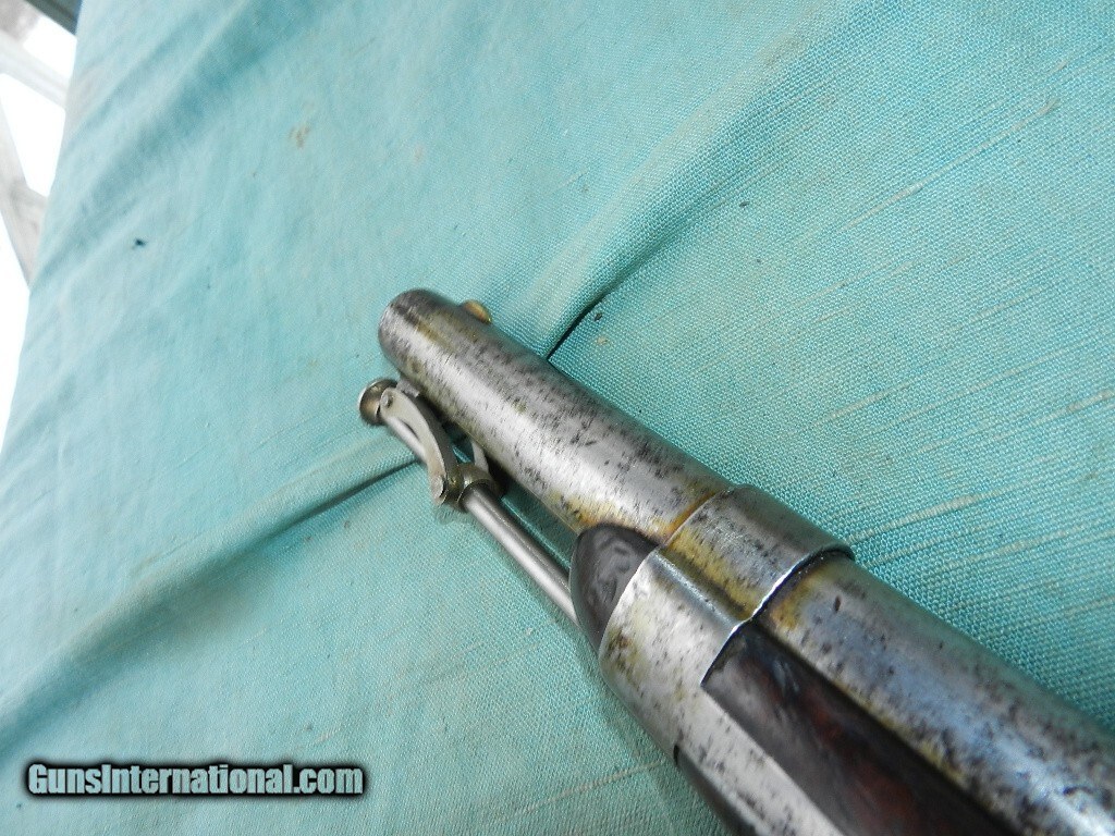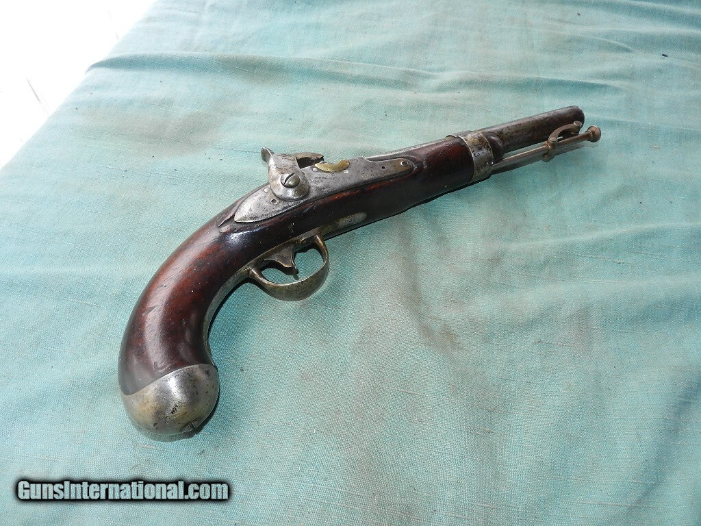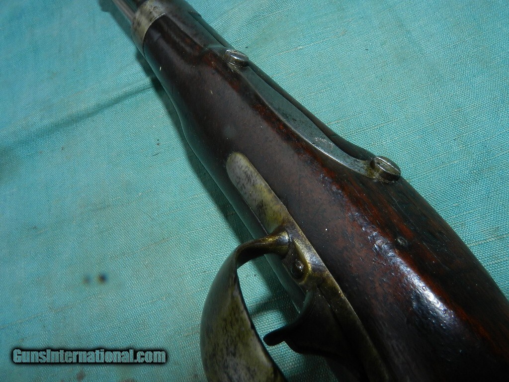 Description: At .54 cal, with an 8 1/2” round barrel with a moderately oxidized bore. This pistol was converted using the Belgian method,and has the conversion of the Confederacy as the lock-plate marking about removed and the hammer was shaped and bent over from anothewr weapon with shallow dents from heating, and bending, and not U,S. Armory type workmanship duting that time.. And the metal surfaces mostly pewter gunmetal patina with areas of salr & pepper pitting near the breech from extended usage. The hammer appears to be from a Maynard system firearm and the swiveling ramrod assembly parts are later replacements. Markings have mostly been removed, with lockplate showing legible but faint, “US” And the brass pan toned to goldenrod. The smooth walnut stock rates about very good with some old cracks and thin shallow chips behind lockplate and near lock screw with old added finish and scattered dings. The left flat and the lock seems to be functional , and the nipple is clogged will try to replace it soon. When buying a gun always have it examined by a competent gunsmith before shooting. To buy a gun from me you must get a direct email for me, with details, and shipping cost. We don’t have a web site .I prefer money orders or a check. Item ships when funds come in. I try to keep guns affordable, which means I make less money than most dealers. You won’t get altitude sickness, or nose bleed, with my prices! I consistently have the best selection of older guns If you attempt to buy, you must still contact us for details . Best to email to buy. Sometimes a local person can stop buy and purchase before the gun is removed. Sometimes not home to get calls. Some guns are required shipment to a gun dealer near you for a transfer to you when it arrives. Otherwise many older or black powder guns ship to your door. With the widest selection of older guns at great prices, We don’t have a store, and sell on the internet only. I’m easy to get along with. Thank You Antique: Yes Price: $1,495.00 Contact Seller |