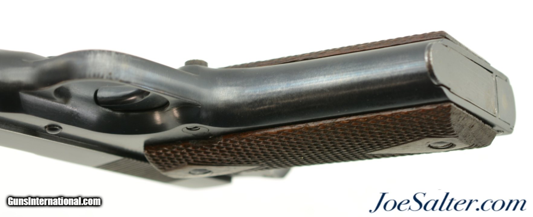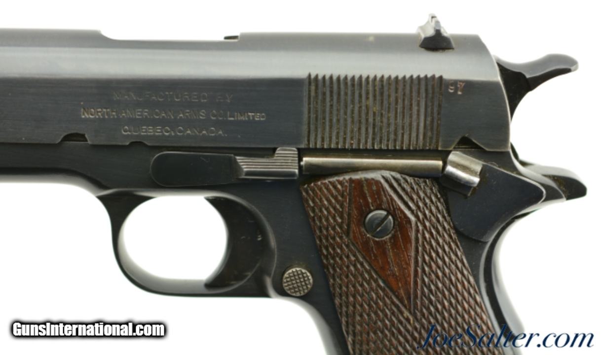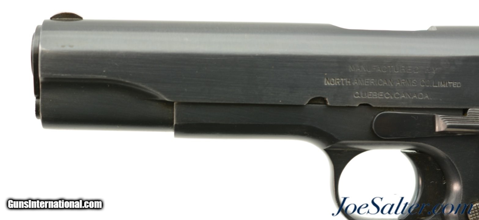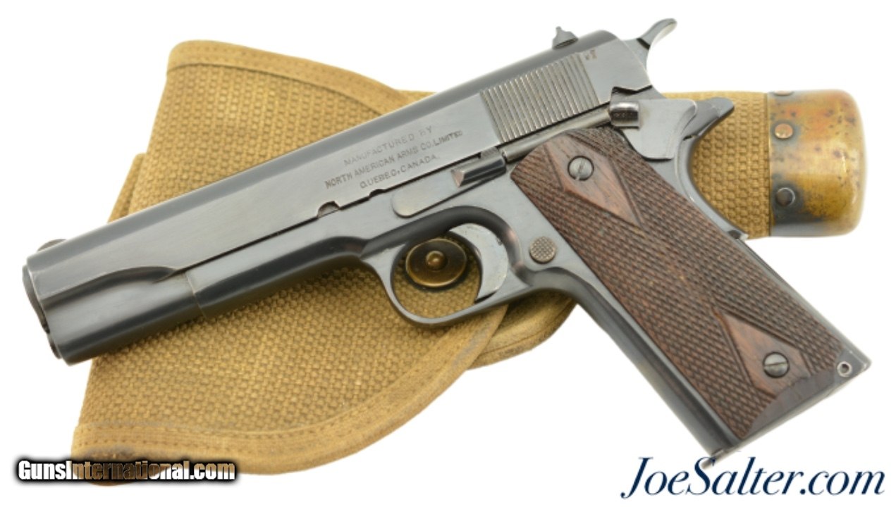 Description: Serial #97, .45 ACP, 5" barrel with a find, bright bore that has some very mild freckling present within the grooves. This is one of just over 100 original prototype, or tool room sample pistols, manufactured by North American Arms Co. Ltd. of Quebec City, Canada. The metal retains 95-97% of the commercial quality blue finish with some fading along the high edges and projections. Some subtle mottling is present along the sides of the slide, but the markings remain clear and the edges are still sharp and crisp. The checkered, double diamond grips are likewise in very good shape, with some minor wear and flattening of the points on either panel. The magazine is in good condition, but has two areas of cleaned pitting that have gray metal surrounding them. North American was awarded a US Ordnance Dept. contract (#WAR ORD P-11092-1953SA) on July 1, 1918, to produce 500,000 pistols at the rate of 2,000 pistols per day, for a cost of $15.50 each. North American’s production facilities were housed in the Ross Rifle factory, but the armistice that November caused the contract to be cancelled on December 4, 1918. As a result, North American Arms never delivered any pistols or spare parts to the US Government under the contract. In addition to the maker’s marking on the left side of the slide, North American Arms pistols differ from other contract-made Model 1911s by having an uncheckered hammer, no lanyard loop on the mainspring housing, serial number on the left rear of the slide, and no US acceptance or inspection stamps. Information gleaned from an ex-North American Arms employee indicates that a few of the late guns in the series were left in-the-white and were subsequently given a blued finish by one of the gunshops operating in Quebec City at the time. The serial number and rust blue finish on this pistol would be consistent with a period commercially-applied finish, but unfortunately there are no surviving records. The pistol is housed in a 1914-dated Mills canvas holster that is in fine shape with no fraying and only a few very minor stains and worn black finish on the brass cap. This is a fantastic, highly desirable Model 1911 variant in fine overall condition, and would make a splendid addition to any collection. FFL or C&R SOLD Curio/Relic: Yes |