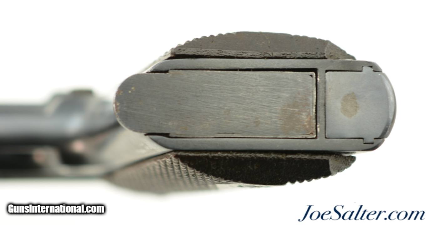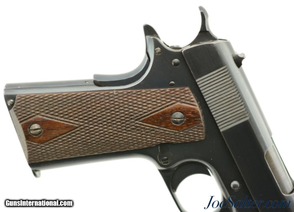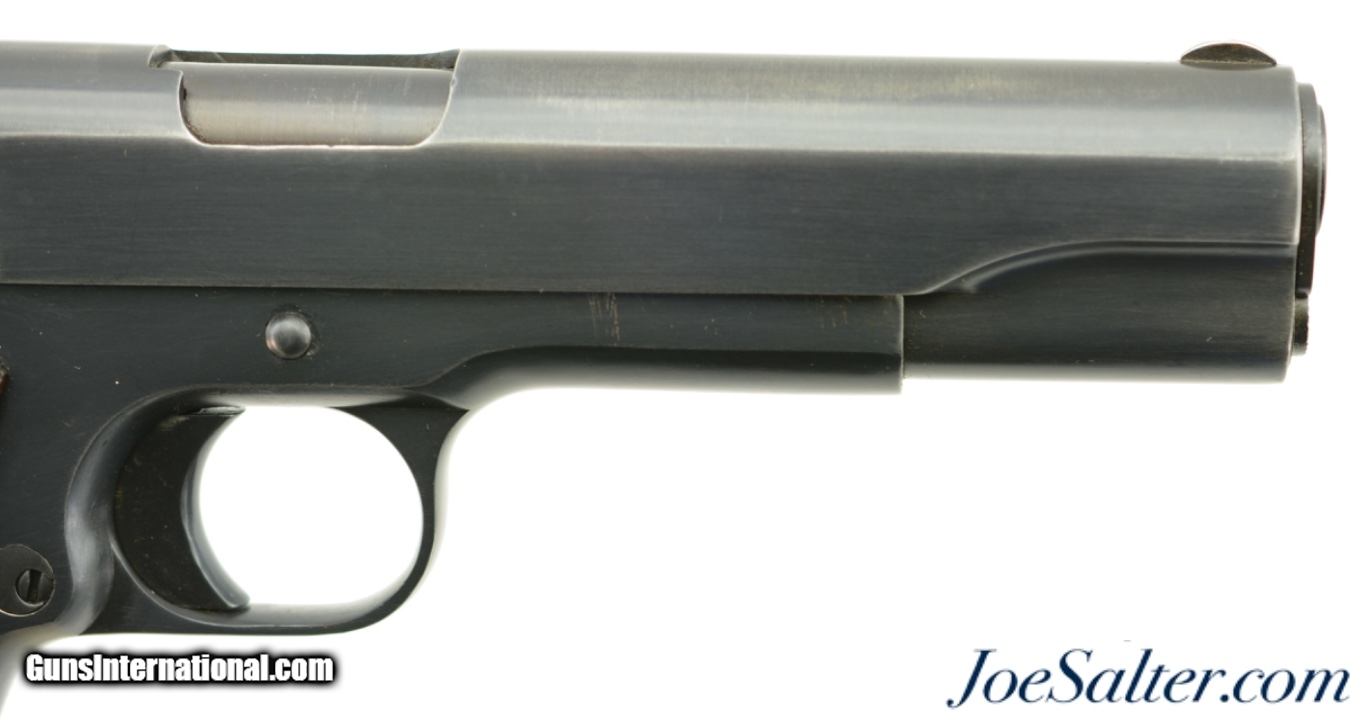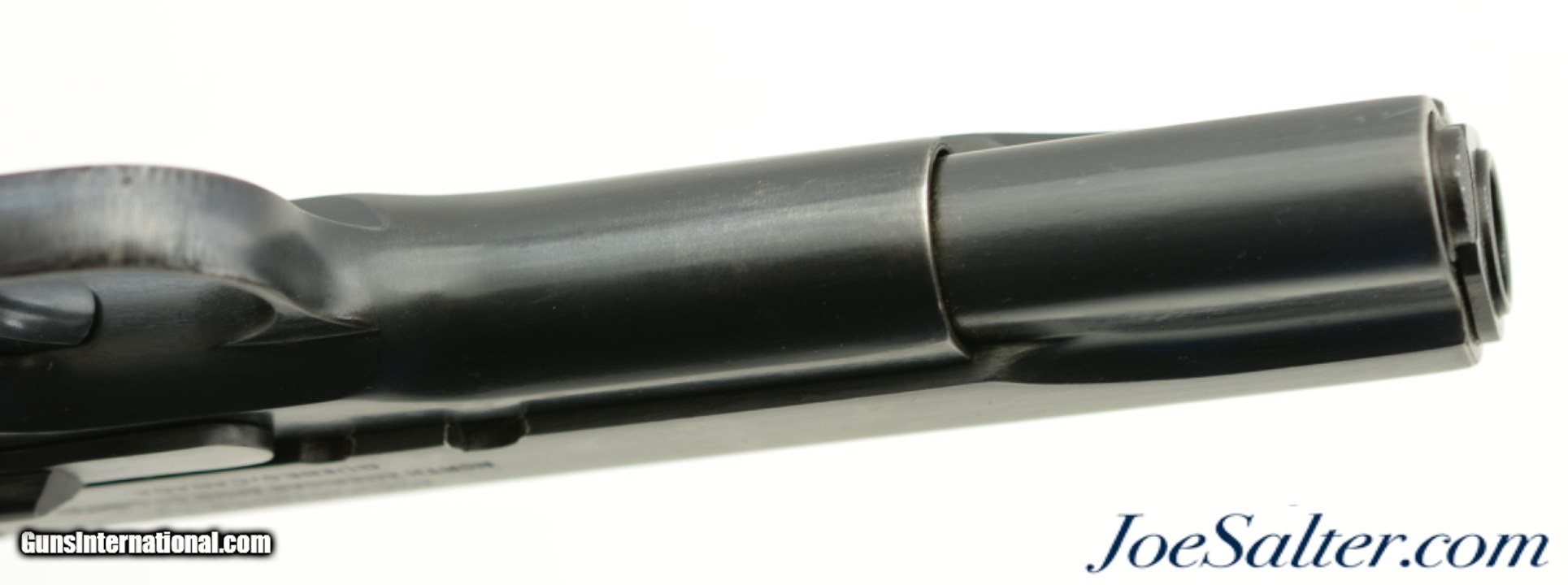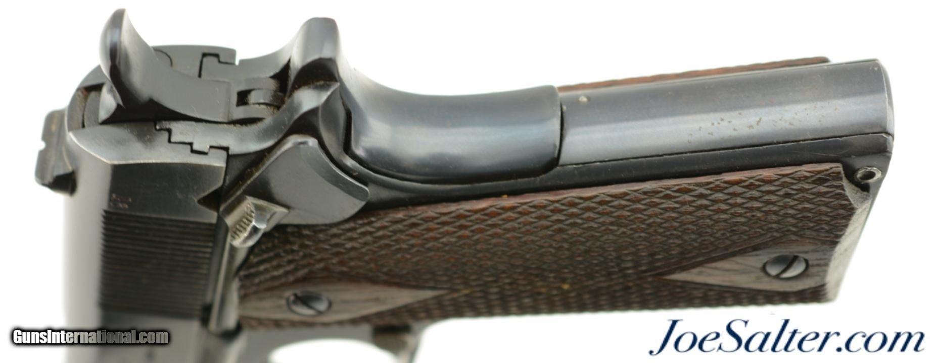 Description: Serial #97, .45 ACP, 5" barrel with a find, bright bore that has some very mild freckling present within the grooves. This is one of just over 100 original prototype, or tool room sample pistols, manufactured by North American Arms Co. Ltd. of Quebec City, Canada. The metal retains 95-97% of the commercial quality blue finish with some fading along the high edges and projections. Some subtle mottling is present along the sides of the slide, but the markings remain clear and the edges are still sharp and crisp. The checkered, double diamond grips are likewise in very good shape, with some minor wear and flattening of the points on either panel. The magazine is in good condition, but has two areas of cleaned pitting that have gray metal surrounding them. North American was awarded a US Ordnance Dept. contract (#WAR ORD P-11092-1953SA) on July 1, 1918, to produce 500,000 pistols at the rate of 2,000 pistols per day, for a cost of $15.50 each. North American’s production facilities were housed in the Ross Rifle factory, but the armistice that November caused the contract to be cancelled on December 4, 1918. As a result, North American Arms never delivered any pistols or spare parts to the US Government under the contract. In addition to the maker’s marking on the left side of the slide, North American Arms pistols differ from other contract-made Model 1911s by having an uncheckered hammer, no lanyard loop on the mainspring housing, serial number on the left rear of the slide, and no US acceptance or inspection stamps. Information gleaned from an ex-North American Arms employee indicates that a few of the late guns in the series were left in-the-white and were subsequently given a blued finish by one of the gunshops operating in Quebec City at the time. The serial number and rust blue finish on this pistol would be consistent with a period commercially-applied finish, but unfortunately there are no surviving records. The pistol is housed in a 1914-dated Mills canvas holster that is in fine shape with no fraying and only a few very minor stains and worn black finish on the brass cap. This is a fantastic, highly desirable Model 1911 variant in fine overall condition, and would make a splendid addition to any collection. FFL or C&R SOLD Curio/Relic: Yes |