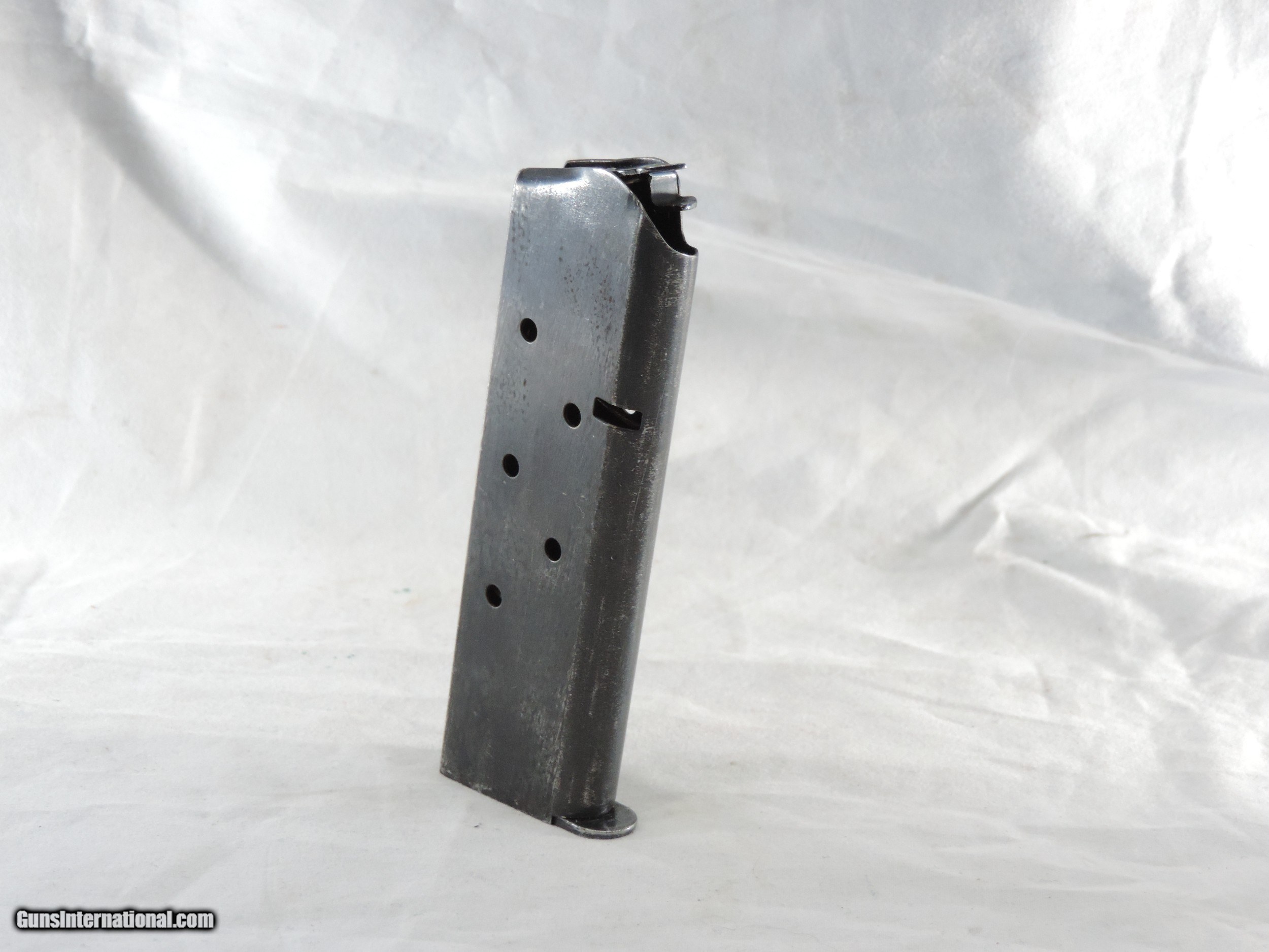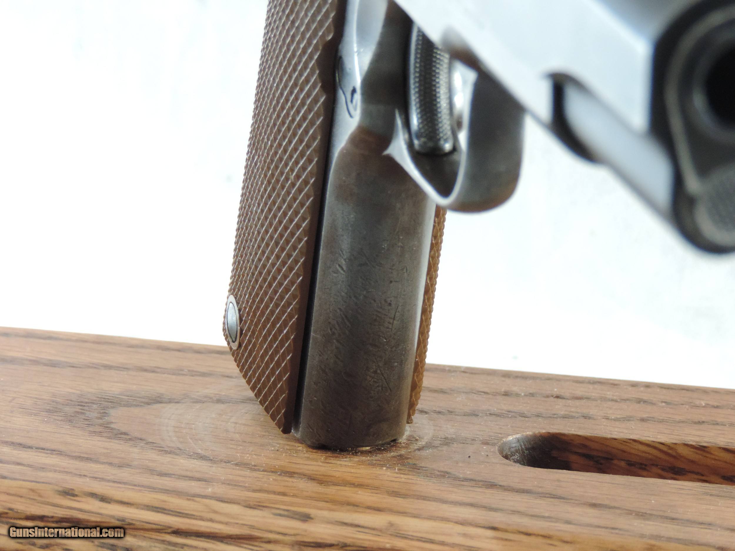 Description: INV. 9029 GREAT, COLT 1911-A1, CAL. .45ACP, SER. 2299960. MFG.1945. THIS BEAUTY IS AMERICA'S MILITARY PISTOL ICON. IT HAS RETAINED ABOUT 95+% OF THE ORIGINAL FINISH. THE LITTLE LOSS THERE IS, IS FROM SOME SLIGHT SHARP EDGE SHARP EDGE SILVERING. PROBABLY FROM A HOLSTER. THERE ARE NO PITS, RUST SPOTS OR RUB MARKS ANYWHERE. THE GRIP STRAPS SHOW LITTLE OR NO GRAYING. ALL PARTS MATCH AND ARE PROPER FOR THE GUN. THE TOP OF THE SLIDE HAS THE "P" PROOF, THE FRONT GRIP STRAP A "P' PROOF AND THE "GHD" INSPECTOR'S STAMP. THE PLASTIC GRIPS ARE THE LARGE RING TYPE AND ARE PERFECT AS ARE THE SCREWS. THE SLIDE RAILS, BOLT FACE AND FEED RAMP SHOW LITTLE IF ANY USE. THE BARREL IS STAMPED "COLT .45 AUTO" UNDER THE CHAMBER AND IT IS MIRROR BRIGHT WITH RAZOR SHARP RIFLING, NOT A WHISP OF FROST ANYWHERE. IT COMES WITH ONE CORRECT "L", (M.S. LITTLE CO.) STAMPED MAGAZINE.THIS SOLDIER WOULD BE A GREAT ADDITION TO ANY COLLECTION AND A REAL BLAST AT THE RANGE. PRICED WELL BELOW MARKET ....$2995.*** ***100% SATISFACTION GUARANTEED. THE WHITE CRAYON DOES NOT MAR THE FINSH. IT EASILY REMOVED WITH LIGHTER FLUID AND A TOOTH BRUSH. WE WILL DO IT ON REQUEST. To purchase this firearm or if you want to request more information contact us at: Email ckguns[at]ymail[dot]com Phone 201-512-0002 Cell 201-575-6838 FAX 201-215-4759 We accept most major credit cards. Prices shown are Discounted 3% for Cash or Check. The buyer must be familiar with all the laws governing the purchase and the ownership of firearms in their own city and state. The Yankee Armorer, Inc is not responsible for any failure to comply with or observe these laws. The Yankee Armorer, Inc will only ship after full payment and receipt of all required documents. Shipping: Add $35.00 for handguns, $45.00 for long guns. New Jersey buyers are subject to a 7% sales tax. The Yankee Armorer, Inc offers a 3 day inspection period with full refund upon return of intact firearm and in the original condition. The Yankee Armorer, Inc offers a no interest lay away program - 25% down; 25% in 30 days; 25% in 60 days; and full payment in 90 days. Any violation of this policy is subject to restocking and forfeiture of all payments. Any variation from this policy must be agreed to in advance. Unshipped Cancelled sales are subject to a 20% restocking fee. Be advised that all firearms sold by The Yankee Armorer, Inc. or the Gun Exchange, LLC (SELLER) are sold as collector’s items. They have not been fired or tested for safety and must be examined by a license gunsmith prior to use. By purchasing any item from the (SELLER), you are agreeing to hold the (SELLER) free from any damages or lawsuits of any nature. Any item left for transfer or storage will be charged to $25.00 per month, per item from the day of its receipt. Any variation from this policy must be agreed to in advance. Store hours 10:00 am to 5:00 pm Tuesday -Saturday. It's always best to call for appointment. Store 201-512-0002, cell 201-575-6838. SOLD |