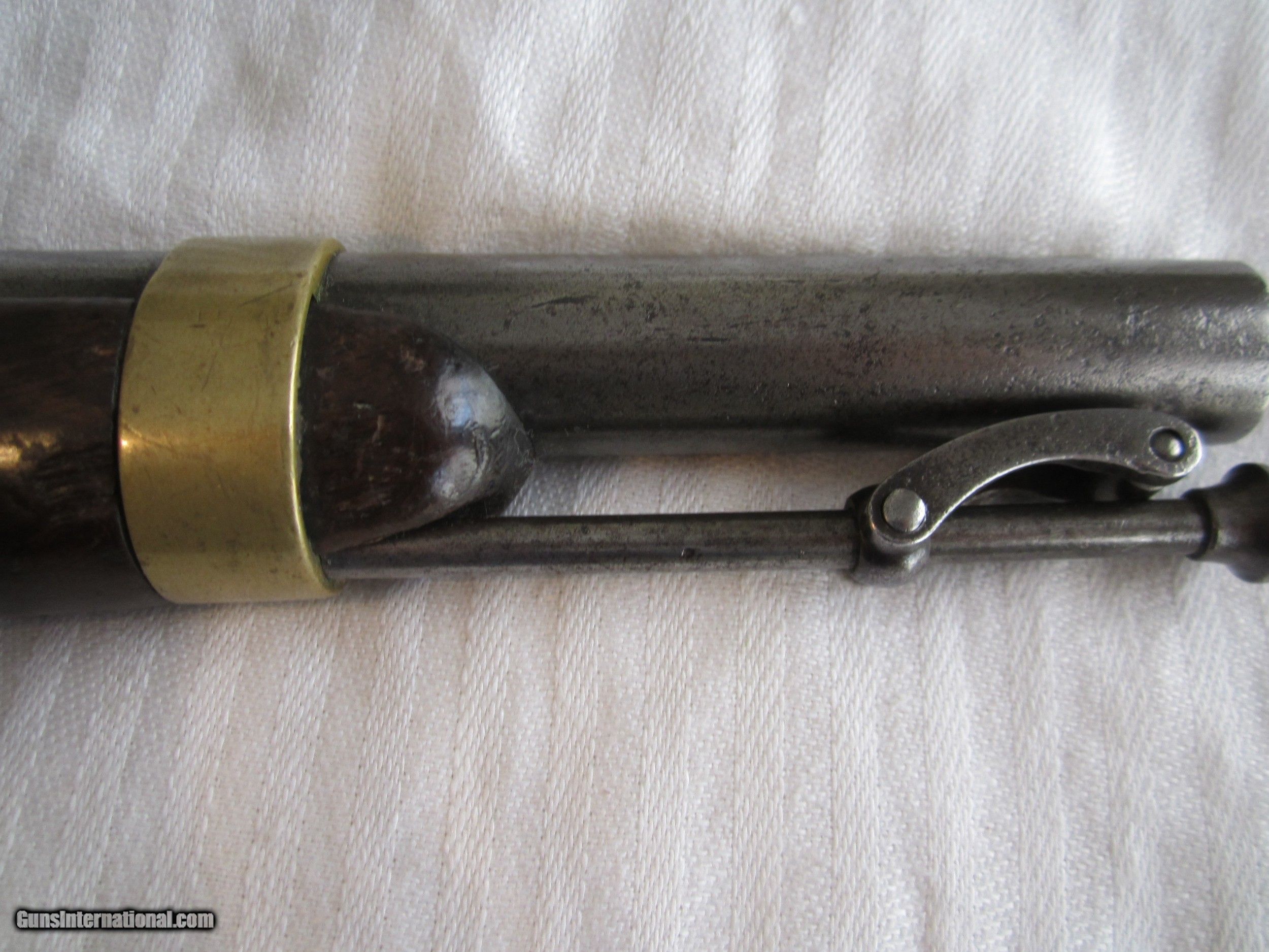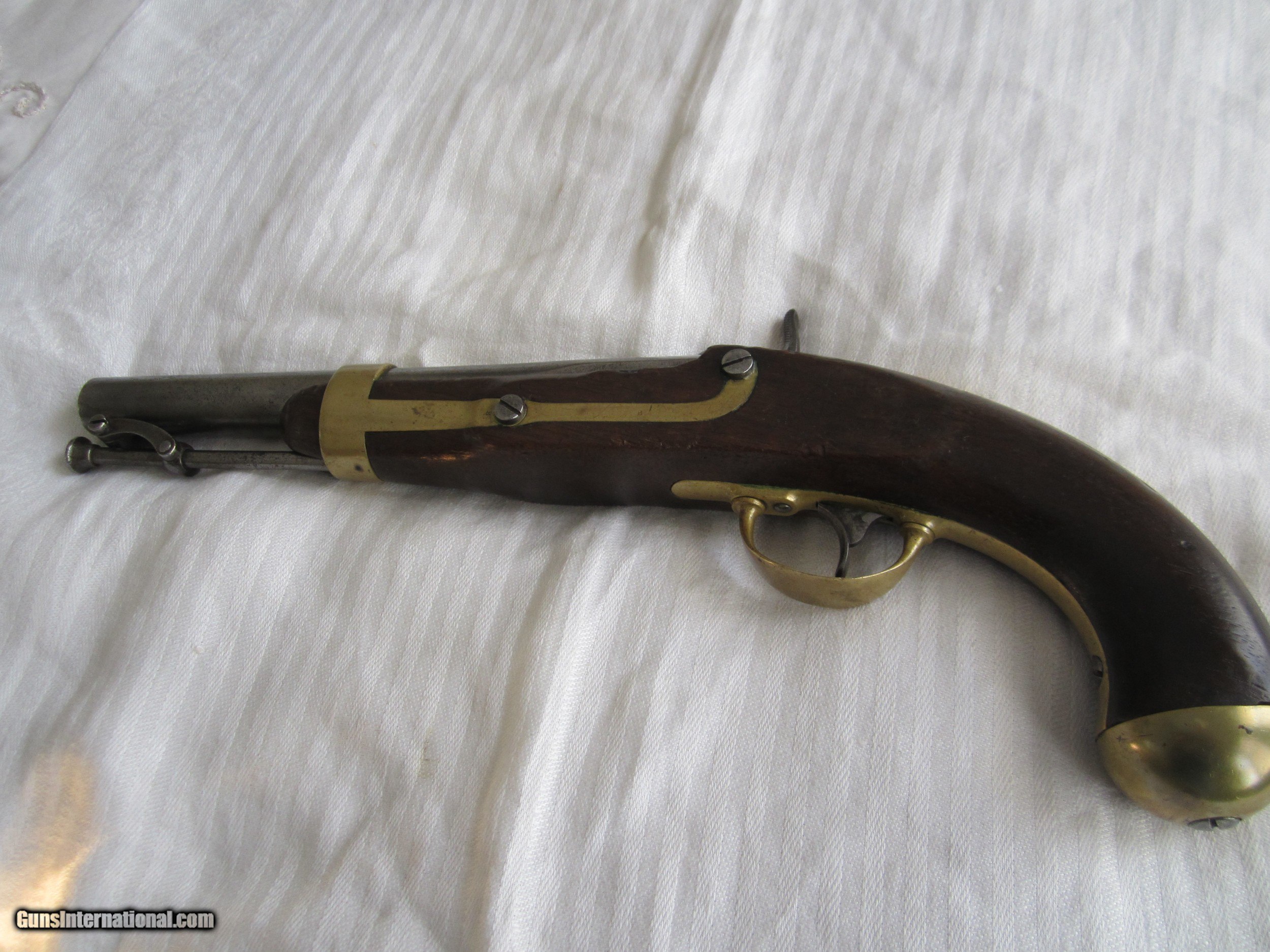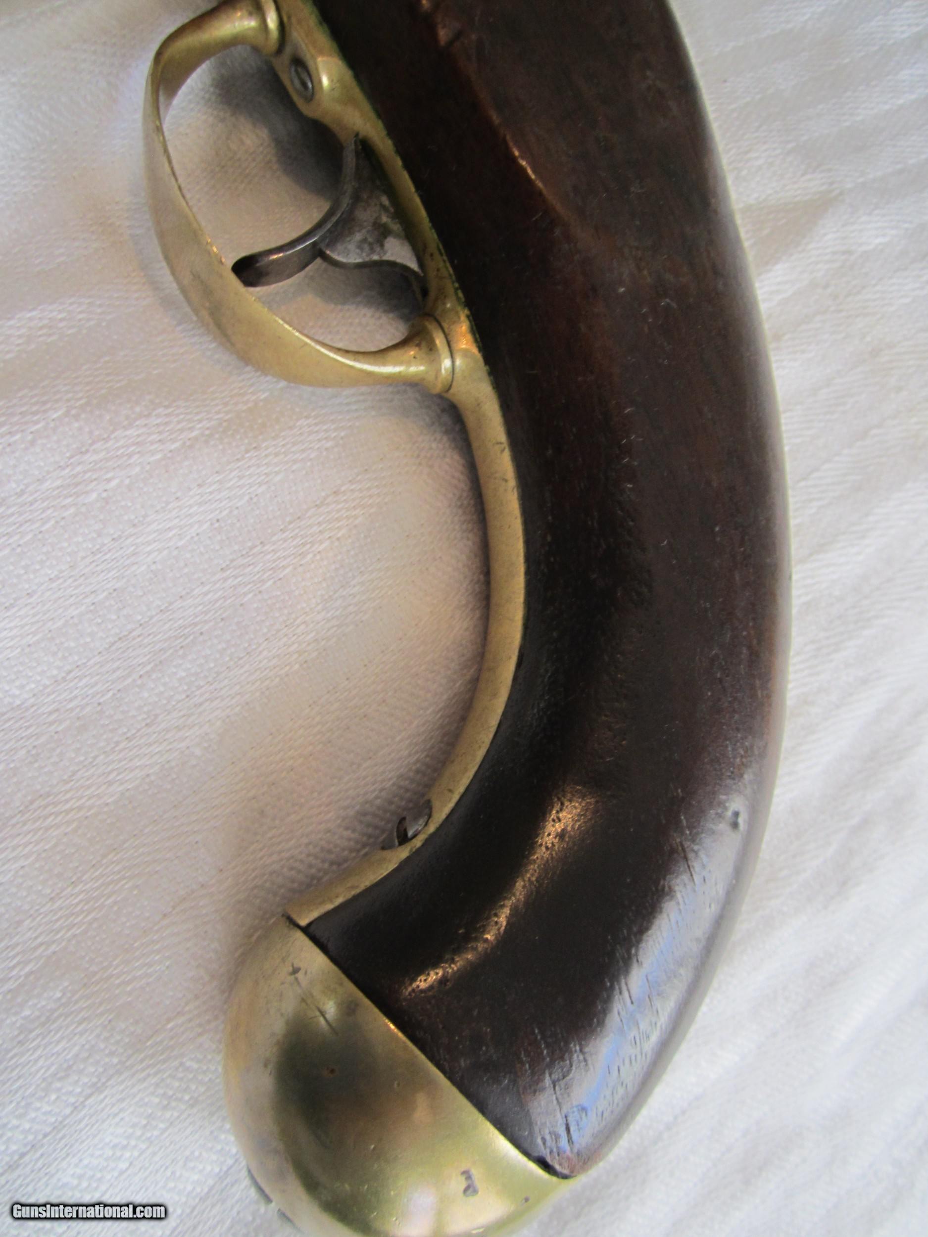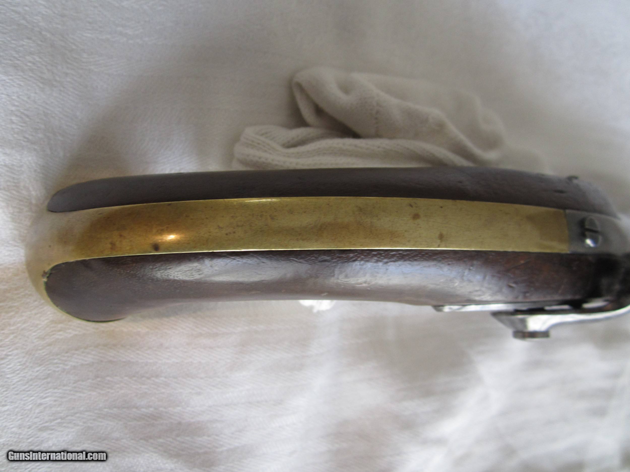 Description: A nice H. ASTON Model 1842 Military issue percussion pistol in Very Good to Fine condition. The lock is marked "Midd-tn, Conn., 1848" The barrel is marked "U.S., JCB, P". There is also a "B" on the brass trigger guard. The butt cap , back strap , and barrel strap are also brass. The action is strong and the hammer holds at full and half cock. The barrel is 8 & 1/2" long and the caliber is .58. . The wood has no splits, cracks, gouges or wood missing. A nice example of a military arm that may well have seen action in the American Civil War and the war with Mexico. There is no cartouche and no sign that there ever was one. This is an antique so no FFL is required. It may be sent directly to the proud new owner. There will be a shipping charge A NO interest payment plan is available SEE other antique and modern pistols and 100 powder flasks which make nice birthday & Xmas gifts& good investments. SOLD Antique: Yes Manufacturer: H.ASTON Model: Model 1842 Serial Number: none Caliber Info: .58 Condition: Very good/Fine Metal Condition: Very Good/Fine Wood Condition: Very Good/Fine Barrels: one Barrel Type: round Action: Percussion Triggers: one Stock: Walnut Finish: Bright Steel/Brass Sights: front & rear Manufacture Date: 1848 Engraving: no Item Location: California-San Diego |