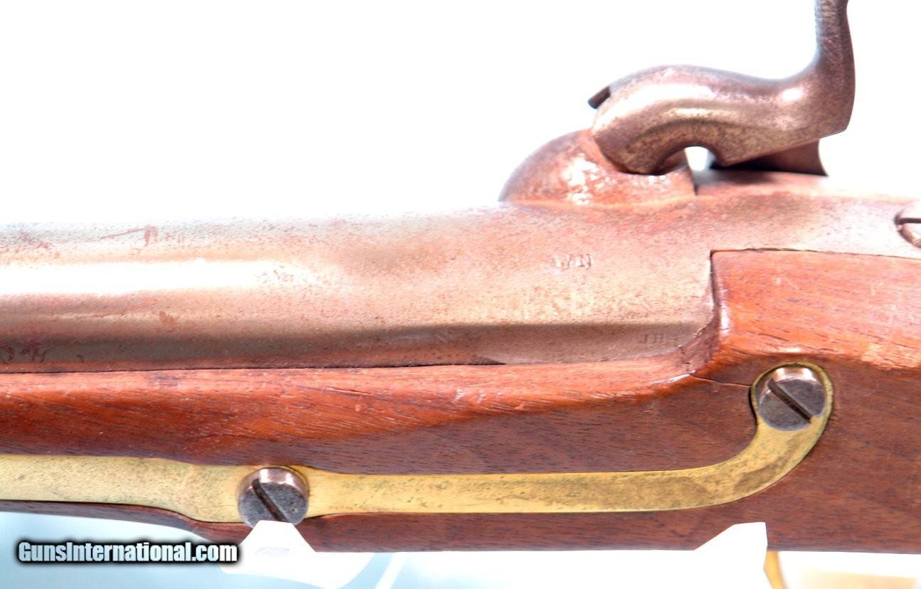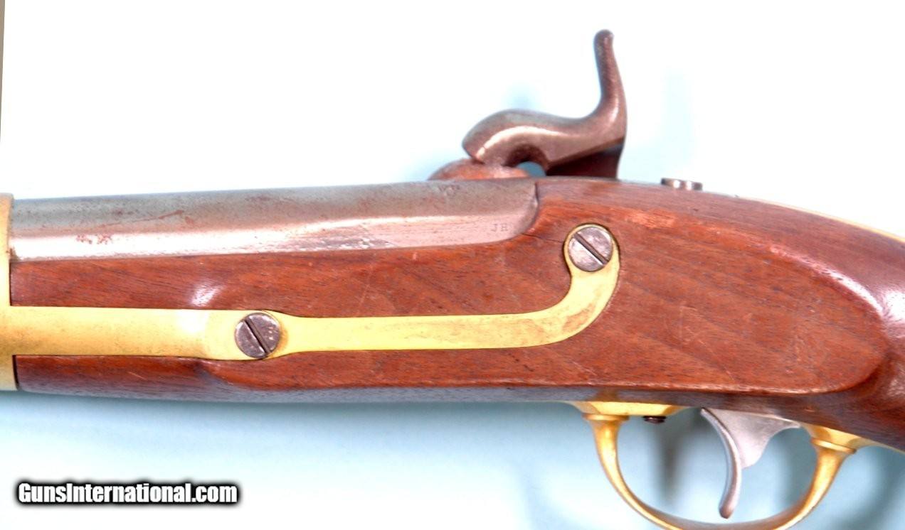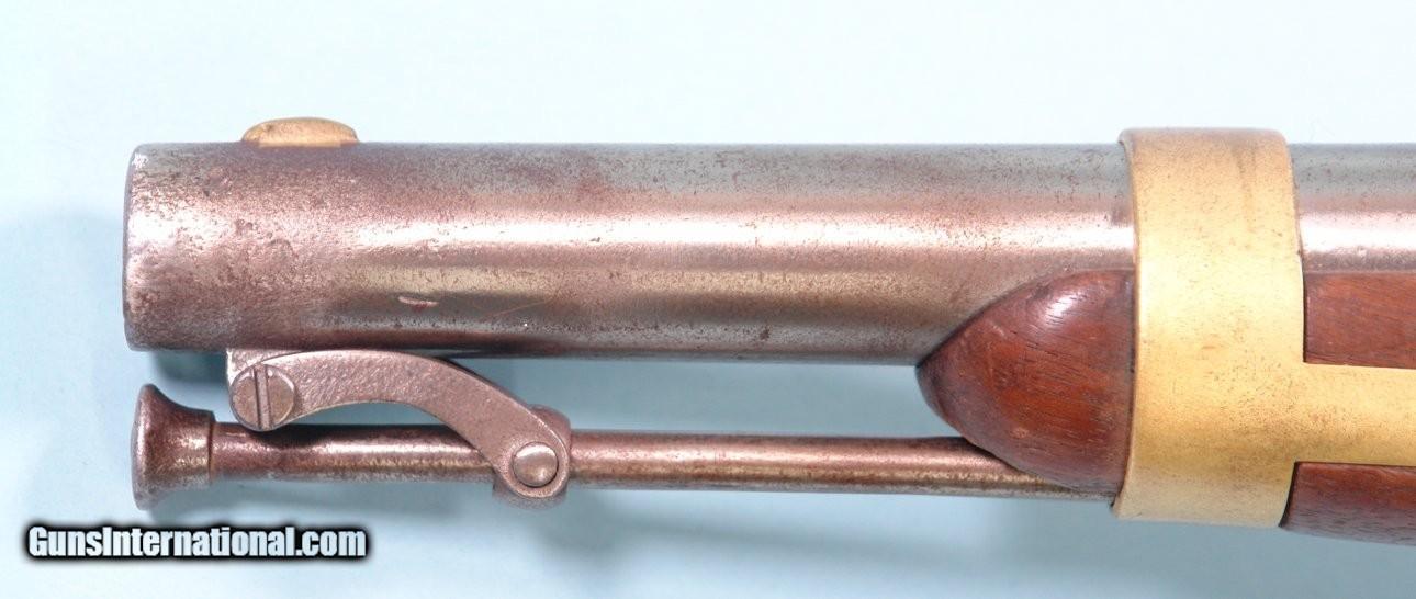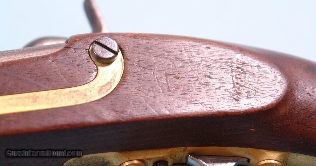 Description: H. ASTON U.S. MODEL 1842 PERCUSSION .54 CAL. SINGLE SHOT CAVALRY PISTOL DATED 1851. The standard issue pistol used before and during the Mexican War and still in use particularly in the South during the early years of the Civil War. 15” o/a with 8 ½” smoothbore barrel with “WN” Ordnance inspector’s initial stamp at left breech. All original with lock stamped “U.S./H. ASTON & CO.” and “MIDDTN/CONN./1851”. Complete with the stirrup steel ramrod original Very good with metal a light grey patina with very light salt and pepper. Stock with visible “WAT” cartouche. Old very fine hairline crack just above the butt cap but wood much above average for one of these. Lock in working order. Nipple with wear and moderate corrosion. Fair to good bore. Reasonably priced. SOLD Antique: Yes |