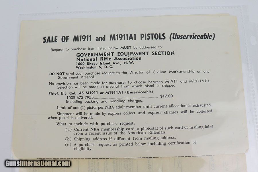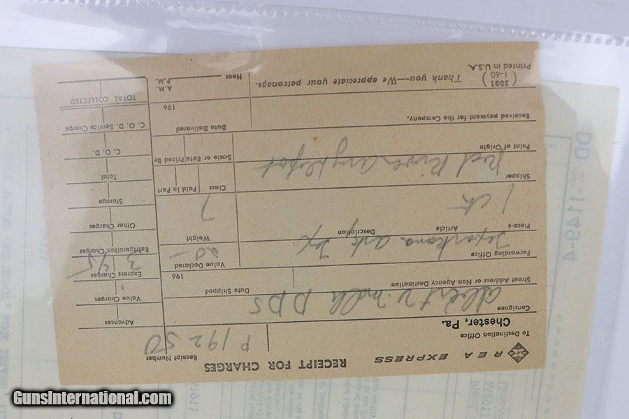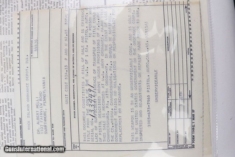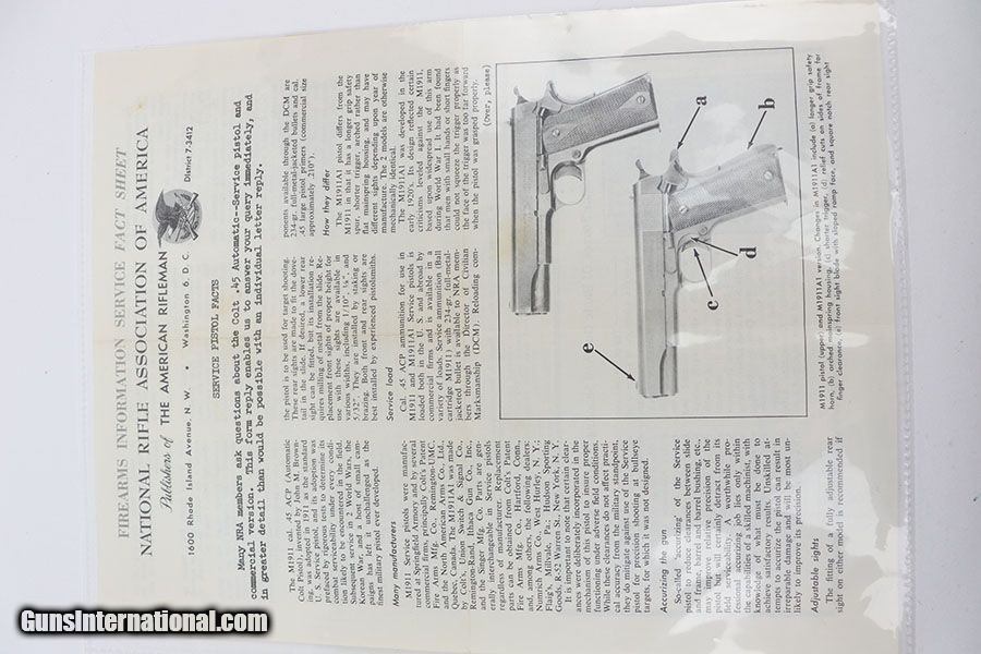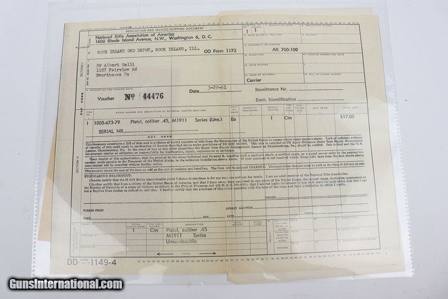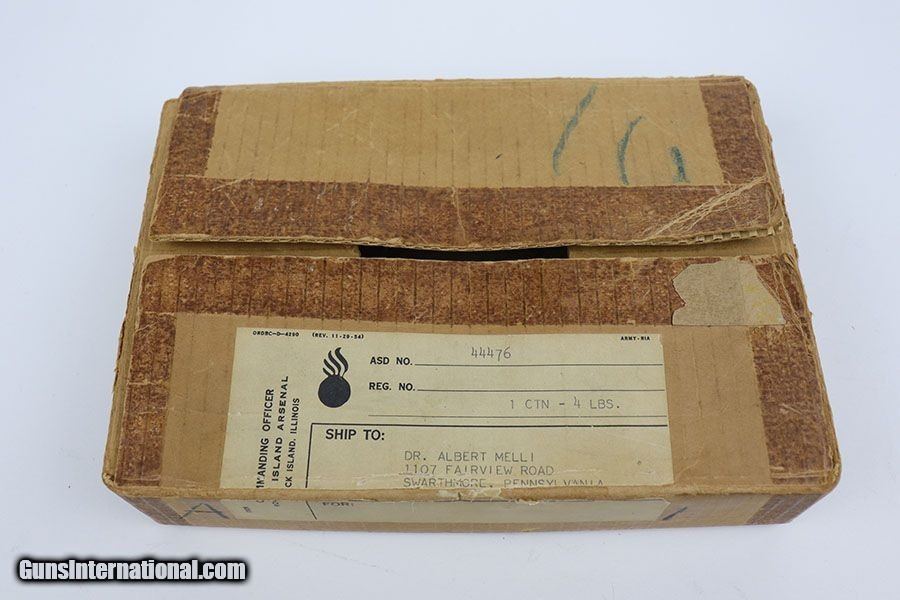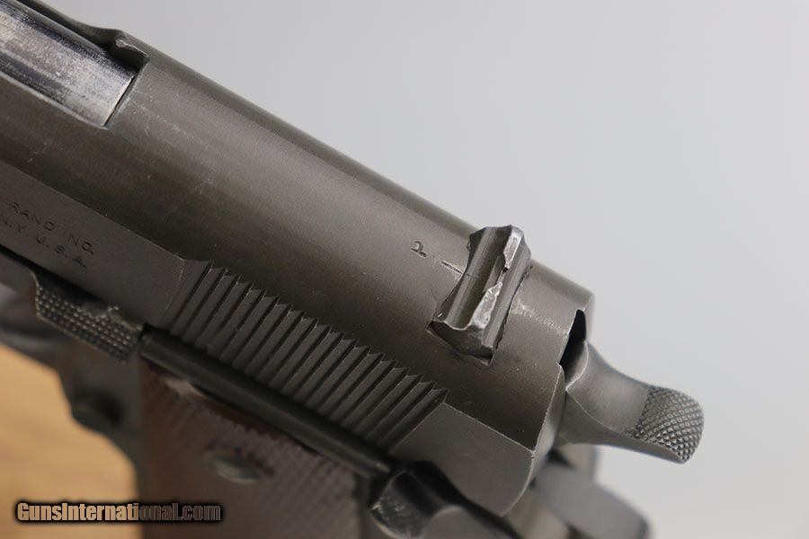 Description: This is a very interesting Remington Rand 1911A1 in the original 1960s box from the Rock Island Ordnance Depot, along with the original NRA and Rock Island Depot bills of sale. The pistol is all original and in terrific condition, with very minor finish wear on the high edges of the slide and a little more where the slide rubs against the inside of the frame. All correct inspector marks throughout. Proper HS barrel with excellent bore. Grips are excellent, too, with no major wear. 'L' marked magazine. The box and receipts have the name of the buyer on them, and state the official release of the pistol from the US Government to the buyer. There's also some of the original NRA instructions and details on the sale of these pistols to the public. SOLD Curio/Relic: Yes Handgun Caliber: .45 ACP (.45 Auto) Manufacturer: Remington Model: 1911A1 Serial Number: 1339491 Condition: 97-98% Bore Condition: 9/10 Manufacture Date: 1943 |