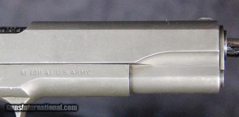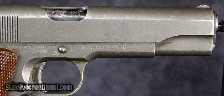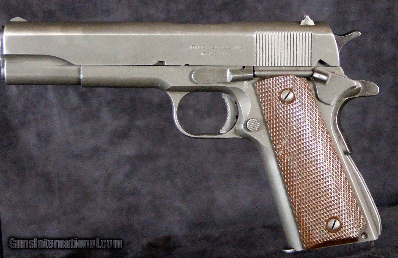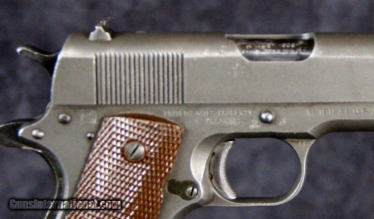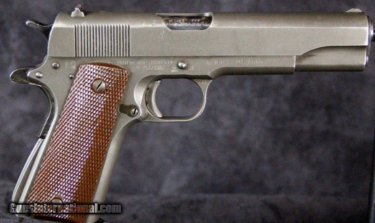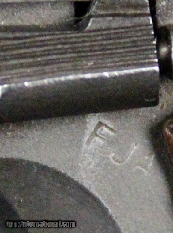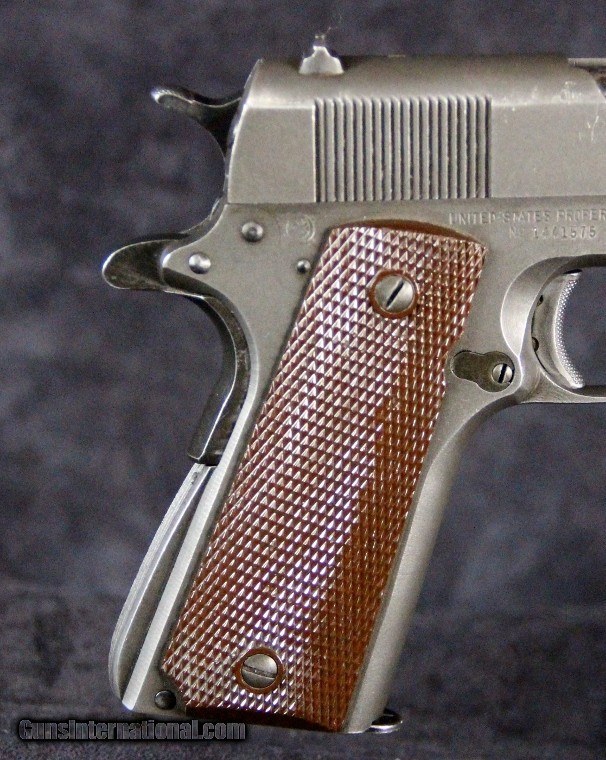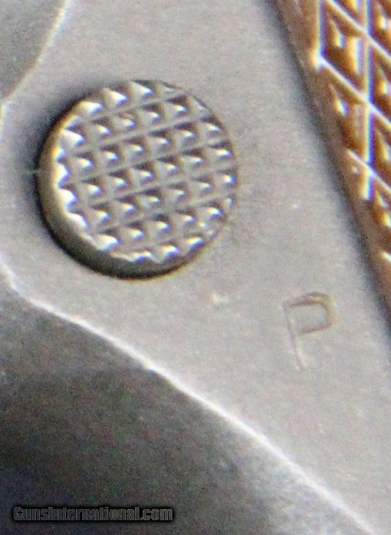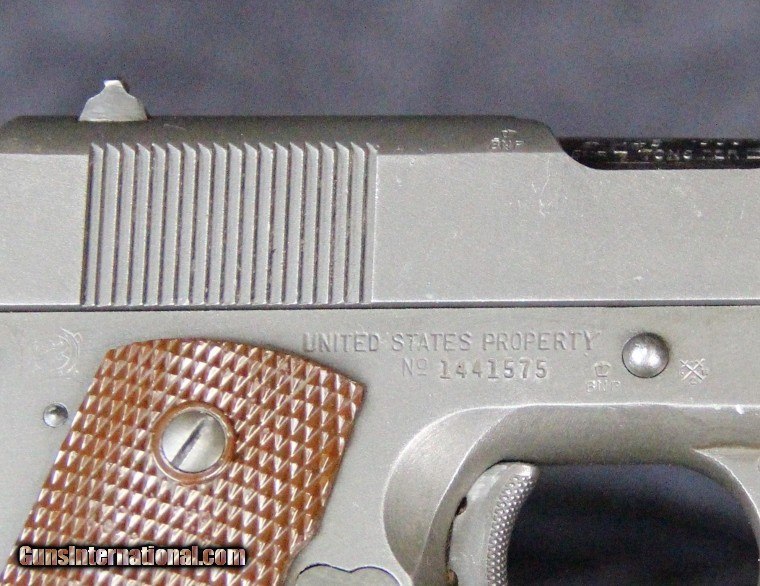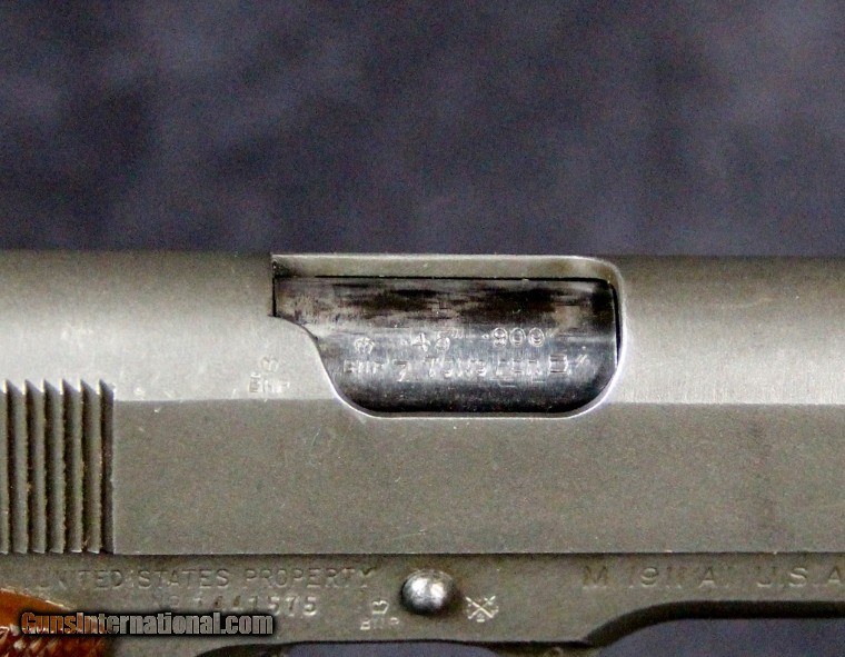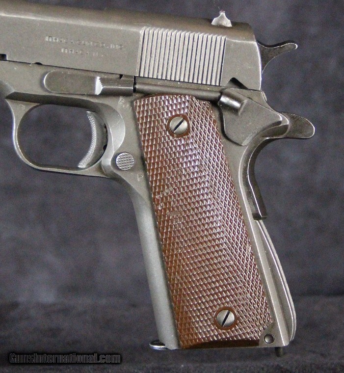 Description: .45acp, #1441575, 5 inch barrel, parkerized finish, plastic grips, British and U.S. inspector's marks, original barrel with British testing marks,circa 1943. Condition: excellent bright bore, 90% parkerized finish with use dings and scratches and wear on the high spots, excellent grips, "L" marked magazine, excellent mechanically, excellent marks. SOLD Curio/Relic: Yes |