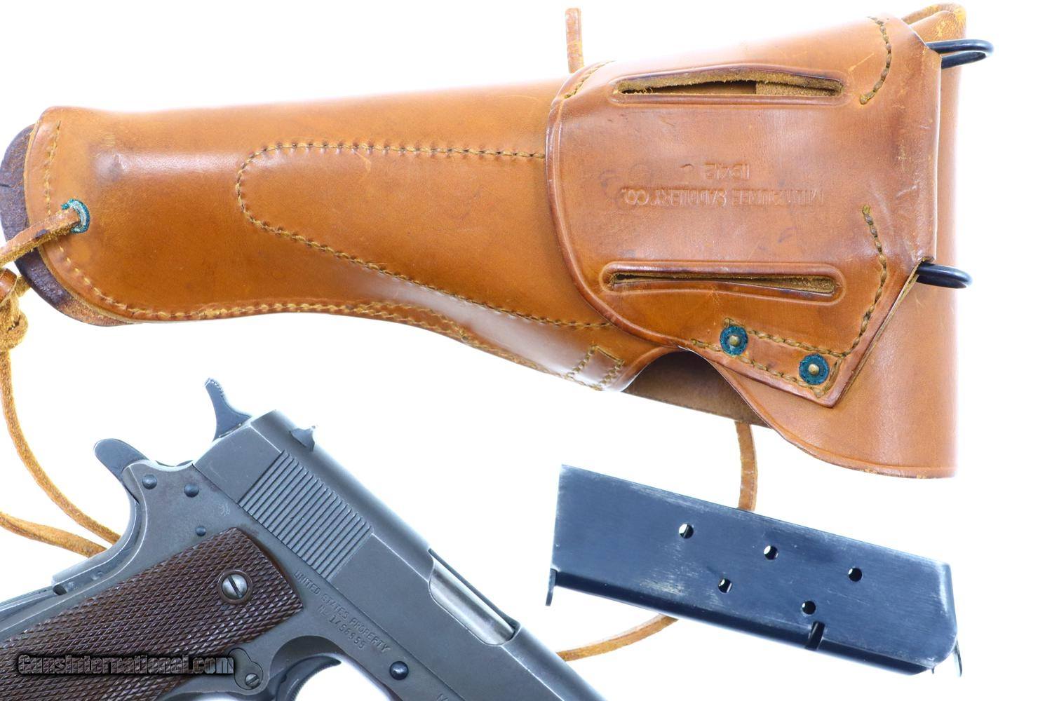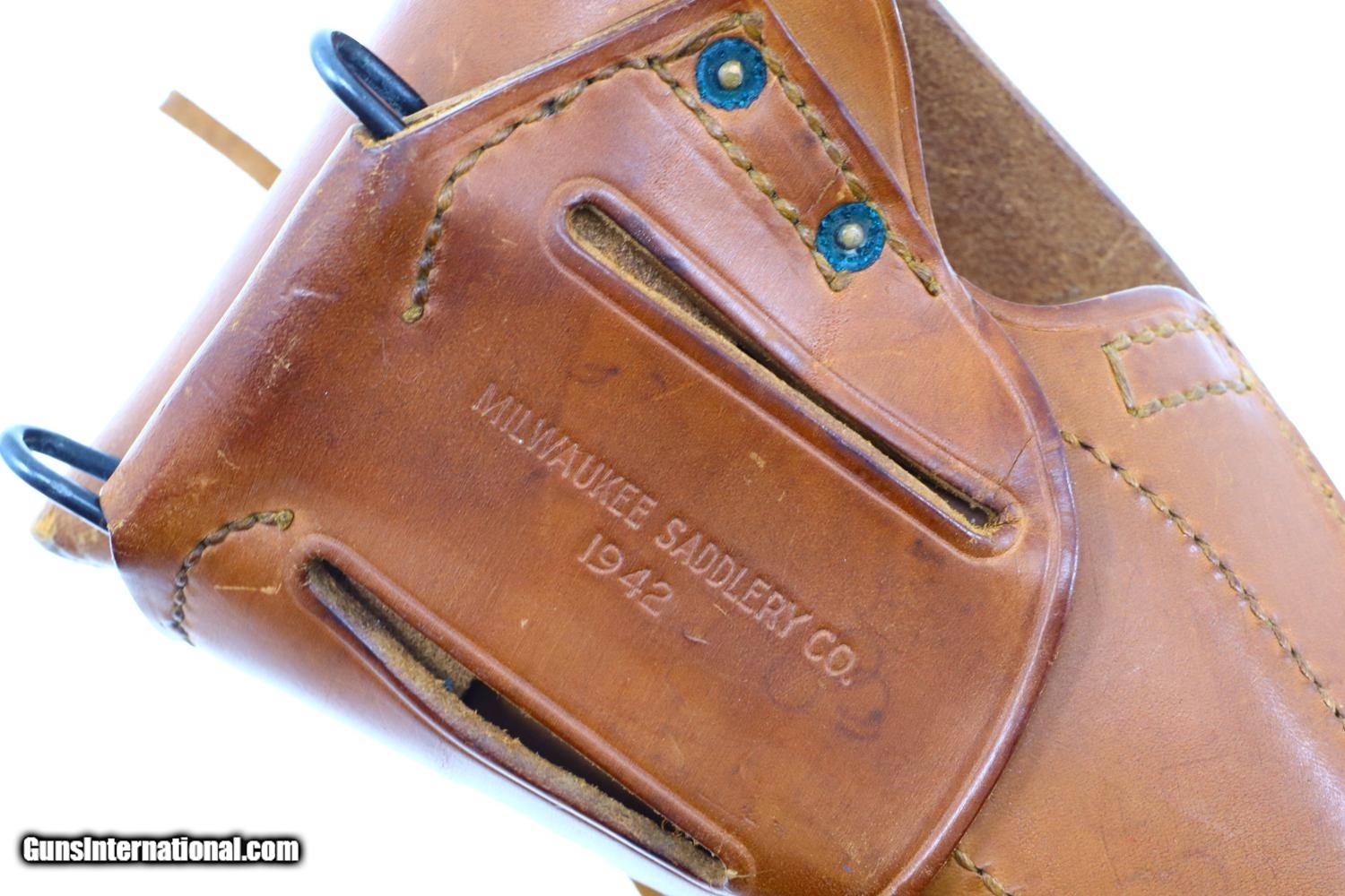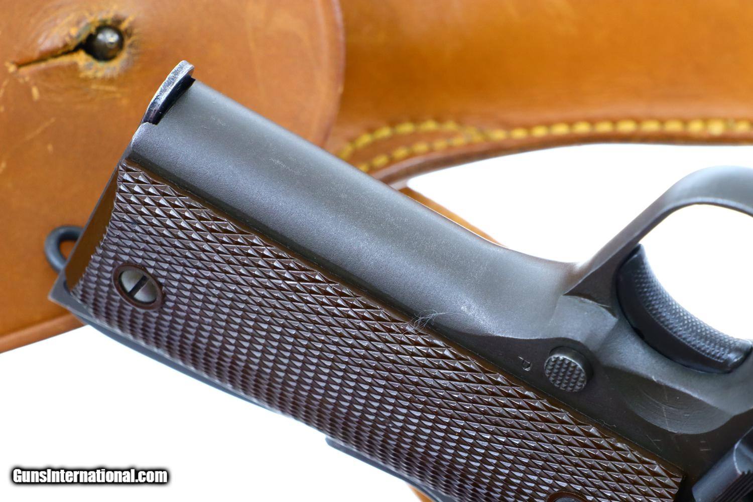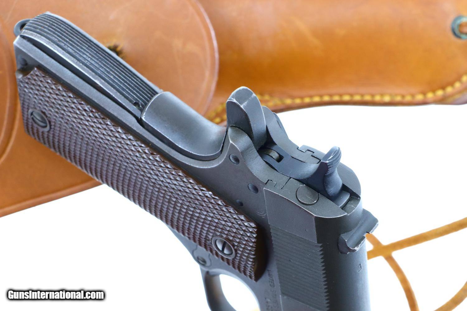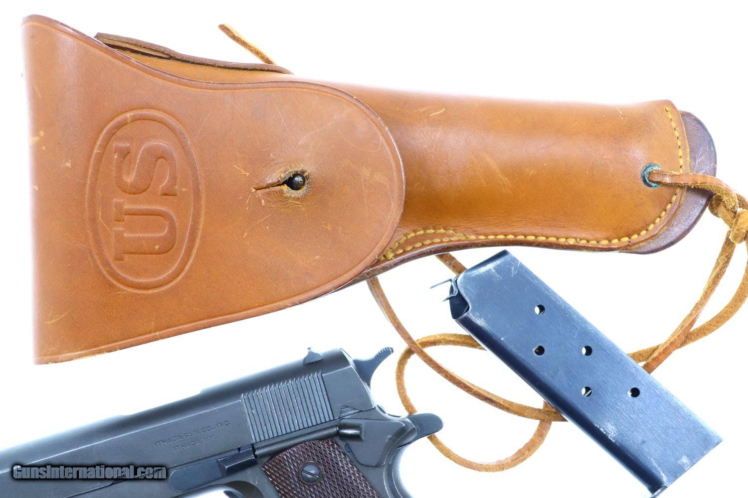 Description: Standard configuration 1911A1 manufactured by Ithaca in 1943, the left side of the slide marked with the usual two-line Ithaca address and "P" on top. The left side of the frame has the "FJA" inspection mark and "P" below the magazine release. The model designation, the SN, and U.S. Army markings on the right side of the frame. The top of the chamber has been polished and the lug is marked with an "F" and "P". It is fitted with blade and notch sights, serrated slide release, thumb safety, narrow serrated hammer, short grip safety, stamped trigger, and checkered Keyes Fiber grips. Correct blued magazine marked with an "S" on the toe. Complete with a U.S. Milwaukee Saddlery Co. "1942" dated holster. Synopsis: Attractive Ithaca 1911A1 pistol, US Military, WWII, Holster, 1456959, A-1815 Condition: Near excellent, original parkerized finish with sharp edge wear, minor thinning, and discolorations reflecting its history of service. Top of chamber polished as previously noted. Near excellent grips and magazine. Bright bore with sharp rifling. Perfect manual mechanics. Comparable condition holster. A nice WWII rig that would compliment any martial arms collection. ~~Insured shipping fee of $75; most packages shipped using FedEx 2nd Day.~~ SOLD Manufacturer: Ithaca Serial Number: 1456959 Caliber Info: .45 ACP |