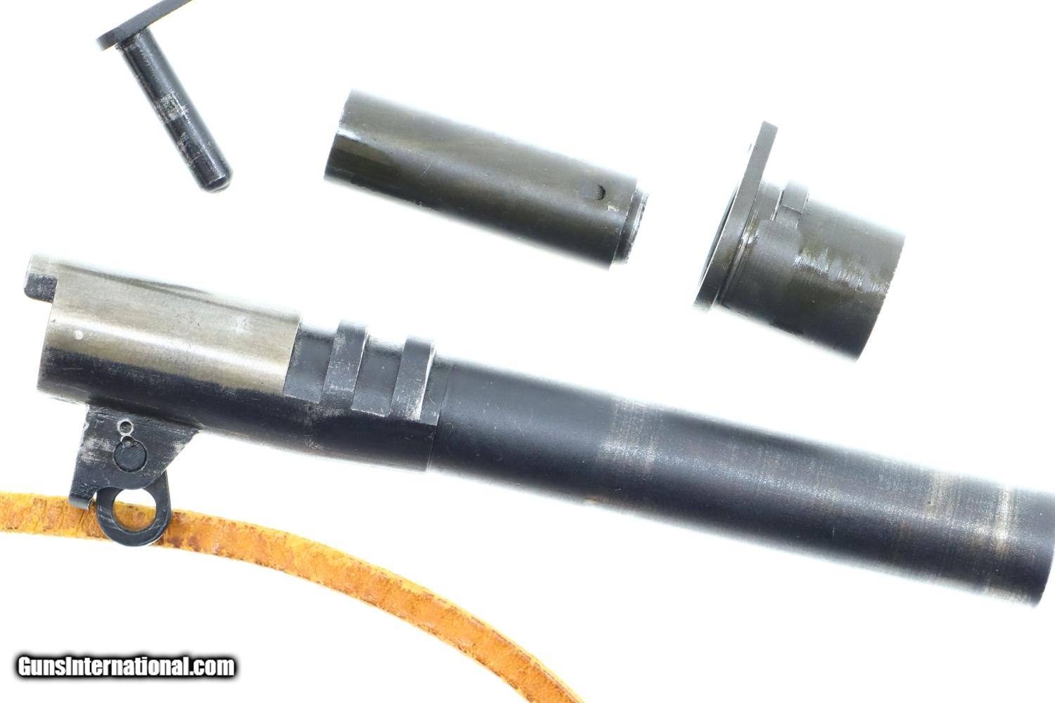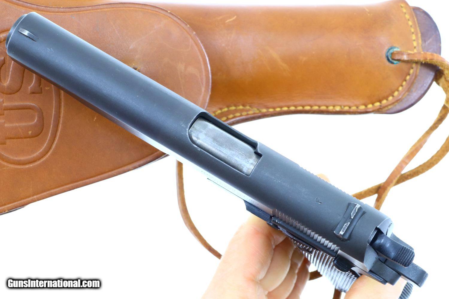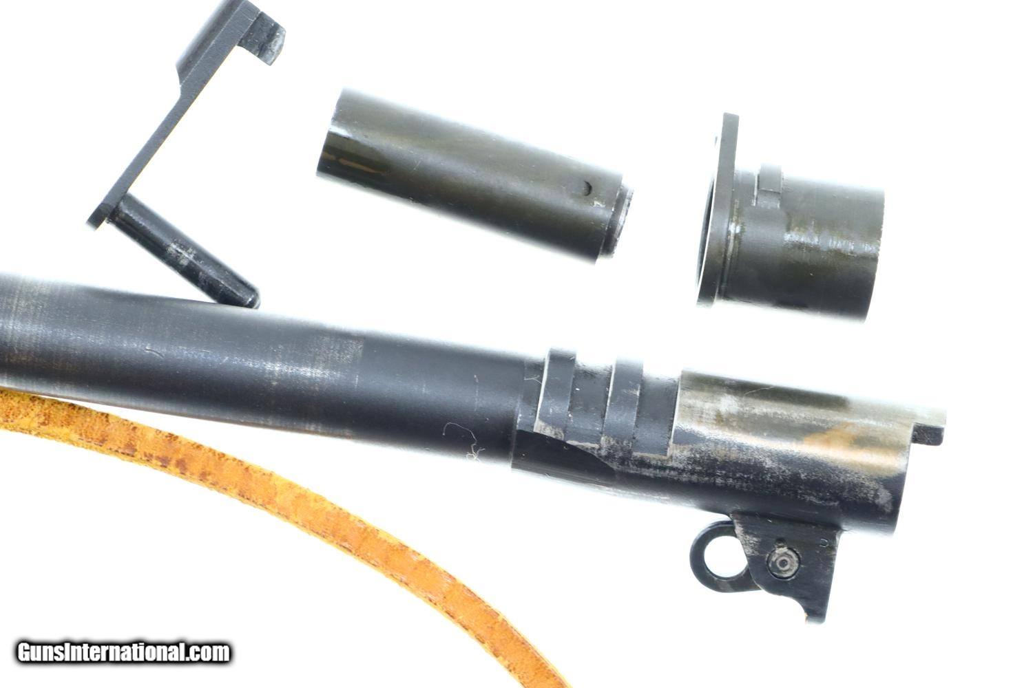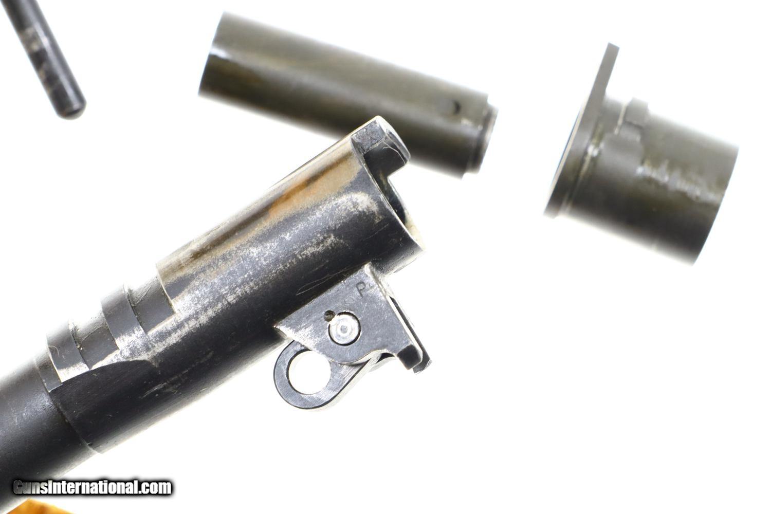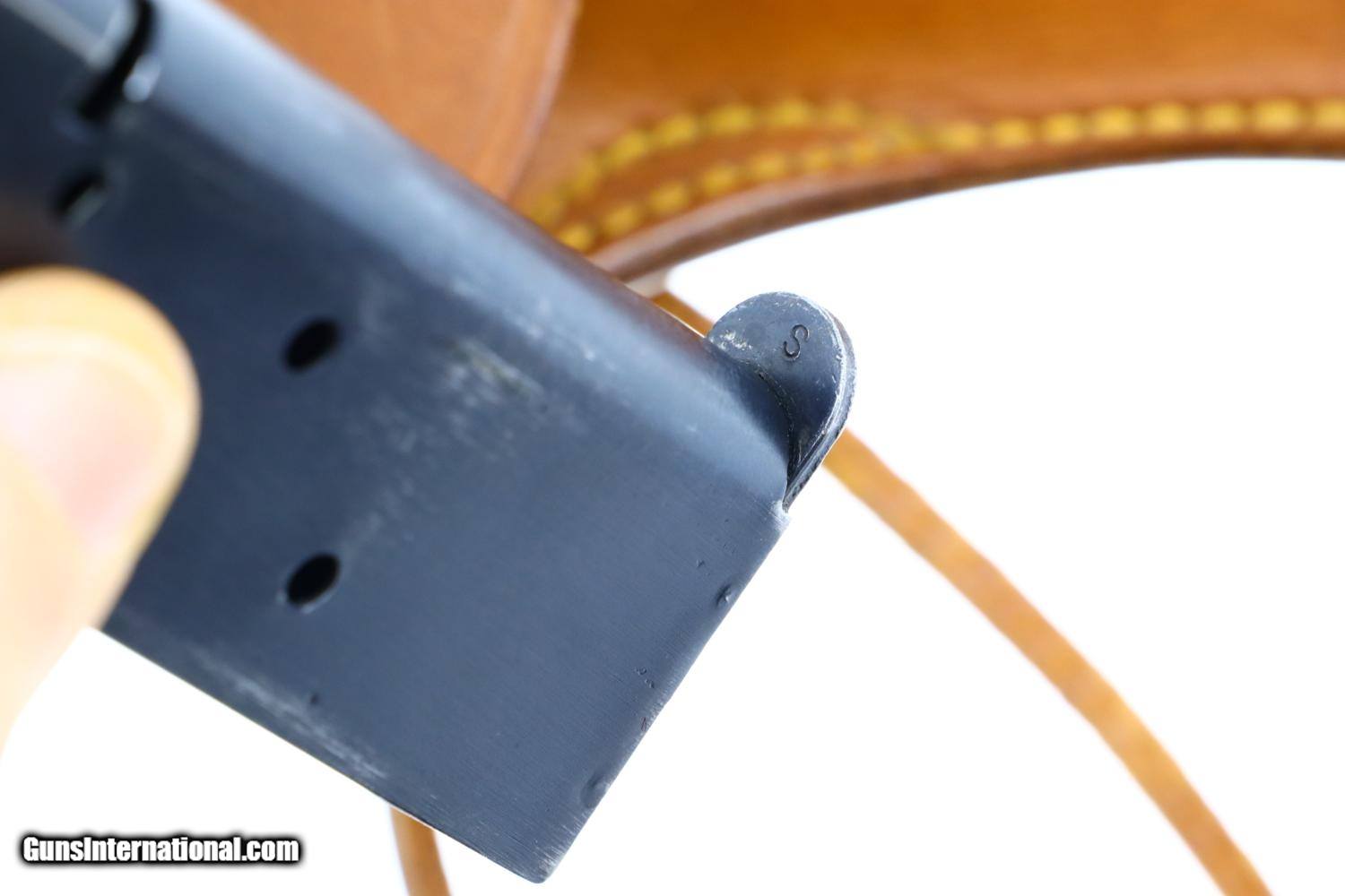 Description: Standard configuration 1911A1 manufactured by Ithaca in 1943, the left side of the slide marked with the usual two-line Ithaca address and "P" on top. The left side of the frame has the "FJA" inspection mark and "P" below the magazine release. The model designation, the SN, and U.S. Army markings on the right side of the frame. The top of the chamber has been polished and the lug is marked with an "F" and "P". It is fitted with blade and notch sights, serrated slide release, thumb safety, narrow serrated hammer, short grip safety, stamped trigger, and checkered Keyes Fiber grips. Correct blued magazine marked with an "S" on the toe. Complete with a U.S. Milwaukee Saddlery Co. "1942" dated holster. Synopsis: Attractive Ithaca 1911A1 pistol, US Military, WWII, Holster, 1456959, A-1815 Condition: Near excellent, original parkerized finish with sharp edge wear, minor thinning, and discolorations reflecting its history of service. Top of chamber polished as previously noted. Near excellent grips and magazine. Bright bore with sharp rifling. Perfect manual mechanics. Comparable condition holster. A nice WWII rig that would compliment any martial arms collection. ~~Insured shipping fee of $75; most packages shipped using FedEx 2nd Day.~~ SOLD Manufacturer: Ithaca Serial Number: 1456959 Caliber Info: .45 ACP |