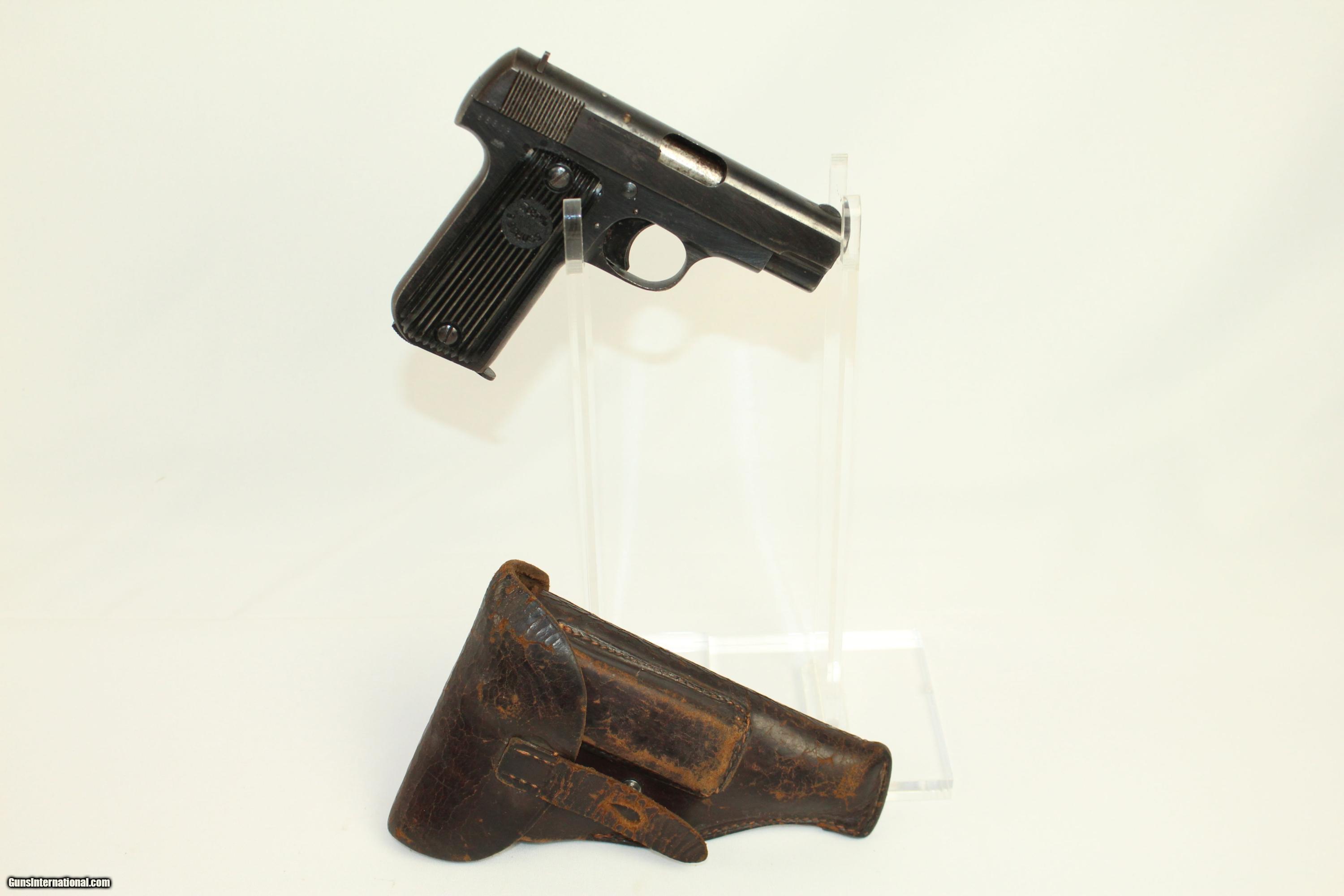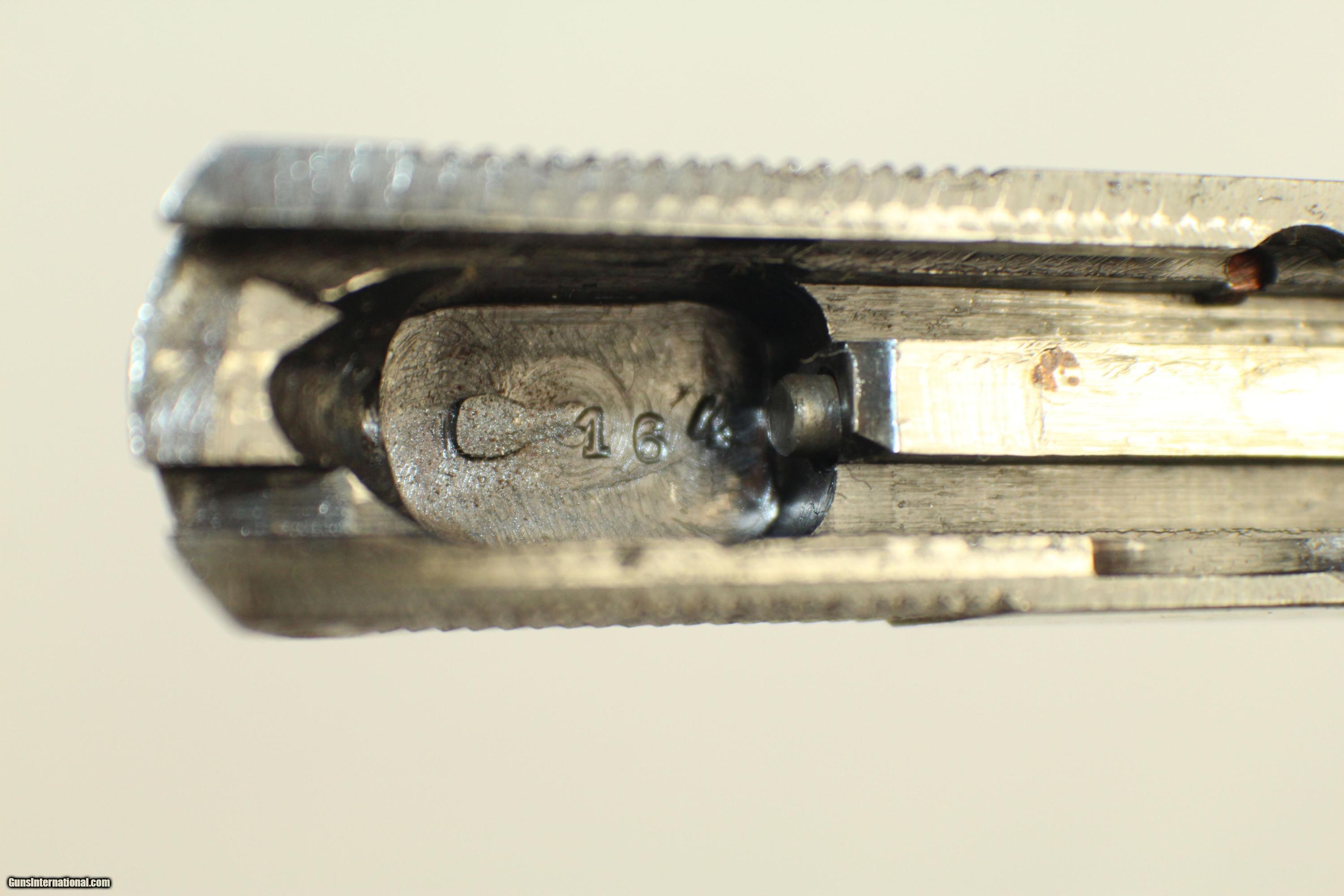 Description: RARE NAZI German WWII French Occ. UNIQUE 17 Pistol French Made for Germans During Occupation Here we present a Nazi German Marked French Occupation “UNIQUE” Model 17 Pistol, made circa 1940 in Hendaye, France. This pistol was based on the Spanish “Ruby” pistol that had been in production since about 1914. Basque José Uria began the company in 1923, and it became known as Manufacture d’Armes des Pyrennes Francaises in 1928 when it was moved to Hendaye. When the Third Reich invaded France, they seized weapons making facilities, and this one was no exception. These pistols would go on to see use with the Wermacht. This example comes with an original holster, which has fared well. The exterior of the pistol is marked with the serial number on the rear right portion of the frame. The interior of the pistol is marked using assembly numbers. This pistol features an internal hammer. “COURT 9 COUPS” translates to “short 9 count” in French, for the pistol’s 9 round capacity of 7.65mm Browning ammunition. The grips also note “7.65/9 Schuss (shot)”. Disassembly is performed by simply ejecting the magazine, locking the slide back, then unthreading the barrel and taking the slide off to the fore. This specimen is in fine condition. The original blue finish is about 85%. The markings are clear and legible. The numbers match. The grips are in fine condition. The bore is sharp and shiny. The action is strong. This firearm is classified as a Curio & Relic. Barrel is 3-1/8 inches in length. Caliber: .32 ACP (7.65x17mm Browning) The bore is in fine condition and the action is strong. Overall condition as seen in photos. Here is your chance to own a Third Reich pistol from France during the Occupation. Very Fast. Very Safe. FREE SHIPPING. Will need to be sent to your local FFL. Guaranteed AUTHENTIC & Includes CERTIFICATE OF AUTHENTICITY. ancestryguns $1350 #21940 SOLD Curio/Relic: Yes |