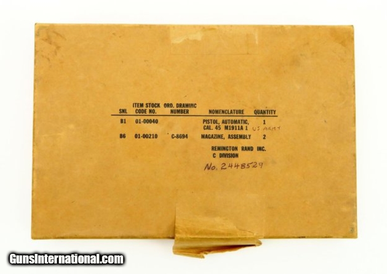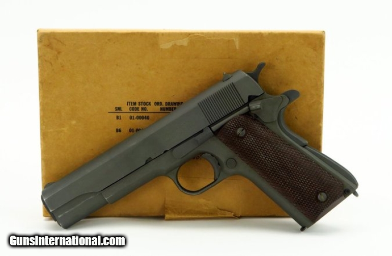 Description: Remington Rand 1911A1 .45 ACP caliber pistol. Mint condition WWII Remington Rand. Gun is mint in the original box. Not much more to say about this very fine boxed pistol. SOLD |