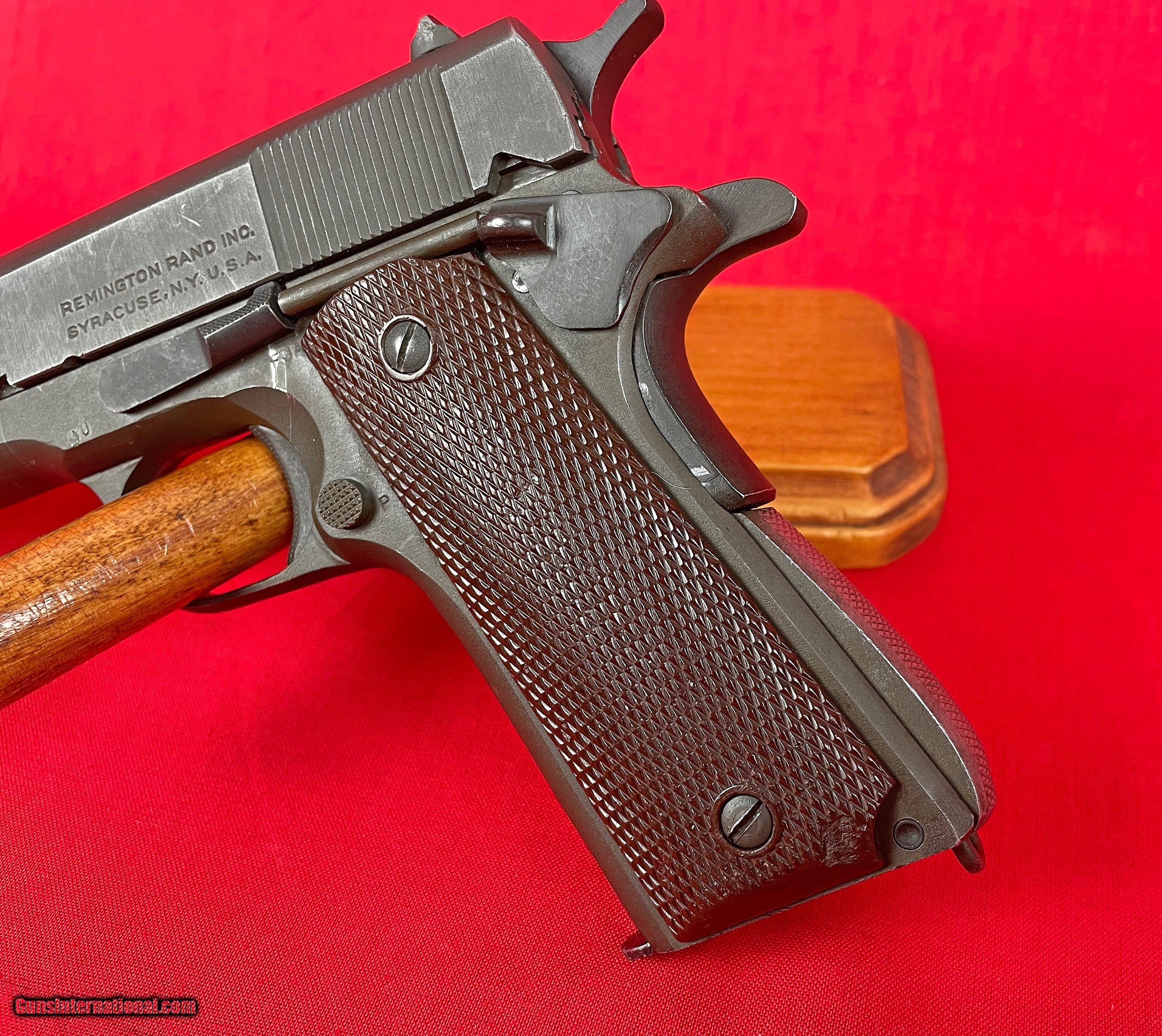 Description: Remington Rand Model 1911A1 Caliber 45 ACP Made in 1943 Part of the first contract run for Remington Rand Made in 1943 Type 2 slide marking Checkered mainspring housing Original condition, not arsenal reworked/refinished All correct proofs Also has factory Remington Rand inspector proof initials "AU" on frame above triggerguard High Standard contract barrel which is also correct and most common barrel 1943-1945 Holster is very good and supple with some cracking to flap Stamping is faded but reads Milwaukee Saddlery Co. and is dated 1944 Ships to FFL or C&R All firearms should be checked by a gunsmith Trades considered Call or text Paul at 601-397-8054 Please see all my listings SOLD Curio/Relic: Yes Handgun Caliber: .45 ACP (.45 Auto) |