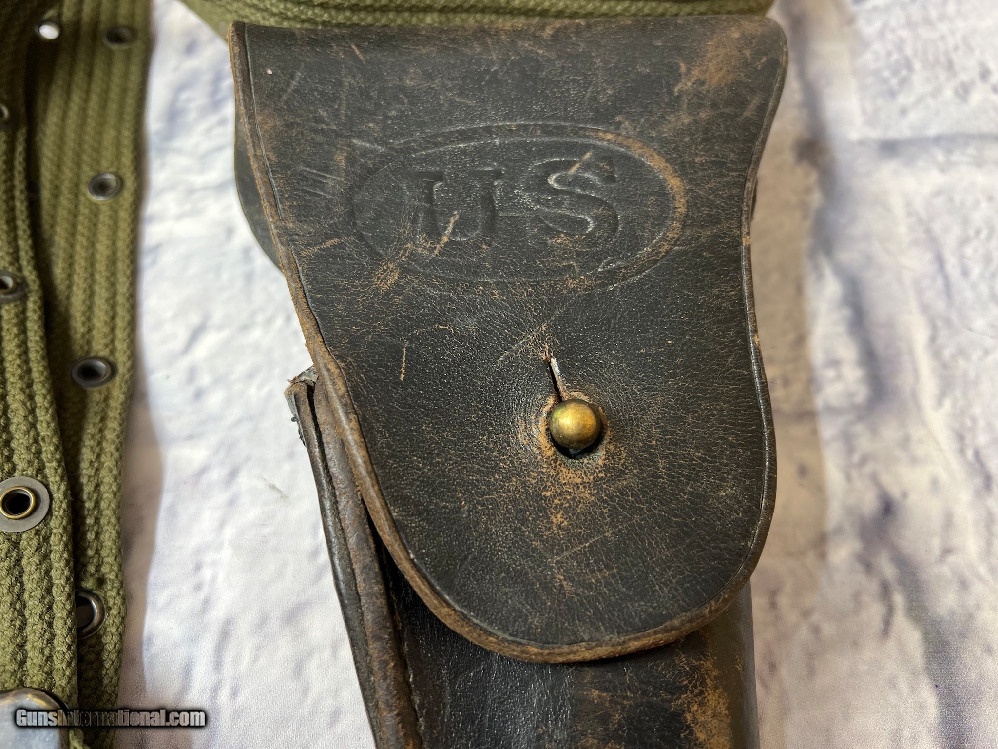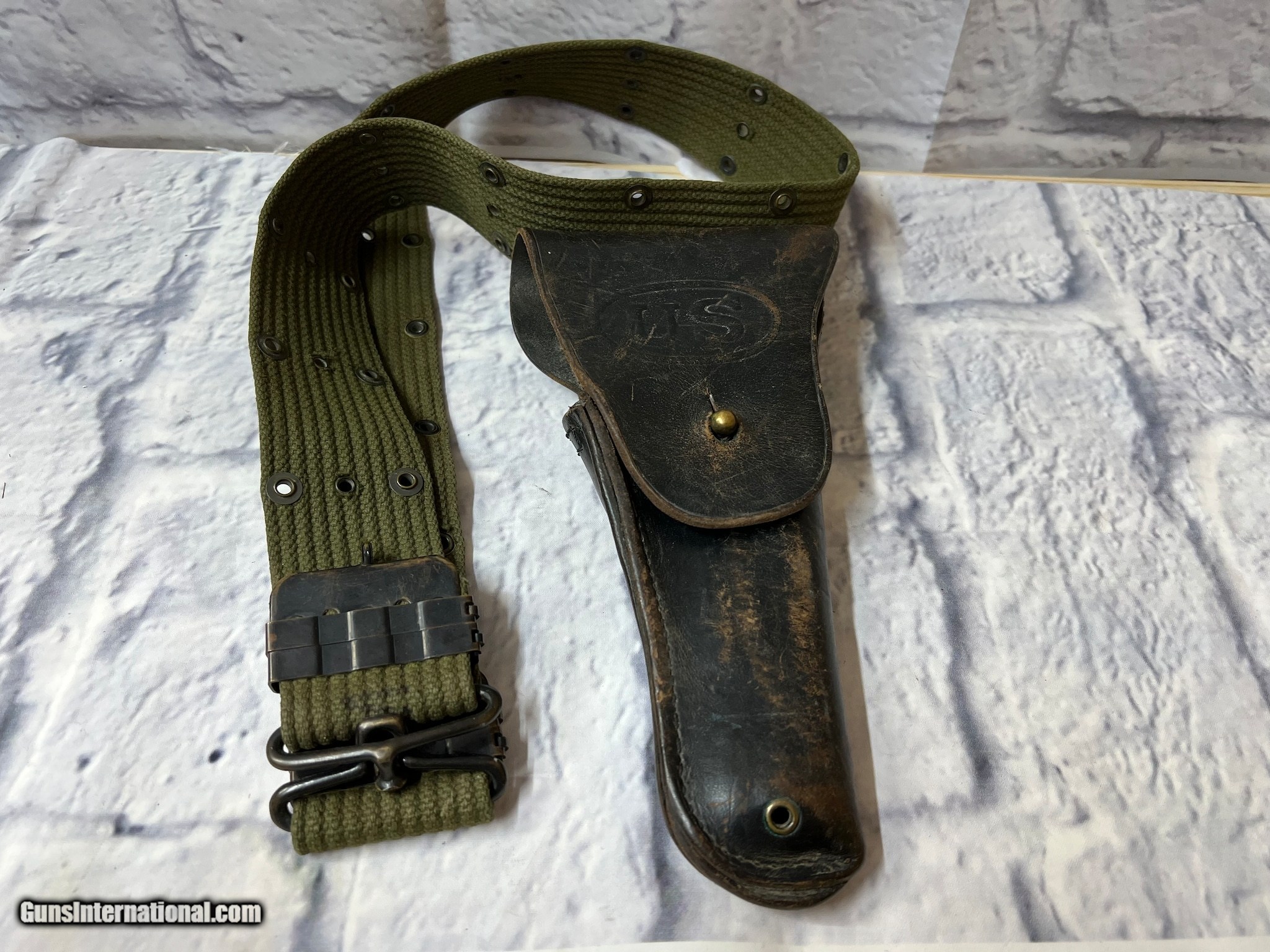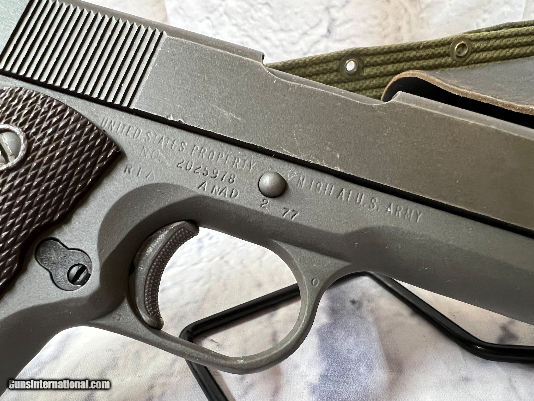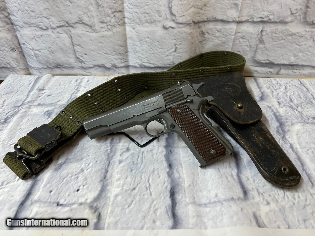 Description: Guns Listing ID: 870990 Used, Parkerized Remington Rand U.S. Army M1911A1. Frame is 1919, slide is 1926 or after. Comes with one mag, a CMP case, and the U.S. Army WW2 military issue belt and holster. Does have slide wear. But still in very good condition. SOLD Manufacturer: REMINGTON RAND Model: M1911 A1 U.S. ARMY Caliber Info: .45 ACP Condition: Used - Non-Certified Barrels: 5 BARREL Finish: GREEN |