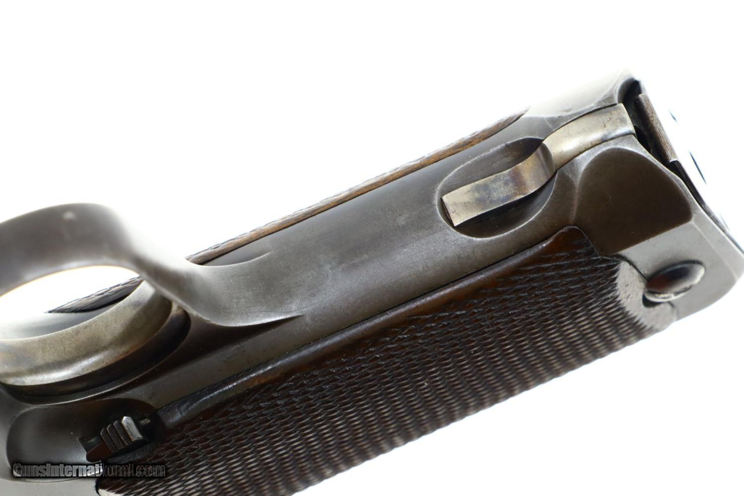 Description: Standard configuration Savage 1907 pistol in .45 ACP made by Savage to compete against the Colt. Production limited to 288 pistols. After the testing, the guns were reworked and sold commercially. Part of the refinish included removing most of the slide legend, leaving only “ CAL .45”. In this case, all parts matched to #80 except the sight bar #66, right grip panel #89, left grip is unnumbered, and the magazine #140. Synopsis: A holy grail for anyone interested in US military pistol development, one of 300 manufactured, this example a rework with an original finish magazine. Condition: VG rework with matte blue generally faded. Exposed barrel hood polished bright. Faded case colors on trigger and magazine release. Comparable condition dark oiled grips with blunted checkering as photographed. VG-Exc. original finish magazine. Bright bore with sharp rifling. Perfect manual mechanics. An extremely interesting and historic Savage for less than half of what you would expect to pay for a comparable, original pistol. ~~Insured shipping fee of $155; most packages shipped using FedEx 2nd Day.~~ SOLD Curio/Relic: Yes Manufacturer: Savage Serial Number: 80 Caliber Info: .45 ACP |