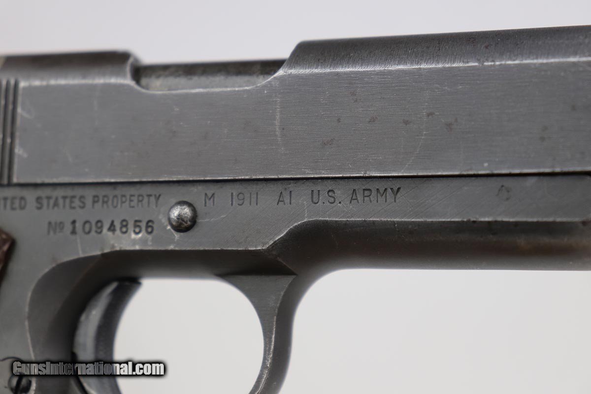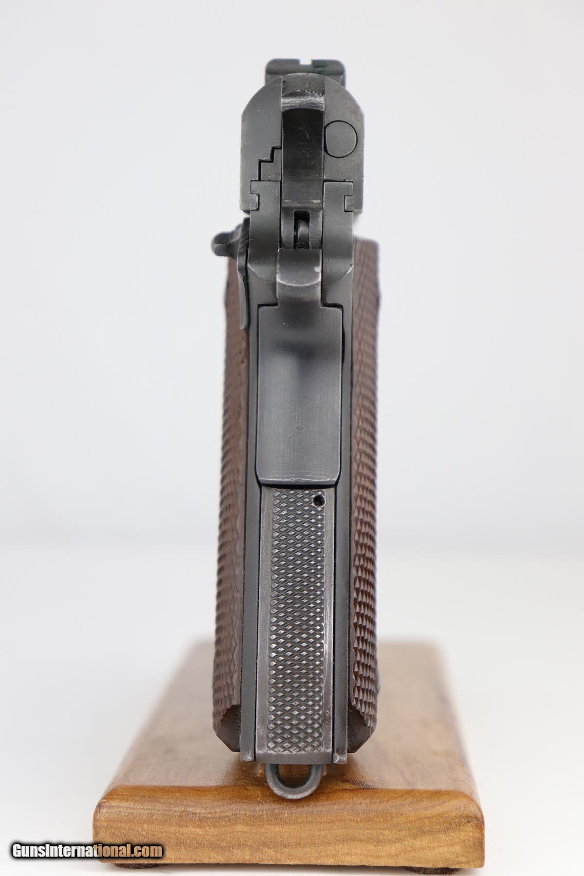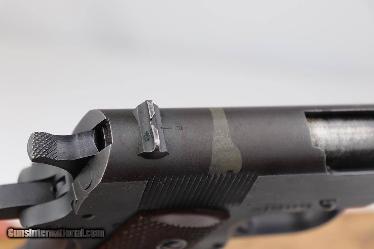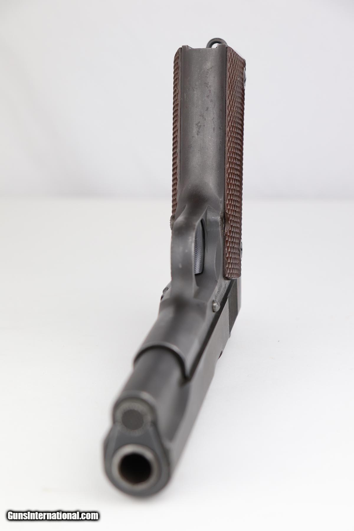 Description: This is a rare Union Switch & Signal made 1911A1 from 1943 in very good, original condition. The serial dates this pistol to October of that year, which is very late in the production period, and part of the final shipment of these pistols. It is all original and correct with about 92-93% dulite finish remaining. The slide is very nice overall but there are two areas along the top that show finish loss and appear as if some type of liquid got on the slide. Otherwise, there is standard edge and high point thinning. Proper proof marks include P on slide and RCD inspector proof on frame. Concentric circles on the barrel bushing. HS marked barrel. 'R' marked magazine. Excellent grips. Unfortunately the bore on this one wasn't well cared for, as there is notable freckling throughout. ___________________ The Union Switch & Signal company of Swissvale Pennsylvania, primarily made railroad signaling equipment but received a contract on May 5, 1942 for the manufacture of M1911A1 pistols. The first pistols were accepted by Ordnance inspectors in January 1943, but the company received word that their contract would be canceled. Within a month U.S.&S. had signed a contract to supply carbine parts. On March 8, 1943 the company was officially notified that their contract had been cut back from 200,000 pistols to 30,000 pistols. However on June 26th, when the contract was nearly complete, and many of the workers had been transferred to Carbine operations, the company received a letter of intent to purchase an additional 25,000 pistols. The last of the pistols was shipped on November 27, 1943. 55,000 Union Switch and Signal pistols were delivered serial numbered from 1041405 to 1096404. U.S.&S. pistols are the second rarest of the M1911A1s (55,000 produced), only the Singer is rarer (500 produced). None of the Union Switch & Signal 1911A1s have the crossed cannons ordnance stamp. We are told these were issued to the Army Air Corps during the war. SOLD Curio/Relic: Yes Manufacturer: Union Switch & Signal Model: 1911A1 Serial Number: 1094856 Caliber Info: .45ACP Bore: 5/10 Condition: 92-93% Manufacture Date: 1943 |