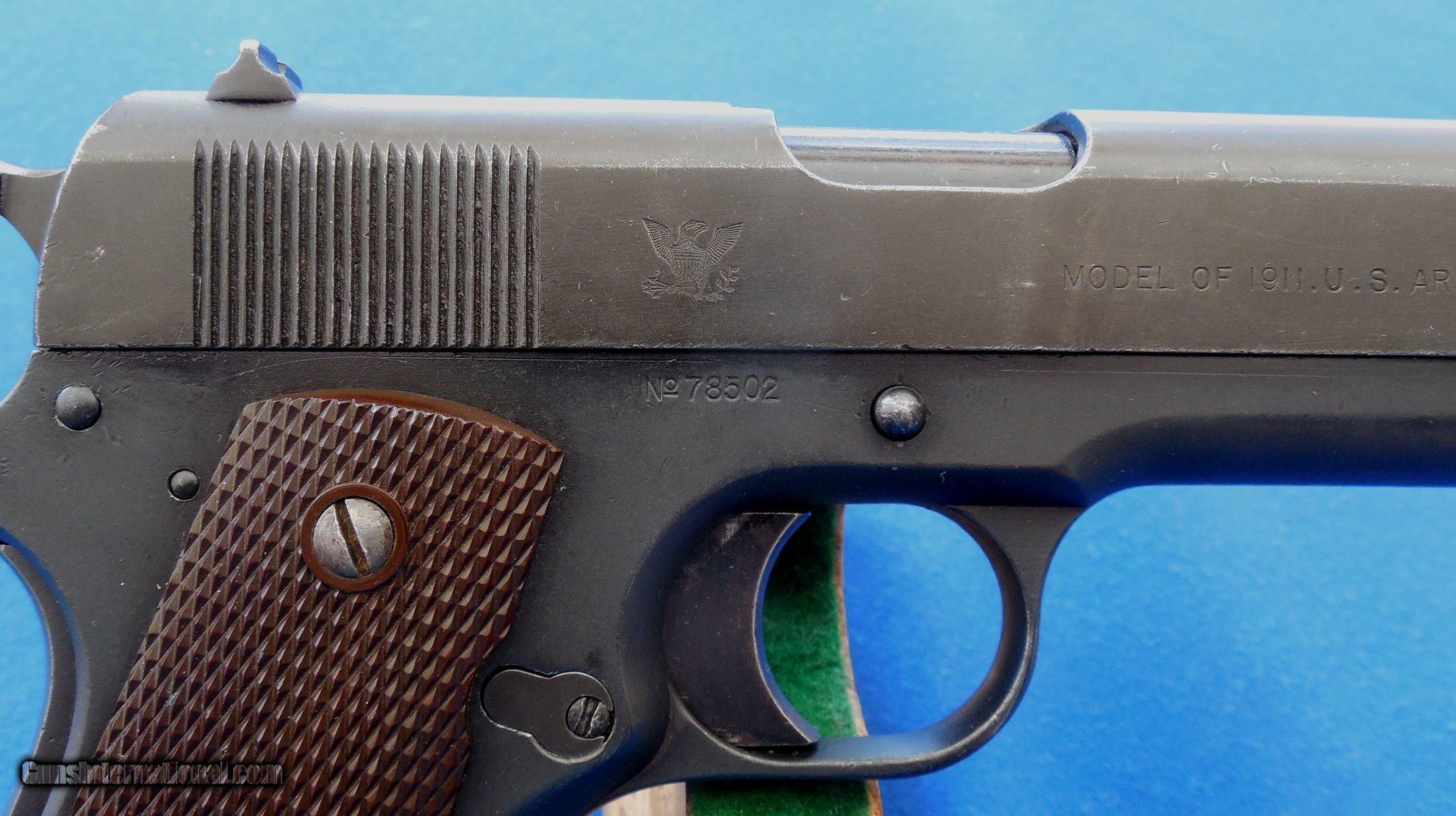 Description: Sold on Layaway / Springfield Armory Model 1911 Semi Auto Pistol. serial # 78502, cal. 45 A.C.P., has a 5” barrel with a very good bore with S over P post WWI replacement barrel. The metal surfaces appear to be refinished retaining about 90%+ finish with rear grip strap graying, standard markings on slide and frame are crisp and sharp. The right side of the slide displays a nice sharp Eagle stamp. The hammer, grip safety, mainspring housing, thumb safety, slide stop, magazine catch and barrel bushing appear to be Colt manufactured. Mainspring housing is fitted with lanyard ring. The plastic grips are type 10 replacements made by Keyes Fiber Co. having reinforcement rings around the screw holes. Pistol comes with one 7 round General Shaver type 3 magazine that’s stamped on base with the letter G. This piece will look great in any military collection. The overall condition as described and photographed is very good – very good plus. Inv. : # 1-1366 SOLD Curio/Relic: Yes |