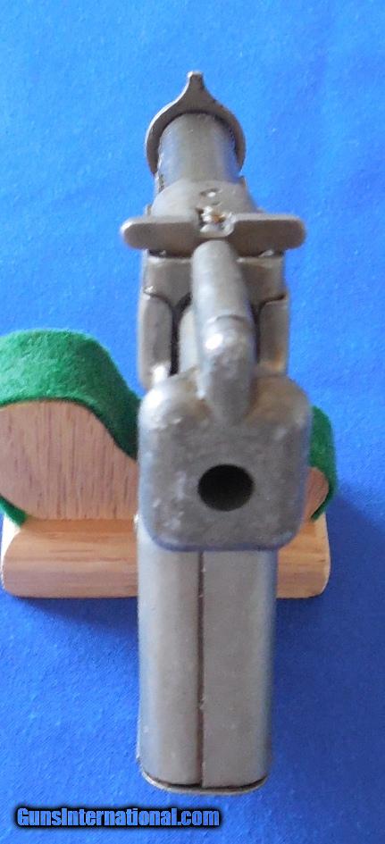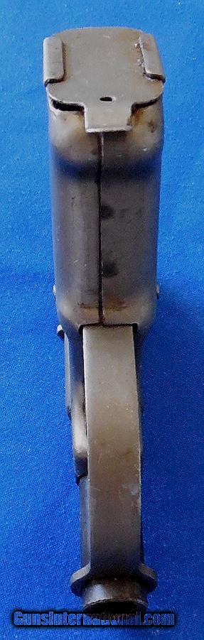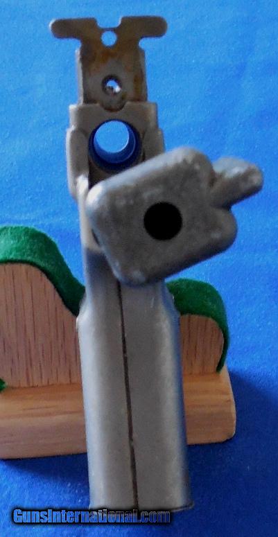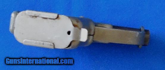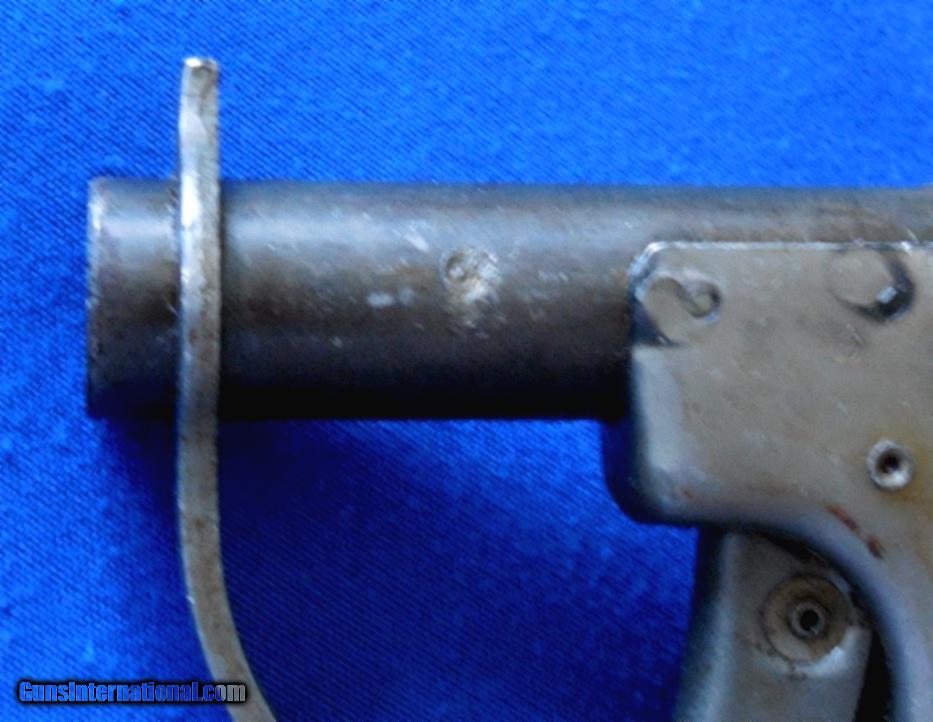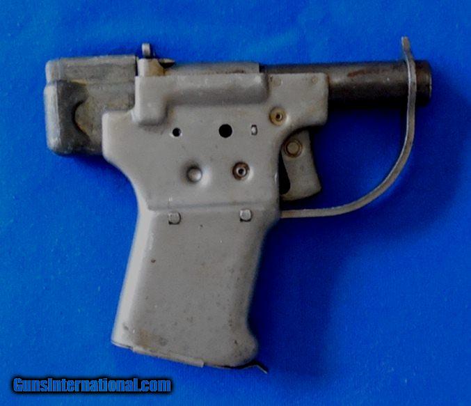 Description: U.S. Liberator FP-45 Pistol, manufactured by the Guide Lamp Division of General Motors, serial # None, cal. 45 ACP, 4” barrel with an excellent bore, the barrel is dark gray with some very light oxidation along with some peppery pitting near the muzzle but nothing I would consider drastic or alarming and what I believe is a German proofmark on the side of the barrel. The grind mark along the top of the barrel is smooth with several welding imperfections as is the case on these Liberators. The metal surfaces retain about 96% original finish that exhibits some scattered light oxidation stains, scratches and other light handling marks but again nothing drastic or alarming,. The cocking knob is in near excellent condition with smooth surfaces, minor casting flaws and a few light handling marks. This is a 3rd model pistol with four oil holes, its mechanically functional and the floorplate is present. No clandestine or military collection is complete without a “Flare Projector-45 Pistol". The overall condition of this scarce pistol is very good plus - excellent condition. (C&R) Inv.: # 1-1297 SOLD Curio/Relic: Yes |