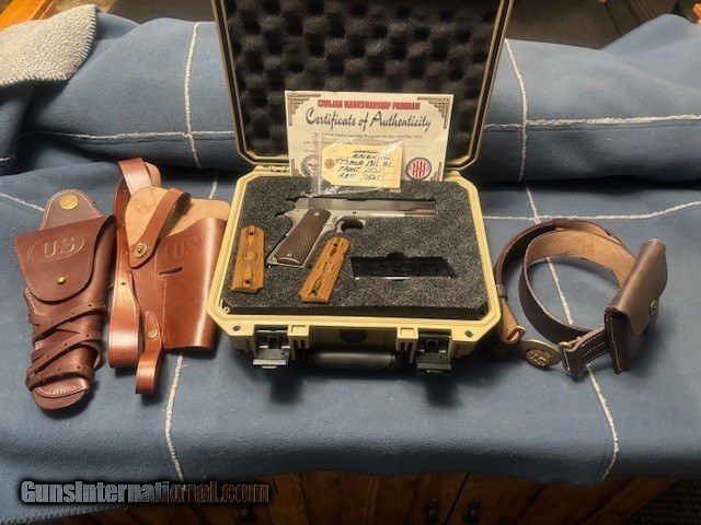 Description: This is a rare piece of American History Ithaca 1911 a1 in 45acp. Both frame and slide are Ithaca, 1944, not a miss match. Has the National Match sights, front and rear and comes with the original front and rear sights as well, if you would like to install them easily. I purchased this from the CMP a few years ago and comes with the Certificate of Authenticity in a CMP custom case for it. I have not fired it since I owned it. Included wil. be: 2 (8) round magazines, a reproduction side holster with lanyard, and belt with brass US buckle, a 2 magazine belt holster, shoulder holster and set of new wood grips with the US insignia on each side. I never put them on. Right side is marked, United States Property, M1911a1, US Army and serial number. Left side is marked, Ithaca Gun Co, Ithaca NY. Pistol is extremly tight and will make a great shooter if you desire. I am 80 and a US Army Vet and this was the issue pistol of my time. I was an Armorer (gunsmith) and could take these apart and put back together blindfolded and I can assure you this will make an excellent shooter if so desired. It's time to let it go. See other listing of my collection on this site. FFL REQUIRED, C&R OK. ***i AM A PRIVATE SELLER, NOT A FFL DEALER***NO CA.***Shipping $50, wiith insurance. Payment by USPS Money Order, Cashier's Check, Personal Check (hold till clears), ZELLE or VENMO. SOLD Curio/Relic: Yes Handgun Caliber: .45 ACP (.45 Auto) Manufacturer: ITHACA Model: 1911A1 Condition: VERY GOOD Metal Condition: VERY GOOD Wood Condition: VERYGOOD/EXCELLENT Bore Condition: VERY GOOD |