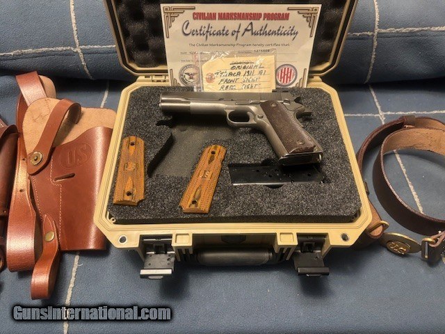 Description: This is a rare piece of American History Ithaca 1911 a1 in 45acp. Both frame and slide are Ithaca, 1944, not a miss match. Has the National Match sights, front and rear and comes with the original front and rear sights as well, if you would like to install them easily. I purchased this from the CMP a few years ago and comes with the Certificate of Authenticity in a CMP custom case for it. I have not fired it since I owned it. Included wil. be: 2 (8) round magazines, a reproduction side holster with lanyard, and belt with brass US buckle, a 2 magazine belt holster, shoulder holster and set of new wood grips with the US insignia on each side. I never put them on. Right side is marked, United States Property, M1911a1, US Army and serial number. Left side is marked, Ithaca Gun Co, Ithaca NY. Pistol is extremly tight and will make a great shooter if you desire. I am 80 and a US Army Vet and this was the issue pistol of my time. I was an Armorer (gunsmith) and could take these apart and put back together blindfolded and I can assure you this will make an excellent shooter if so desired. It's time to let it go. See other listing of my collection on this site. FFL REQUIRED, C&R OK. ***i AM A PRIVATE SELLER, NOT A FFL DEALER***NO CA.***Shipping $50, wiith insurance. Payment by USPS Money Order, Cashier's Check, Personal Check (hold till clears), ZELLE or VENMO. SOLD Curio/Relic: Yes Handgun Caliber: .45 ACP (.45 Auto) Manufacturer: ITHACA Model: 1911A1 Condition: VERY GOOD Metal Condition: VERY GOOD Wood Condition: VERYGOOD/EXCELLENT Bore Condition: VERY GOOD