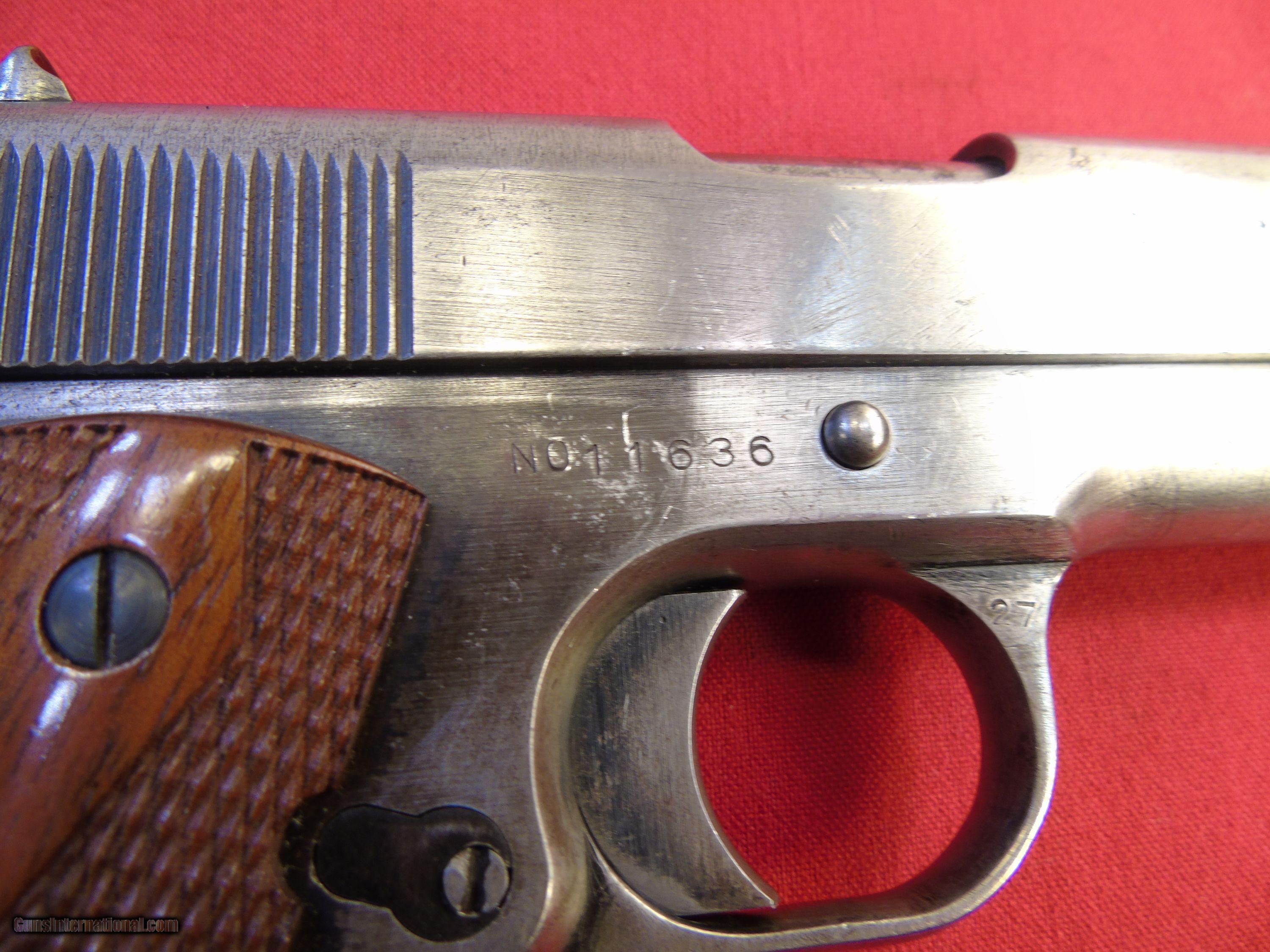 Description: Most of the finish is gone,as you can see in the pics. I had to put replacement grips on the piece,as it had modern grips on it.The bore is good and it does function properly.Just a nice old,rare,WW l U.S.Pistol.A C&R license or an FFL will be required to purchase this piece. SOLD Curio/Relic: Yes Serial Number: 11636 |