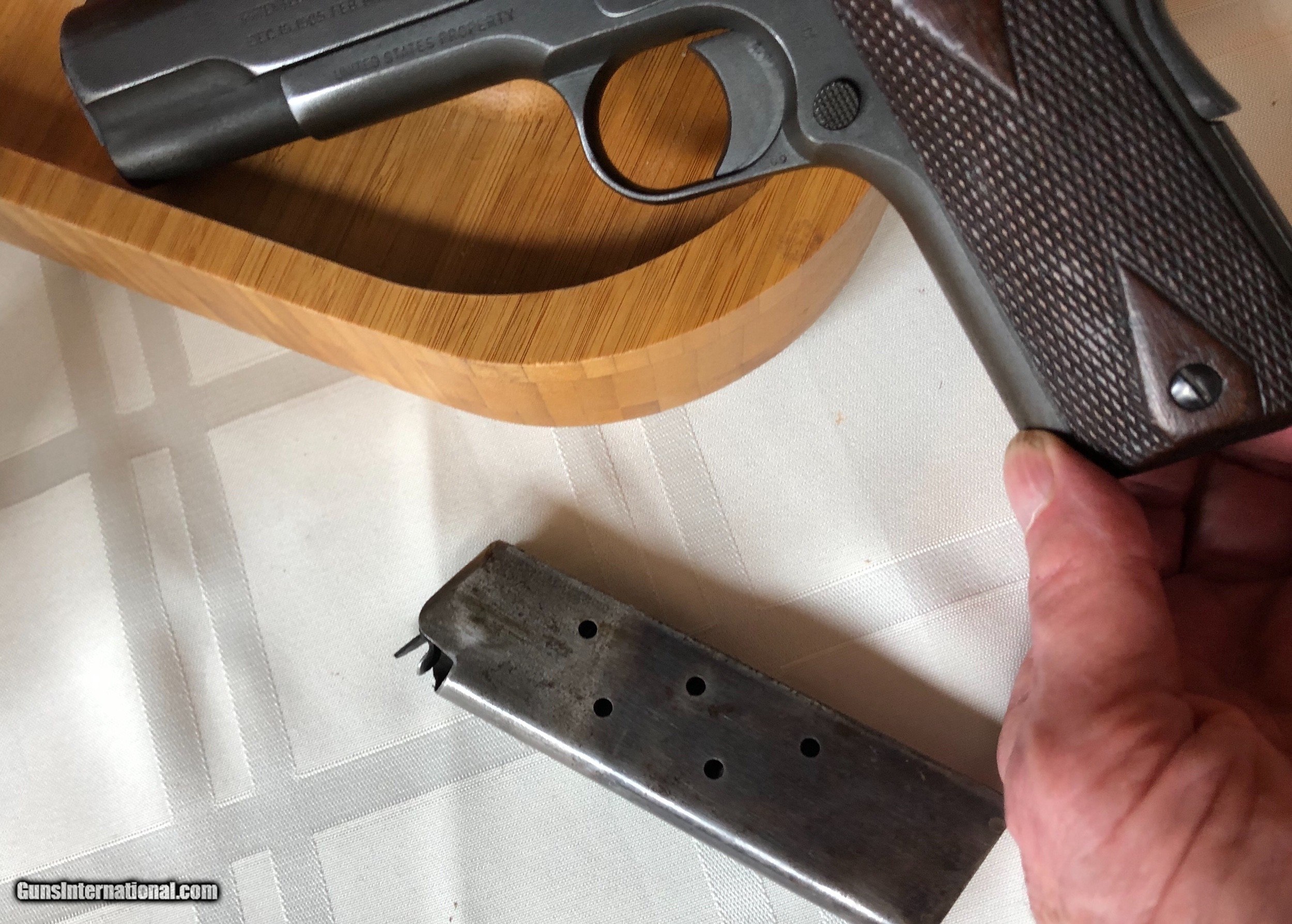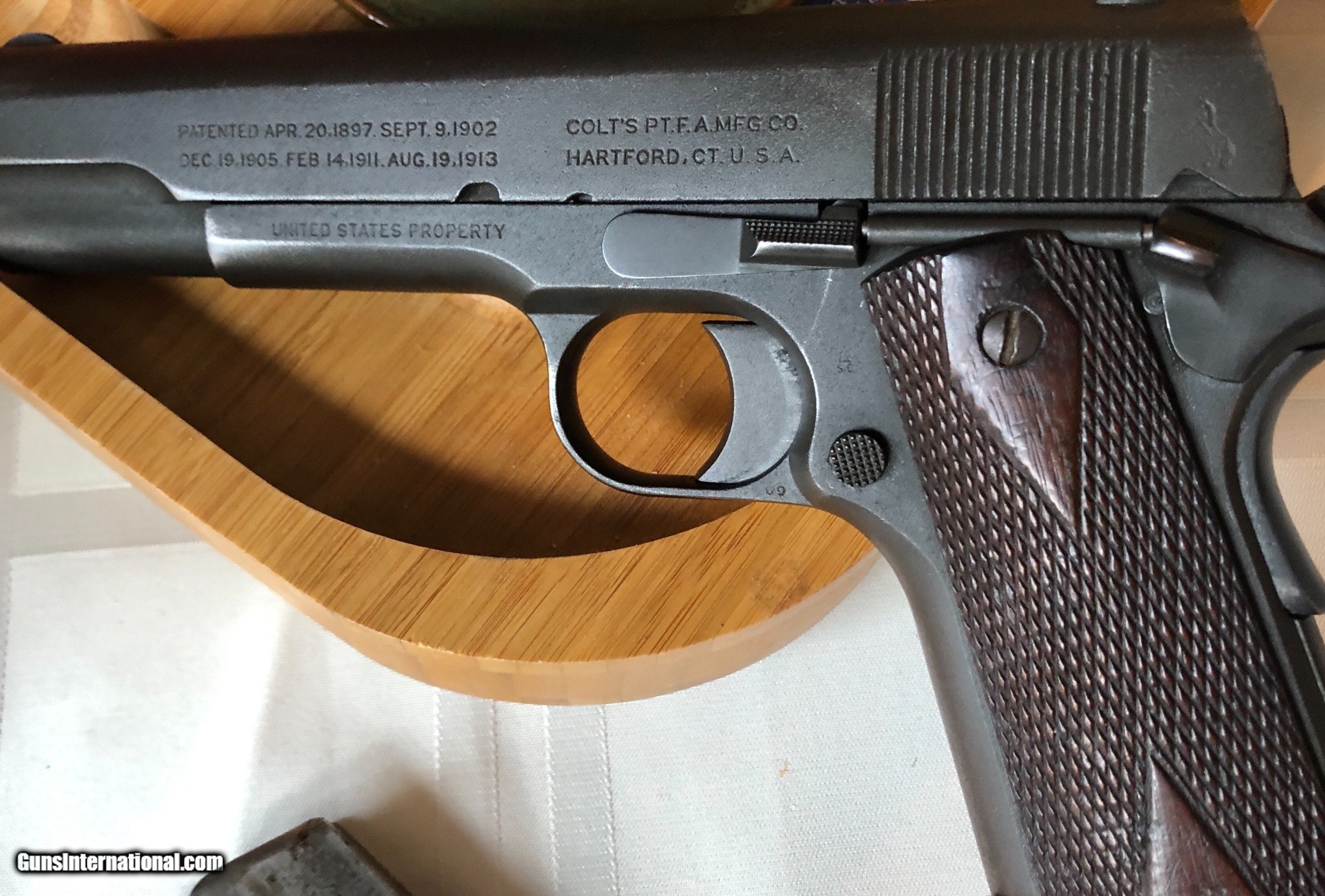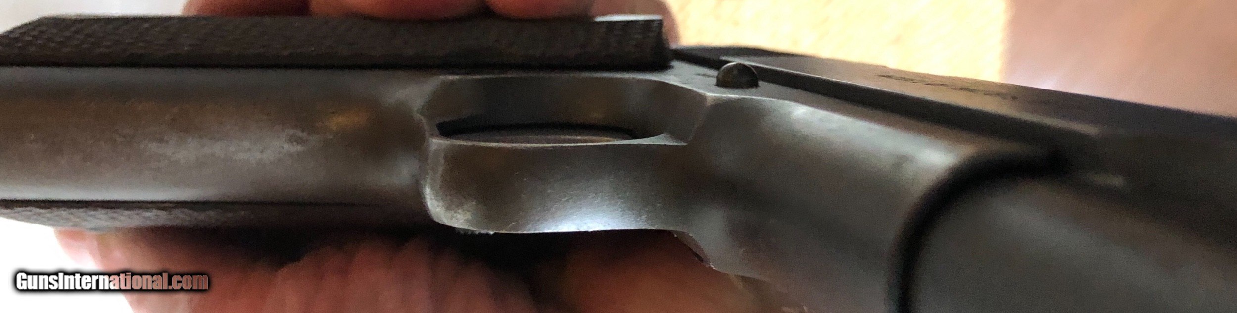 Description: Original owner was a cook in Patton's Army (Sgt Levano) #502605 - made in 1918, tight fitting slide with half tone maganine,original grips -excellent bore - the G.I. took care of this piece- got this piece from daughter.Her father, the veteran, died in l971 she just got rid of this now. Yes it shoots well If you have a S&W Model 19 with a 4" or less barrel I would consider a partial trade SOLD Curio/Relic: Yes Manufacturer: Colt Model: 1911 Serial Number: 502605 Caliber Info: 45 Bore: excellent Condition: very good Wood Condition: near excellent Bore Condition: minty Manufacture Date: 1918 |