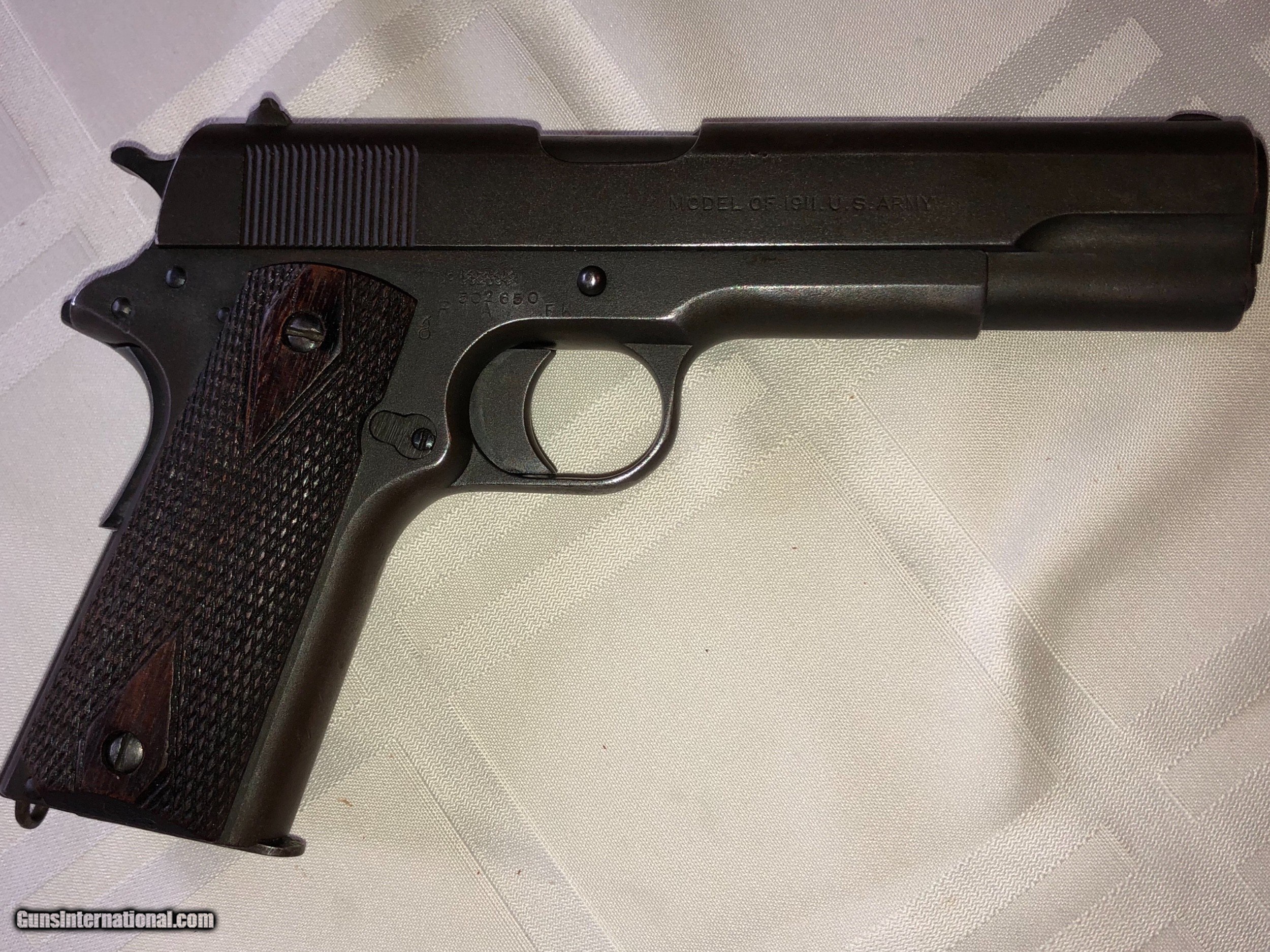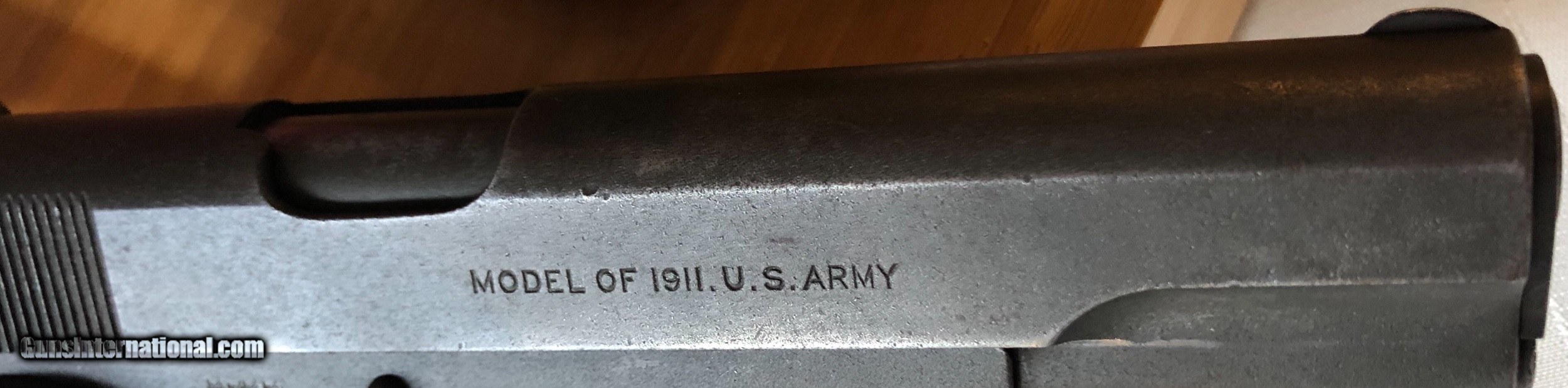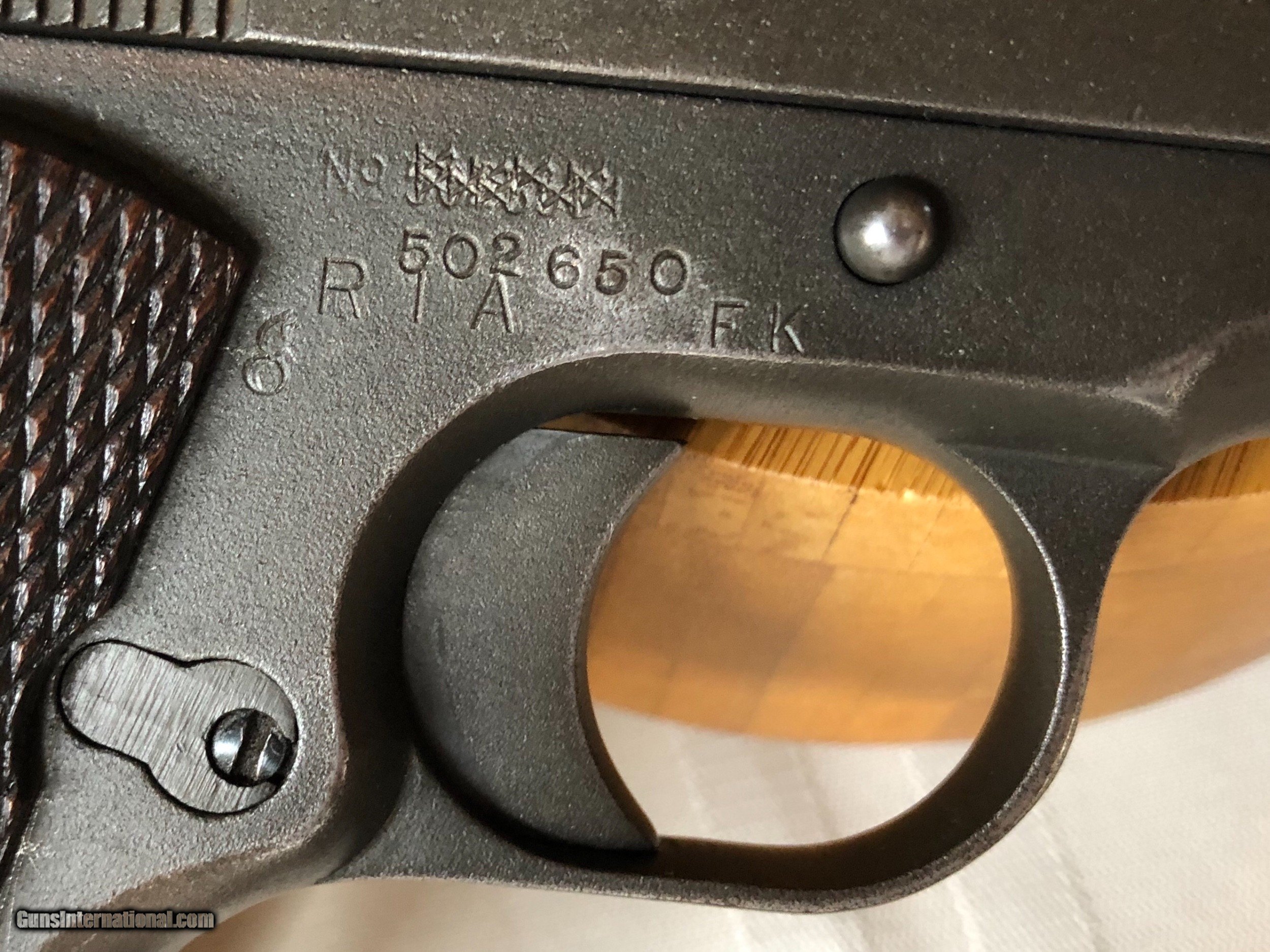 Description: Original owner was a cook in Patton's Army (Sgt Levano) #502605 - made in 1918, tight fitting slide with half tone maganine,original grips -excellent bore - the G.I. took care of this piece- got this piece from daughter.Her father, the veteran, died in l971 she just got rid of this now. Yes it shoots well If you have a S&W Model 19 with a 4" or less barrel I would consider a partial trade SOLD Curio/Relic: Yes Manufacturer: Colt Model: 1911 Serial Number: 502605 Caliber Info: 45 Bore: excellent Condition: very good Wood Condition: near excellent Bore Condition: minty Manufacture Date: 1918 |
