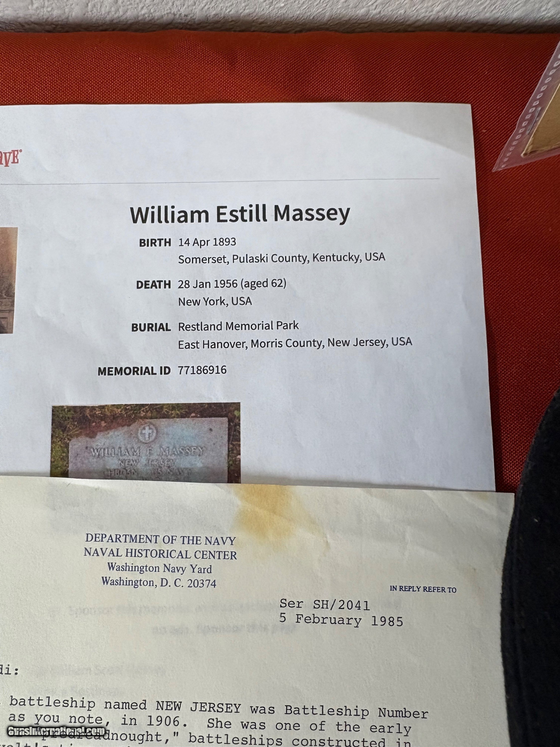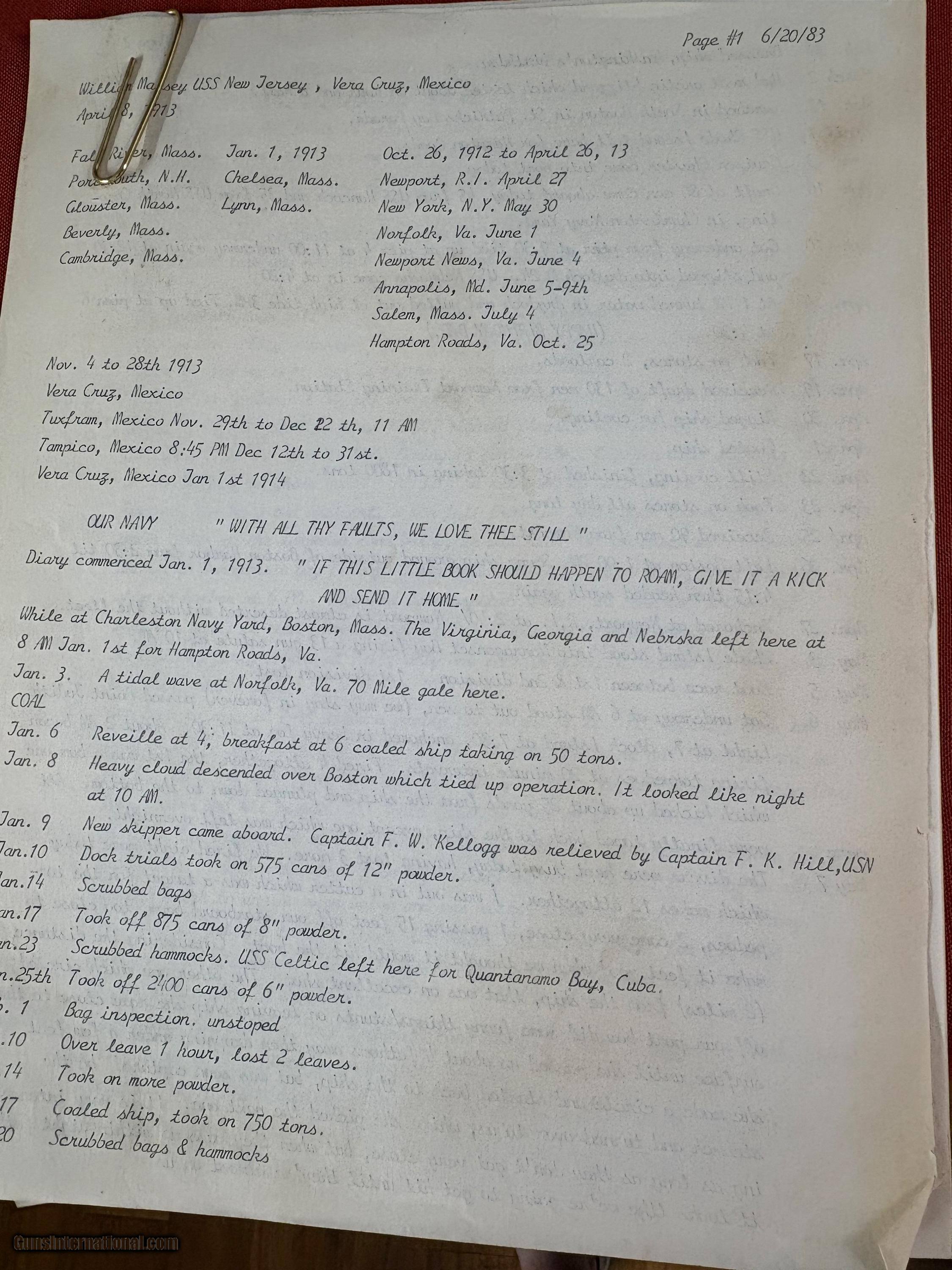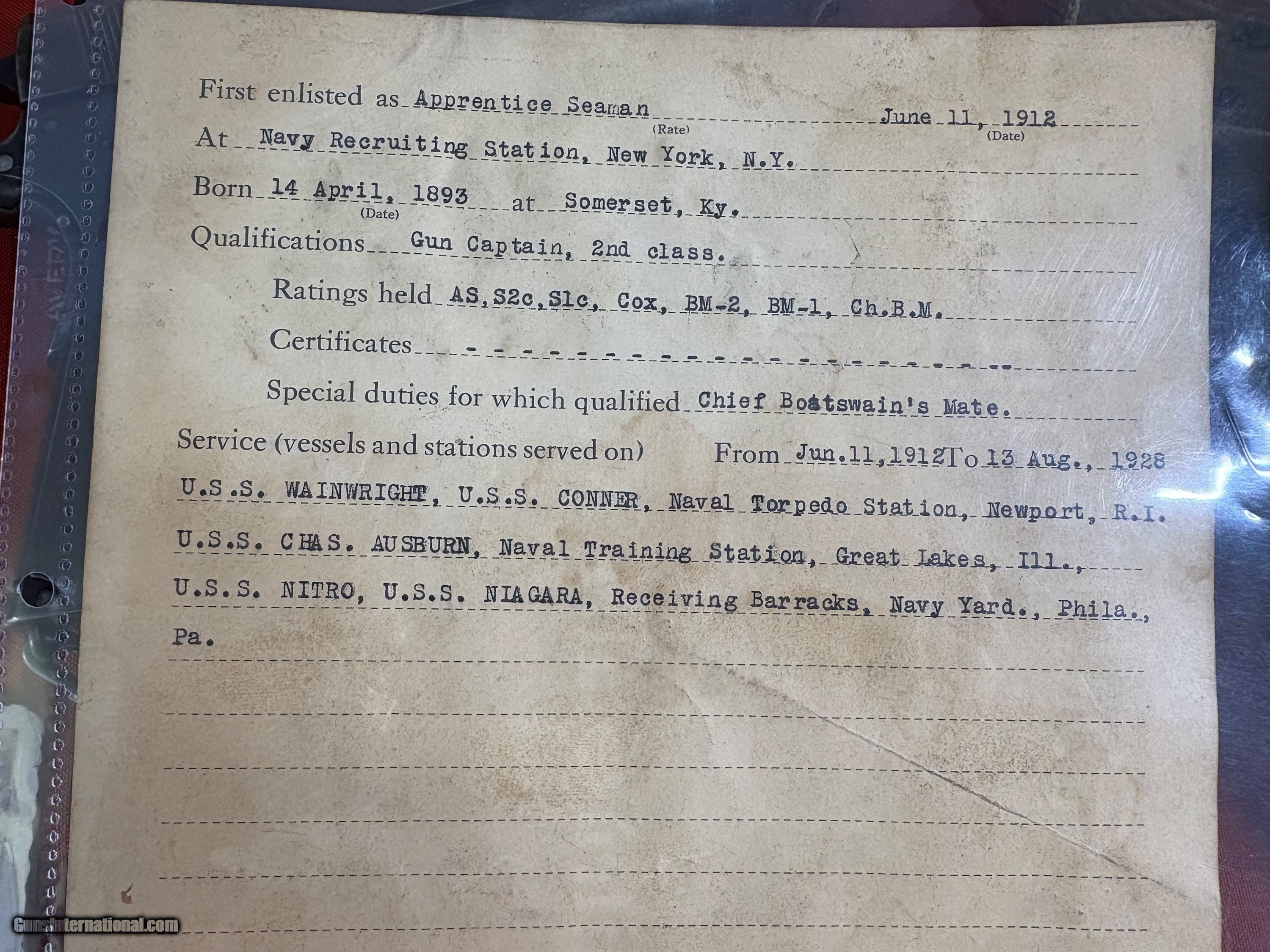Description: WORLD WAR ONE U.S. SPRINGFIELD ARMORY 1911 SEMI AUTO PISTOL 45 ACP . SER# 117792, VERY INTERESTING GROUPING WITH U.S. NAVY HISTORY , BELONG TO WILLIAM ESTILL MASSEY , CHIEF BOATSMAN'S MATE , SERVED FROM 1912 TO 1928, A GREAT COLLECTION OF HIS HISTORY INCLUDING HIS DIARY TYPED ON COTTON PAPER TELLING ABOUT HIS FIRST YEAR OF TRAINING , WAR MANEUVERS AND WHAT THEY ENCOUNTERED ABOARD THE U.S.S. NEW JERSY . THEIR JOURNEY TOOK THEM FROM BOSTON DOWN TO THE KEYS AND AROUND TO MEXICO AND BACK . CHECK OUT ALL THE PICTURES, EASTERN BRANCH FIREARMS ADD 50.00 SHIPPING – HANDGUNS SHIP NEXT DAY AIR ADD 50.00 SHIPPING – LONG GUNS SHIP GROUND OPTIONAL INSURANCE IS AVAILABLE AT 1.25 PER 100.00 Questions e-mail or call Glen at Eastern Branch Firearms 207-215-5021 TERMS – PLEASE READ BEFORE I DO NOT HAVE A LAYAWAY OPTION ( WE ACCEPT CREDIT CARDS ) -- I GET ALOT OF REQUEST FOR TRADES, I WOULD PERFER NOT TO DO TRADES ON MY INTERNET LISTINGS PAYMENT OPTIONS- We accept money orders, cashier’s checks , bank checks. personal checks ( with personal check - shipping hold for 10 days from check being deposited - no exceptions) . We accept all major credit cards please add 3% to the ’s cash discount price.(Shipping within the state of Florida - Florida Residents must pay sales tax) .Handguns and long guns do need to be shipped separate. PLEASE do not send payment via FED EX . USPS & UPS are fine. Thank you. We include a signed copy of our FFL with each firearm shipped. SAFTY NOTICE- Buyer is solely responsible for determining that a used gun is safe to shoot. The firearms offered have not been test fired but have been given a visual inspection only for purposes. It is a requirement that every used firearm is inspected by a qualified gunsmith before firing. By , the buyer agrees to hold seller harmless against damages, injury, or death caused by defective merchandise. RETURN POLICY- All firearms come with a 3-day non firing , non messing with ( turning srews ,taking apart,removing parts, scoping. firing, cleaning or messing with in anyway) inspection/return privilege.Inspection is based on a visual review of the gun to confirm the gun is in the condition stated. In the case of a return, buyer pays all shipping charges & if paid for with a credit card buyer absorbs the 3% credit card charges . So please ask questions BEFORE you bid. Thanks for Looking and Good Luck!! Curio/Relic: Yes Price: $6,900.00 Shipping: $85.00 Buy Now Contact Seller |
