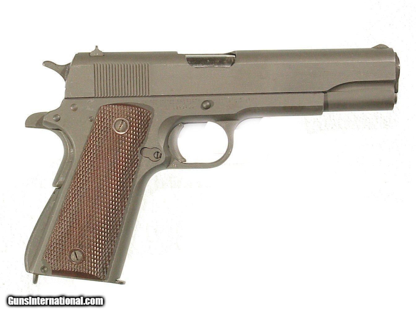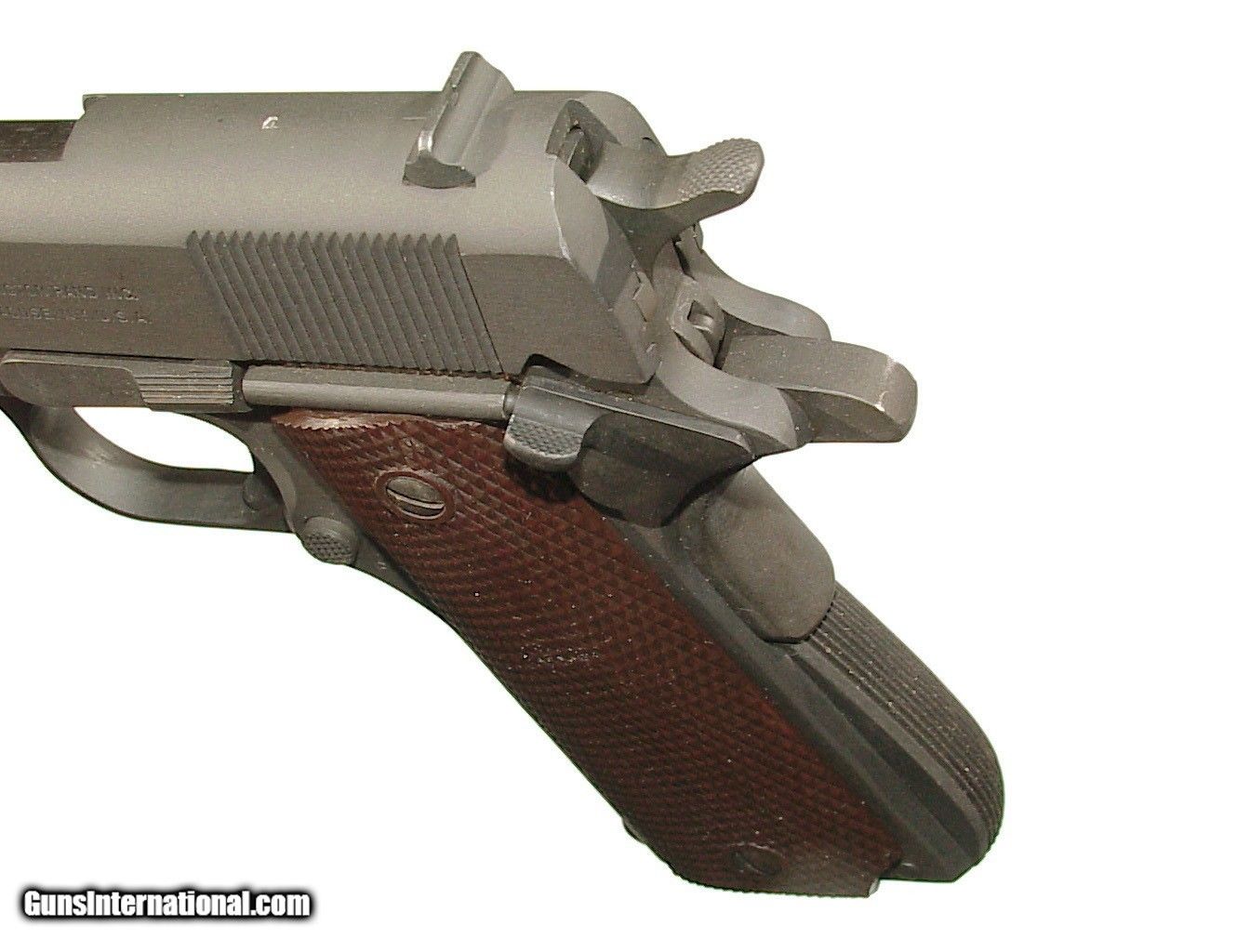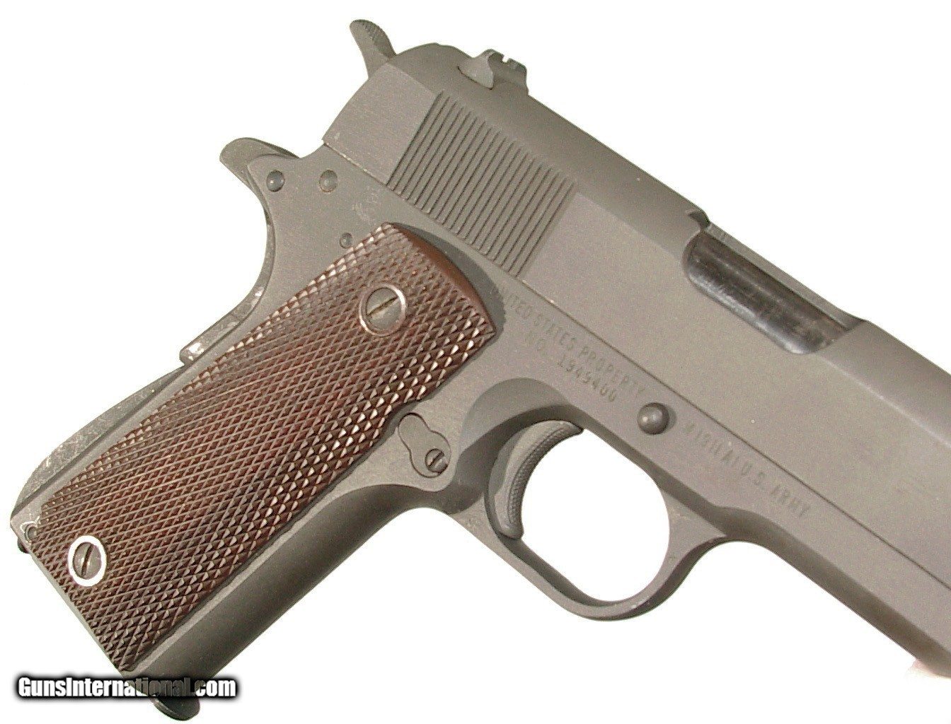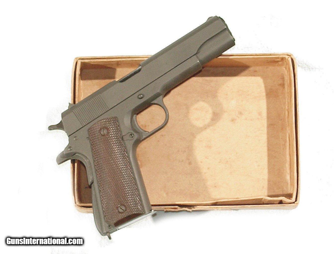 Description: .45 a.c.p. caliber , 5" barrel, original parkerized finish with brown checkered plastic grips. In unissued original condition with the correct markings on the slide and frame. Retaining all of the parkerized finish, mint grips and bore. Mechanically perfect. In it's original fiberboard shipping box SOLD Curio/Relic: Yes |