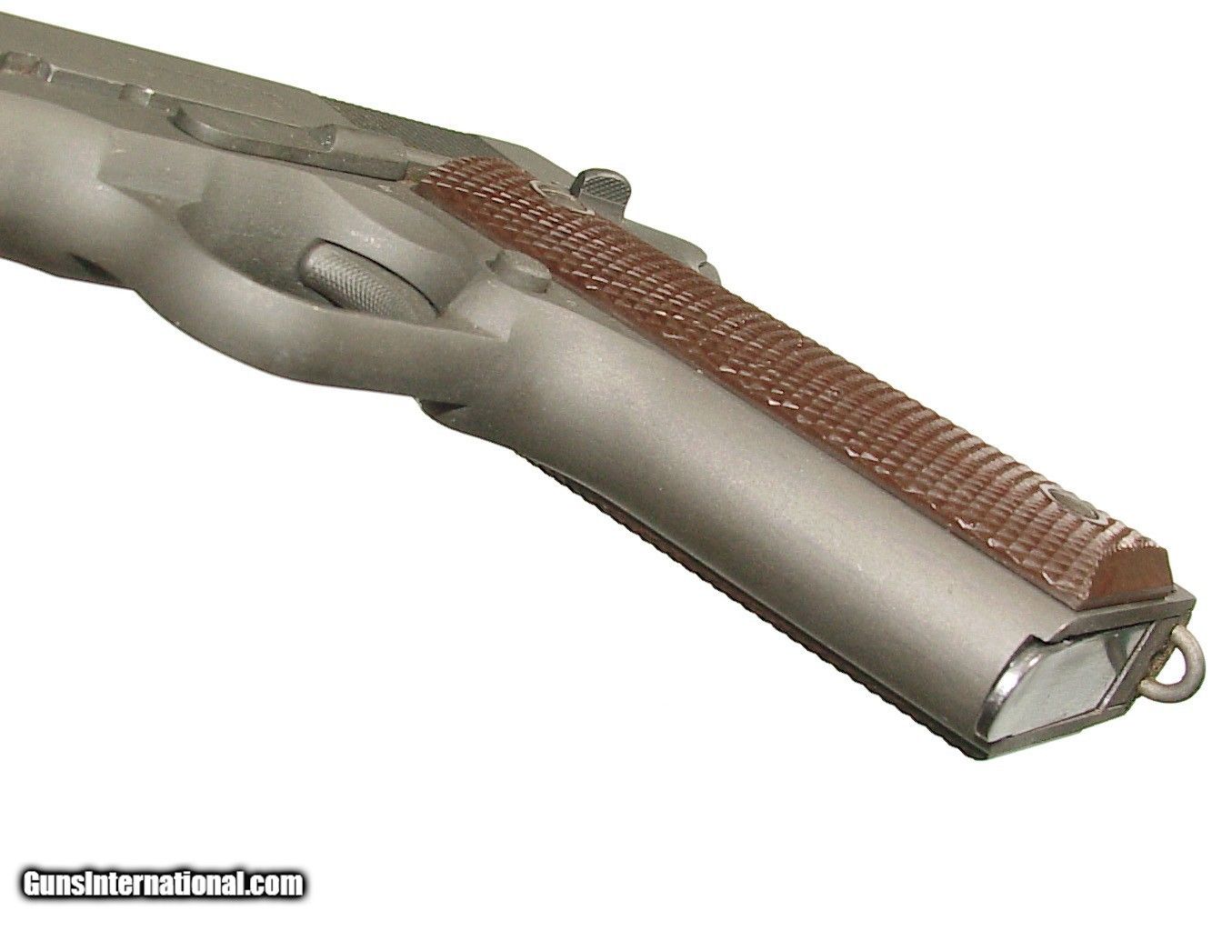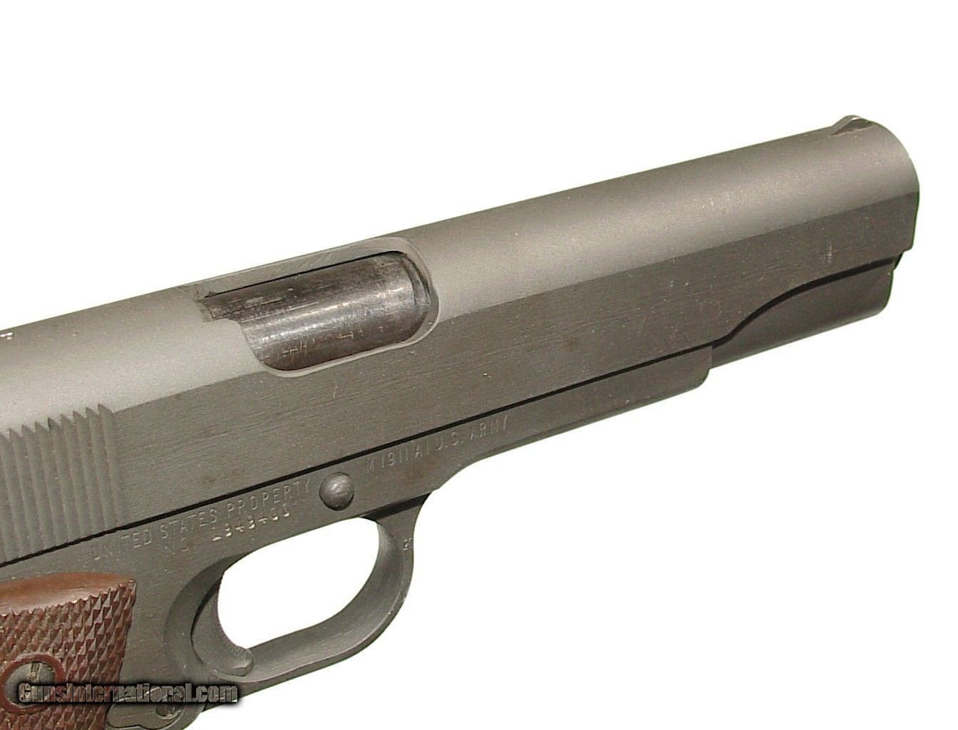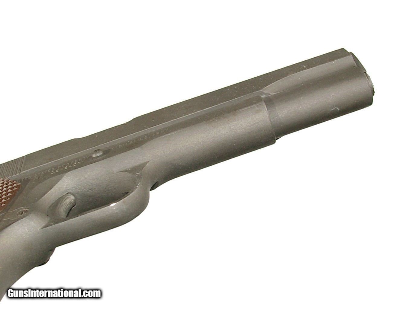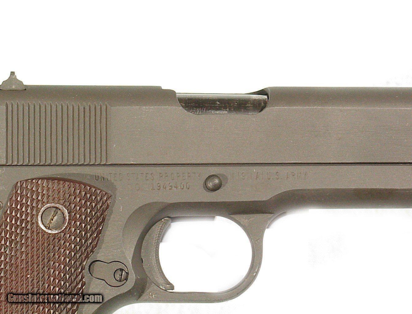Description: .45 a.c.p. caliber , 5" barrel, original parkerized finish with brown checkered plastic grips. In unissued original condition with the correct markings on the slide and frame. Retaining all of the parkerized finish, mint grips and bore. Mechanically perfect. In it's original fiberboard shipping box SOLD Curio/Relic: Yes |