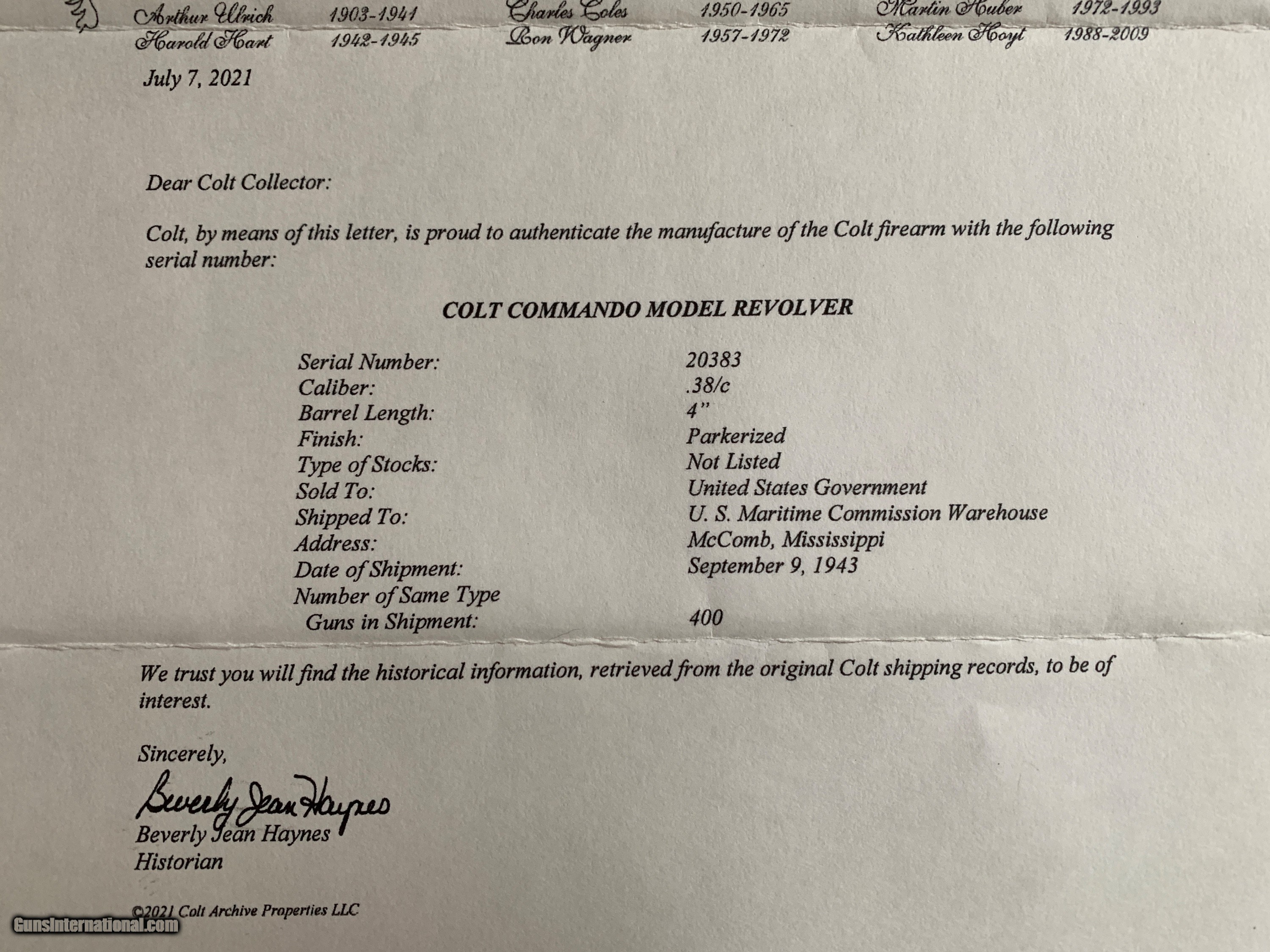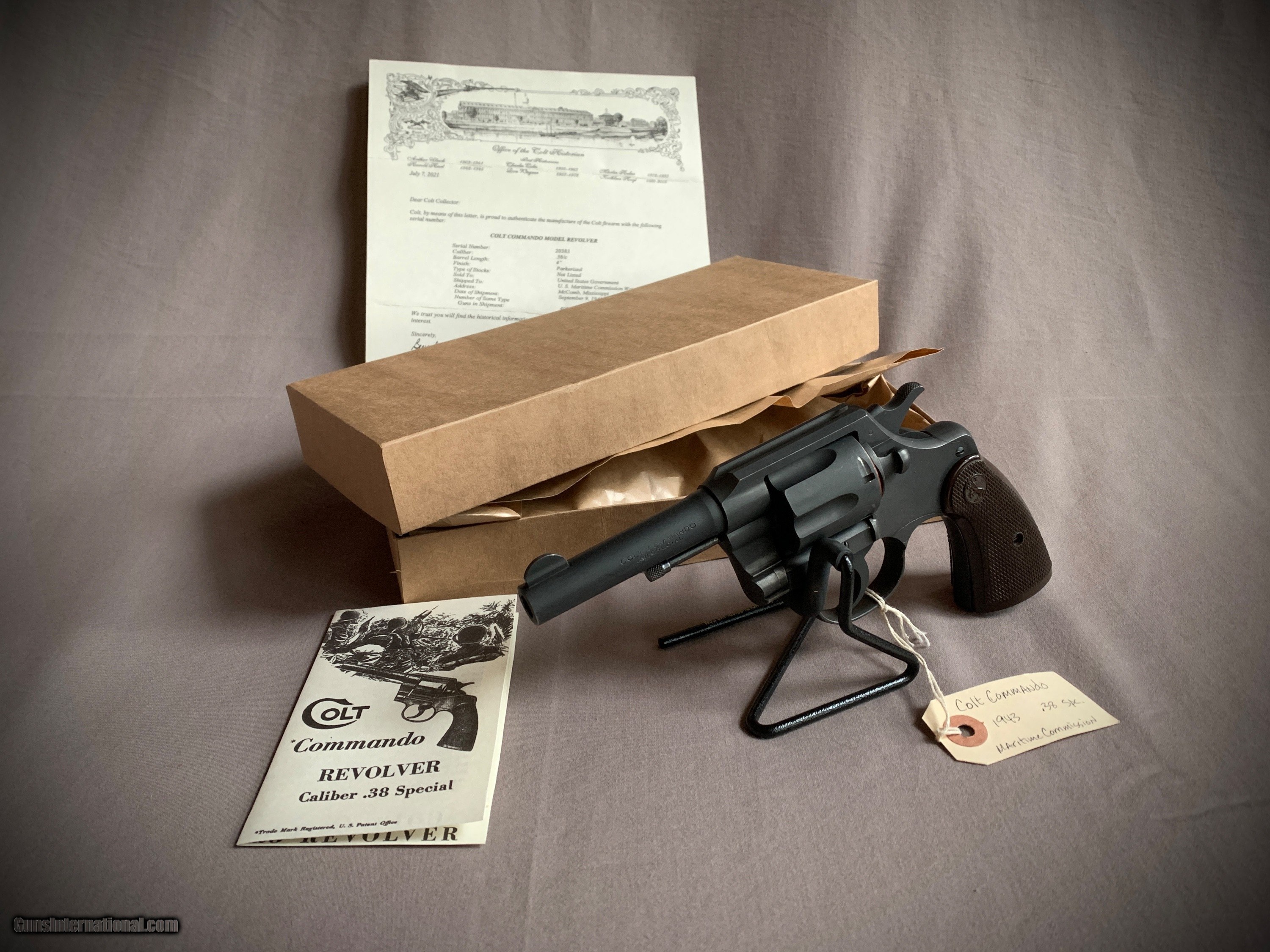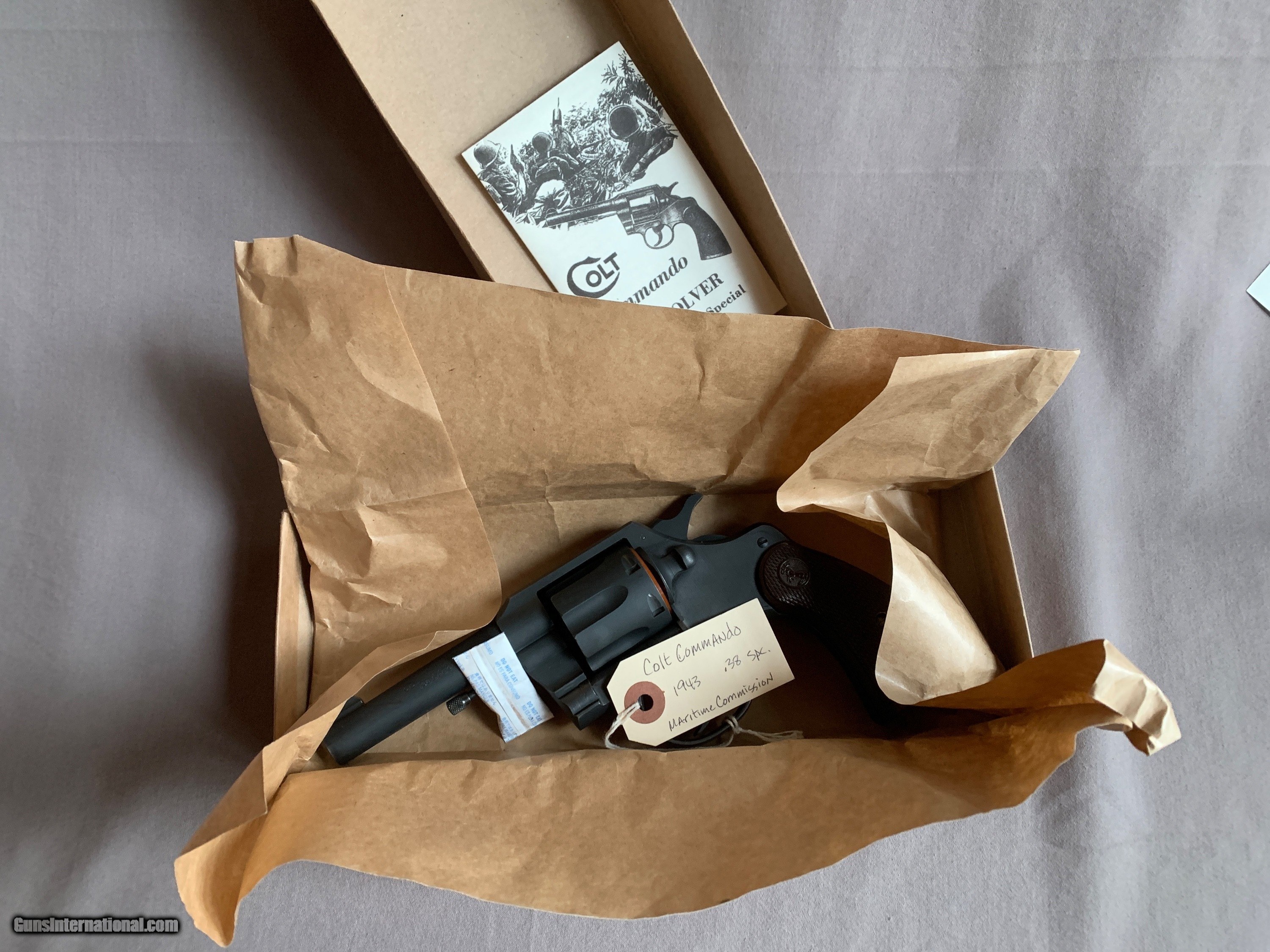 Description: Shipped to the Maritime Commision in 1943, this Commando is in great condition. Timing and lockup is correct. Original Parkerizied finish roughly 95% or better but please look at photos for most accurate description. The Colt Commando was kept stateside during the war as the 1911's were high demand. Most Commandos went to businesses who were helping with war efforts. The Maritime Comission trained the Merchant Marines. "The United States shall have a merchant marine...[to] serve as a naval or military auxiliary in time of war or national emergency...[and] should be operated by highly trained and efficient citizens of the United States and that the United States Navy and the Merchant Marine of the United States should work closely together to promote the maximum integration of the total seapower forces of the United States...". The below is a short summary and very intresting. (W W W dot) usmm/usms.html This is a must for any Military collection. There are some examples for a few hundred less, but not with the history documented by Colt Archives. This is C&R eligible depending on your local restrictions. Shipping fully insured $65 to Continental US. SOLD Curio/Relic: Yes Handgun Caliber: .38 Special Manufacturer: Colt Model: Commando Serial Number: 20383 |