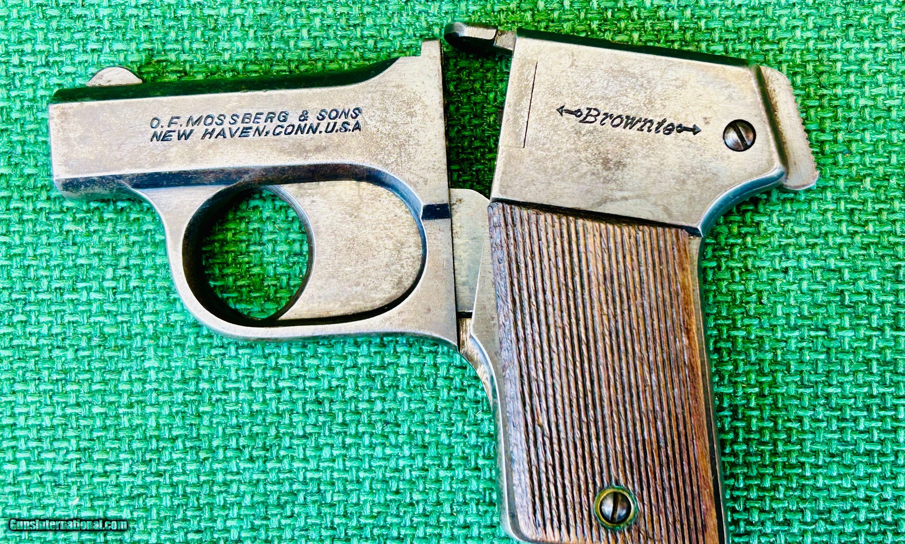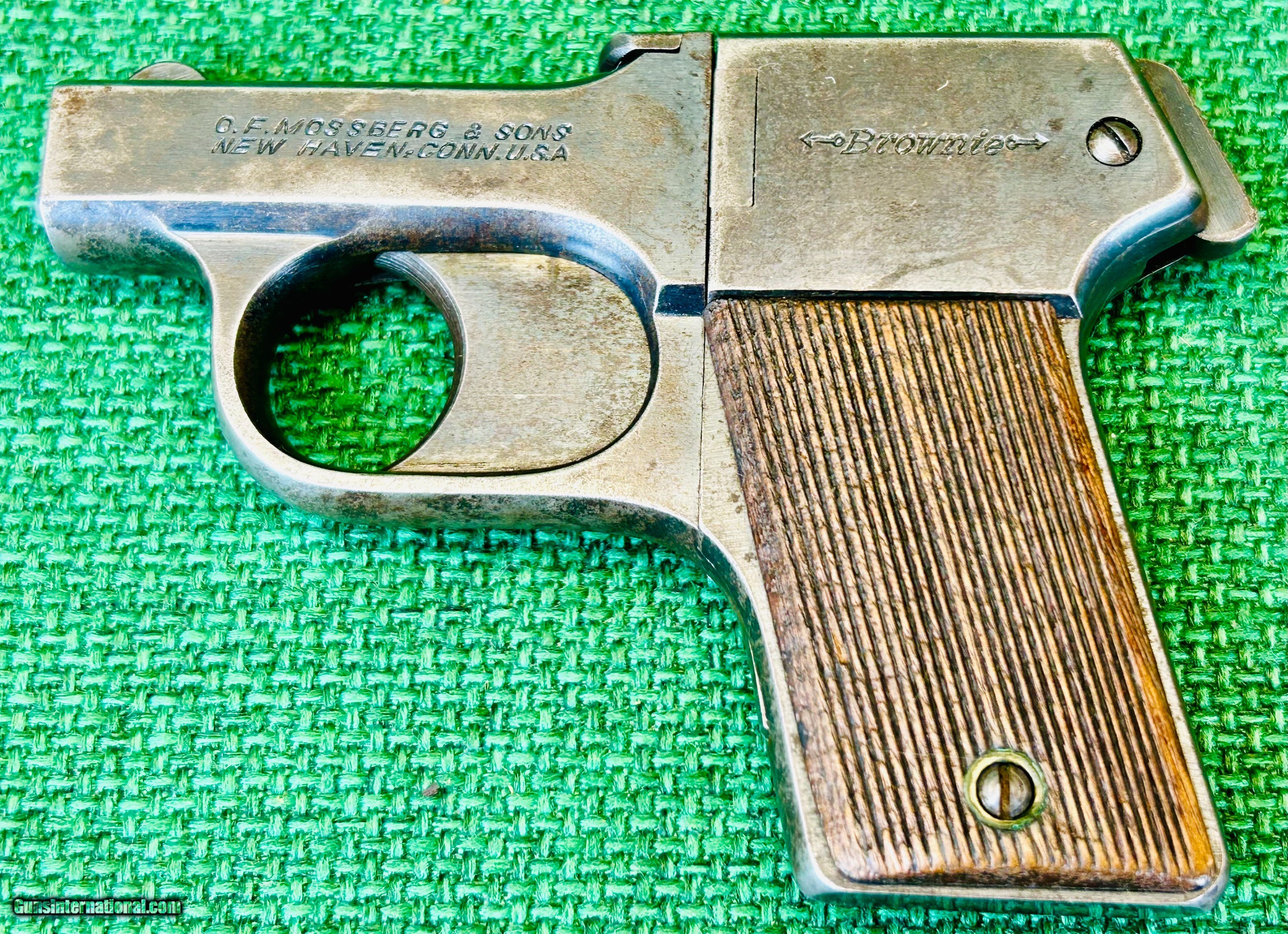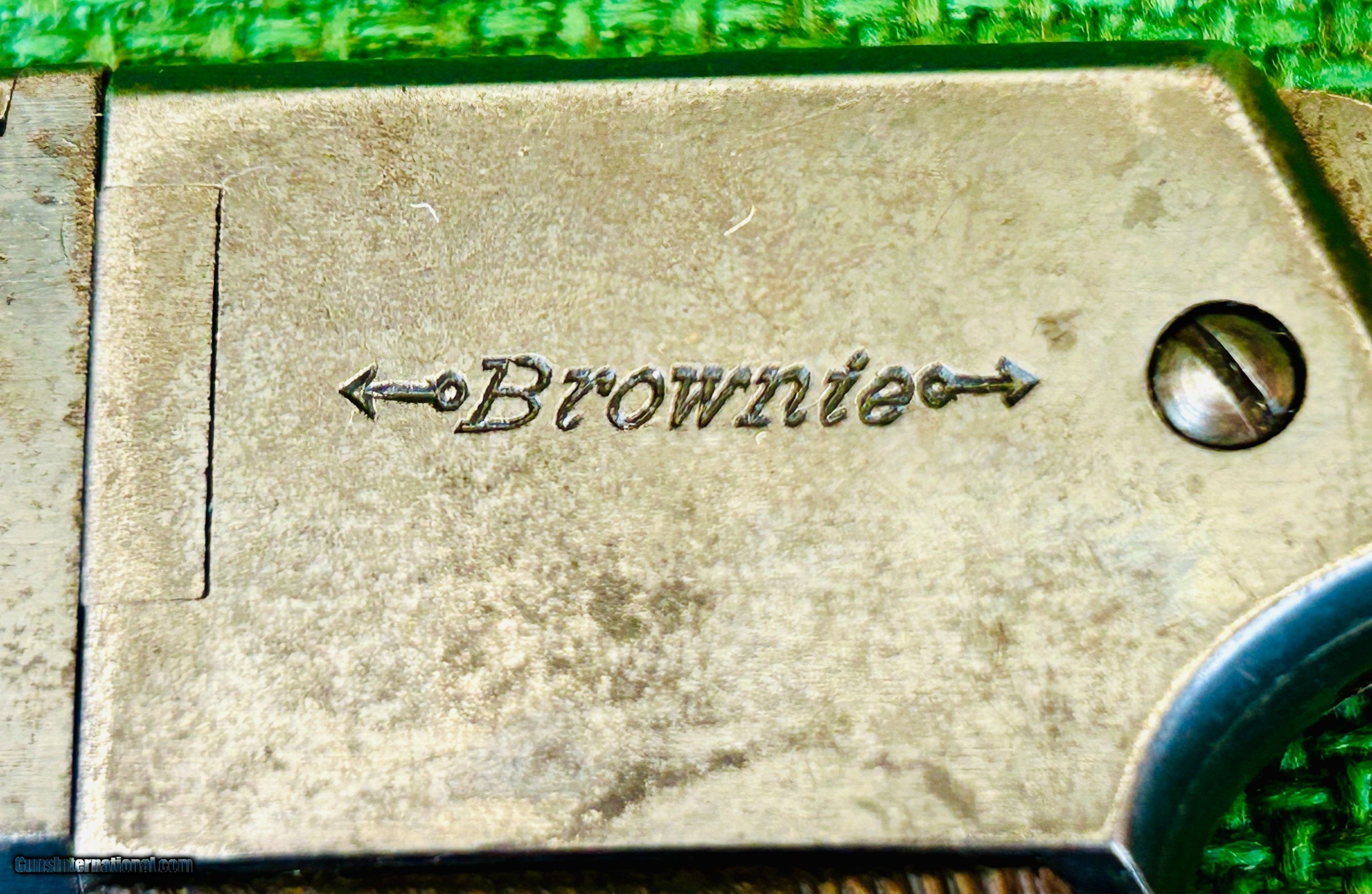 Description: The Mossberg Brownie is a 4-shot, .22 Long Rifle pistol. The pistol has a double-action trigger and a rotating firing pin. Each pull of the trigger cocks and releases the hammer as well as rotating the firing pin to fire each chamber in succession. A top-mounted latch releases the barrel assembly to open forward. We've test fired this weapon, and the receiver locks into position tightly. The firing pin rotates as it should. We've had good shots and strikes on all 4 cylinders. The bores are remarkably clean. Wooden grips are in one piece and in good shape. We accept USPS Money Order, cashier’s check, or credit card for immediate shipping. Please note credit card sales are subject to an additional 3% fee. US shipping only. Shipping costs are actual postage, adult signature required, to your FFL 01 or 03. We will pay the insurance for the amount sold. All items are for sale locally, so make contact as soon as you make your decision. Inquiries will be handled in chronological order. All postings will remain active until funds are received. SOLD Curio/Relic: Yes Handgun Caliber: .22 Long Rifle Manufacturer: Mossberg Model: Brownie |