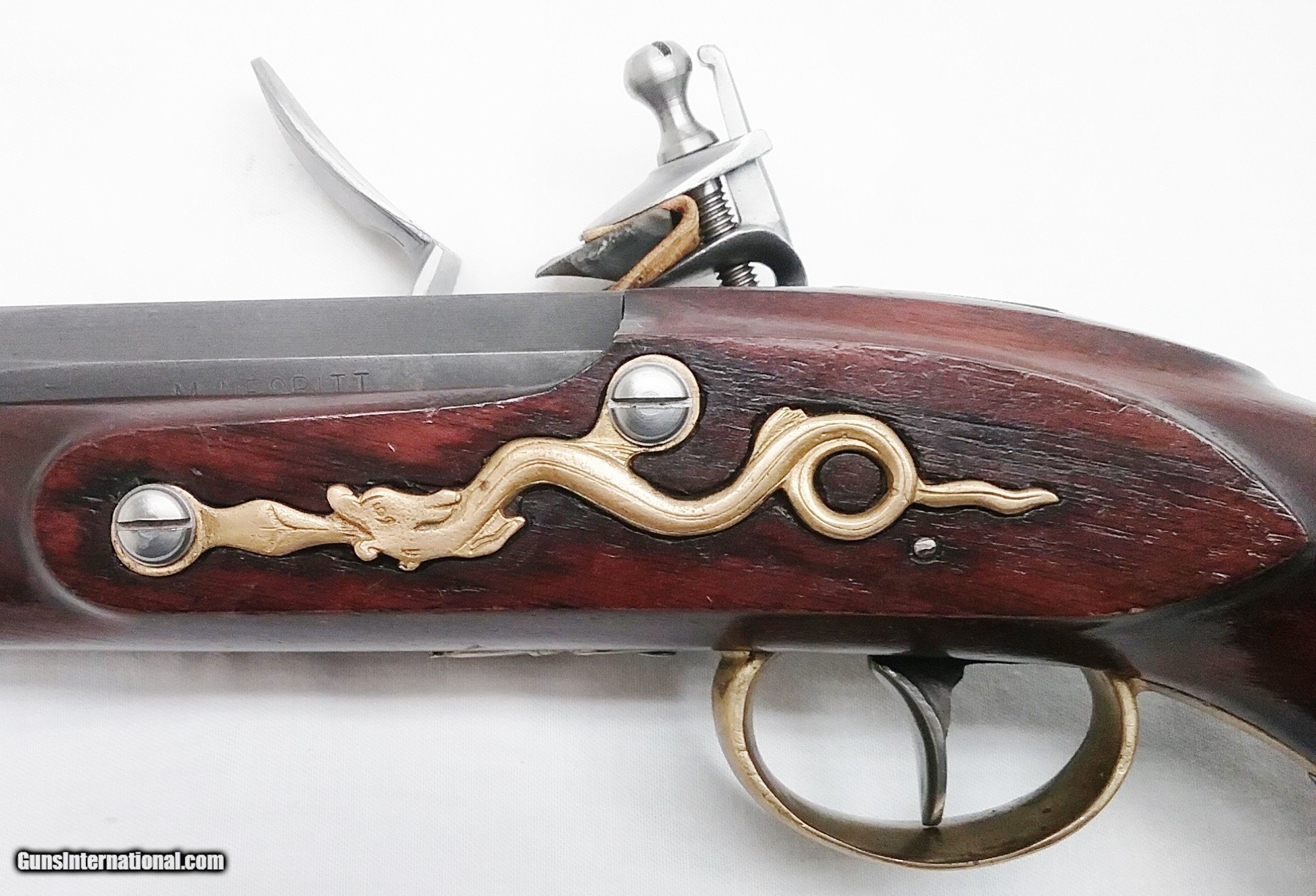 Description: This 58 caliber/24 gauge Trade pistol has a tapered octagon to 16 flats to Wedding Band to round 1" to 3/4" x 10" blued smooth bore barrel with a German silver front sight. The bore is very good. Stamped on the top flat of the barrel is London and the Sitting Fox cartouche. The P grade Walnut stock is mounted with brass furniture. The highly polished flint lock with the Sitting Fox carthouche stamped on the plate is activated by a single trigger. Good wood to metal fit - made by North Star West. Overall length is 16-1/4", weight is 2 lbs, 10 oz. Condition: Good. Our stock number is P-30-32A. Will ship anywhere in the United States. Buyer pays freight and insurance. SOLD Manufacturer: North Star West Model: Trade Flint Caliber Info: 58Cal Bore: Smooth Bore Condition: Good Metal Condition: Good Wood Condition: Good Bore Condition: Very Good Barrels: One Barrel Type: Tapered Octagon Action: Flint Triggers: One Gauge Info: 58Cal/24Ga Stock: Walnut Finish: Blued Weight: 2 lbs, 10 oz Sights: Fixed |