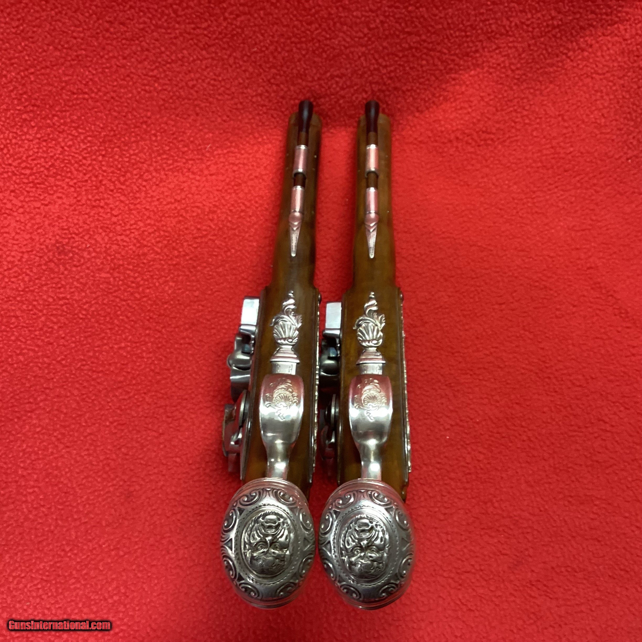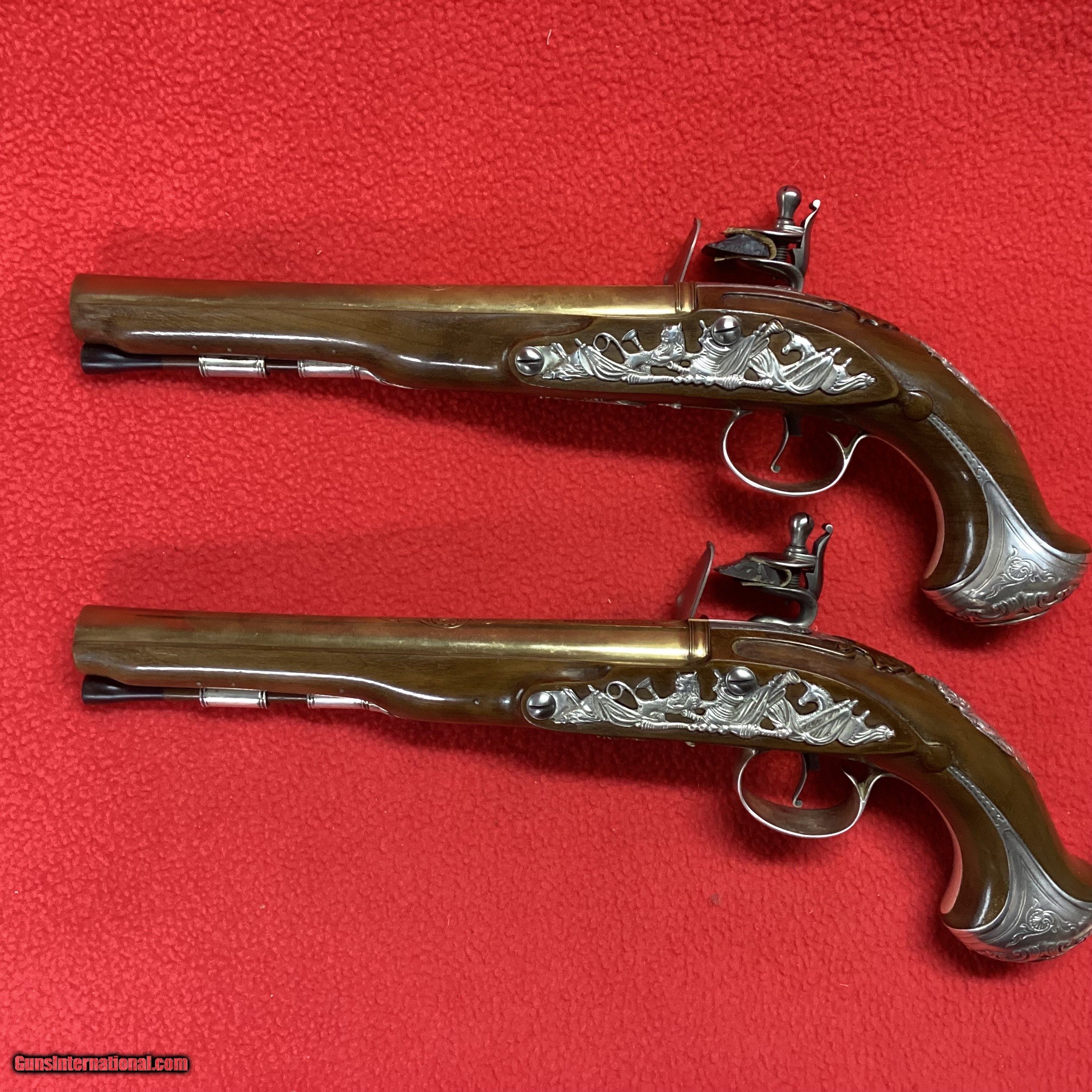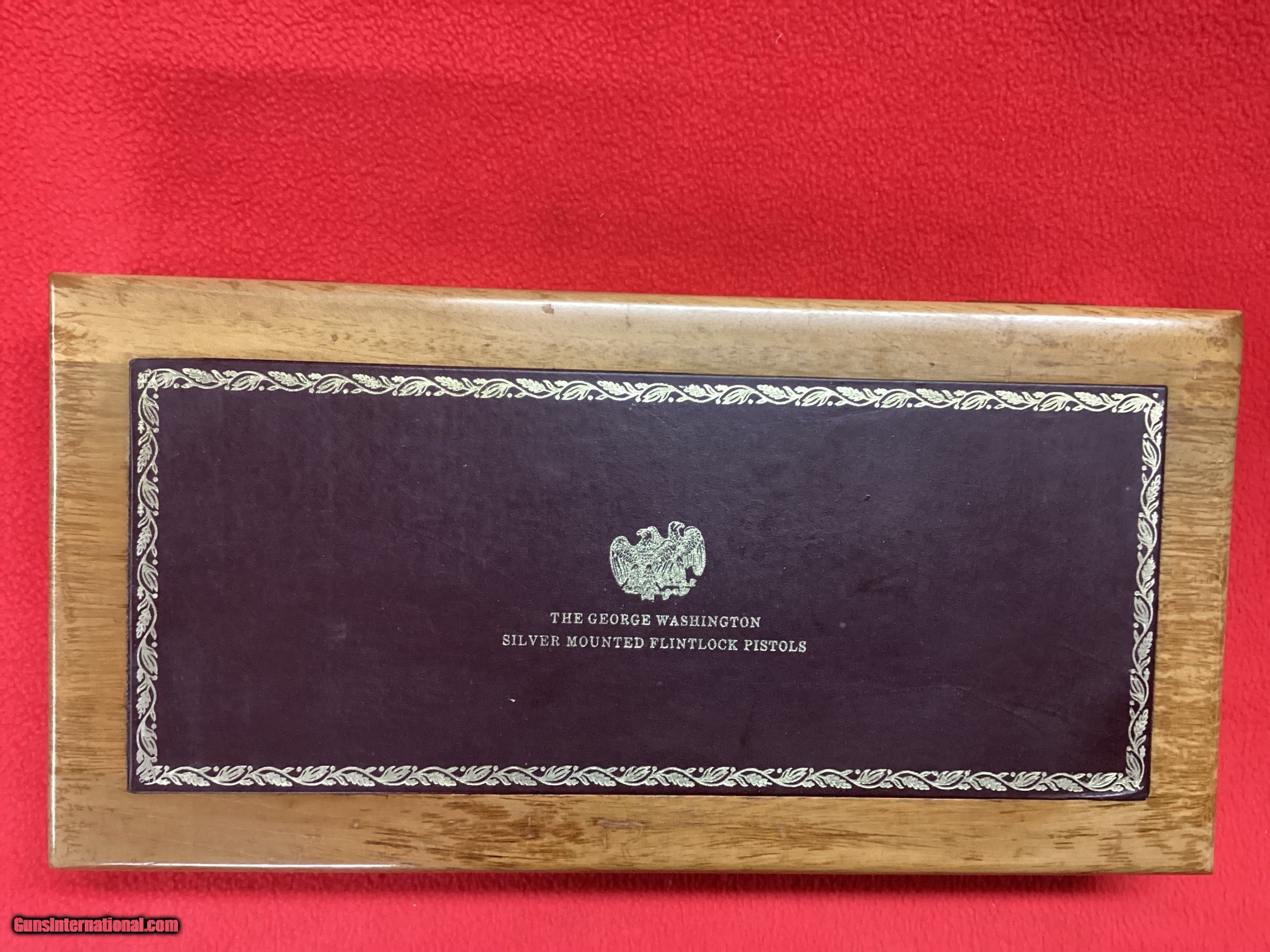 Description: FORYOUR VIEWING FROM AN ESTATE IS A PAIR OF GEORGE WASHINGTON SILVER MOUNTED FLINT LOCK PISTOLS IN A PRESINTATION CASE. IT LOOKS LIKE 58 CAL. MADE IN 1976 FOR THE US HISTORICAL SOCIETY. THEY ONLY MADE 975 PAIRS OF THESE IN A WOOD PRESENTATION CASE. THEY ARE LIKE NEW IN THERE WOOD CASE. THE WORKMANSHIP IS OUTSTANDING ON THIS PAIR. THE ORIGINAL PAPER WORK IS MISSING FOR THIS SET. THESE FLINTLOCK BLACK POWDER ONLY PISTOLS CAN BE SHIPPED TO YOU DIRECT.. NOTE SHIPPING AND INS. EXTRA CALL OR EMAIL FOR MORE INFO ETC. THANKS FOR LOOKING ASK ABOUT MY EZ PAY PLAN SOLD |