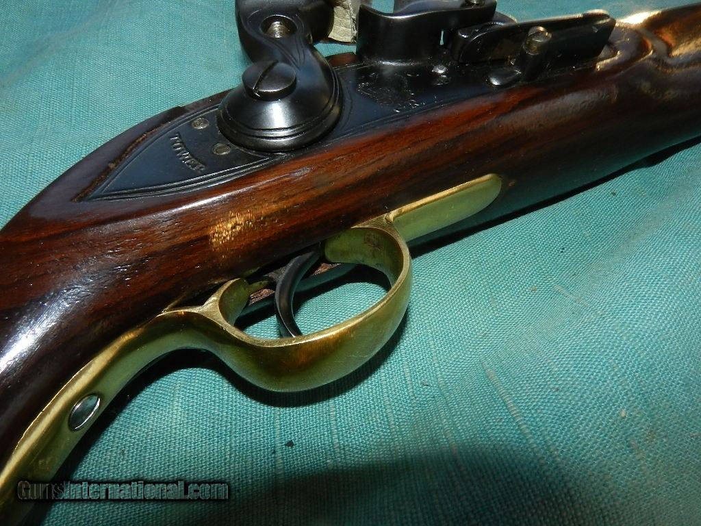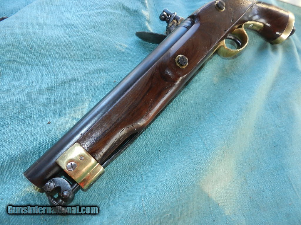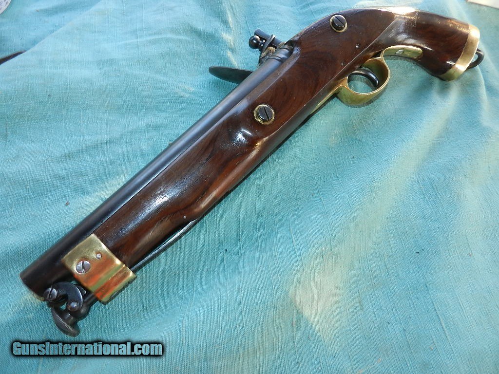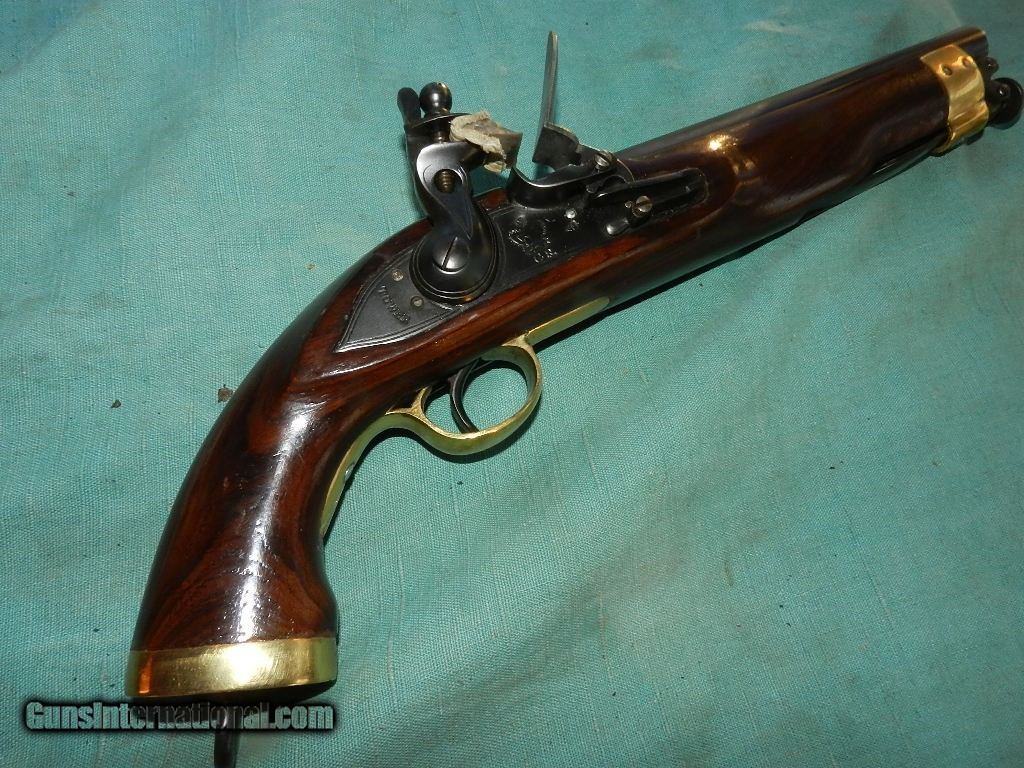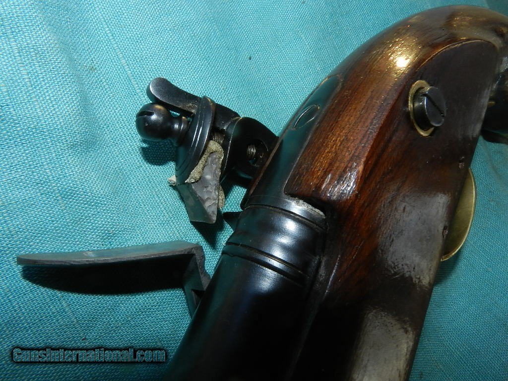 Description: A super high quality firing flintlock English Sea Service called New Service and issued 1805 for the Napoleonic Wars. Overall length is about 15 1/2", with a 9" round barrel, with a .65 smooth bore, that is excellent condition.The action is very good, and the flint showers generous sparks on the frizzen. The exterior metal is arsenal blued. The hardwood stock with a clean finish is excellent. Brass furniture is high polish. Correct lock-plate English markings. A spring mounted captured ram-rod . Overall a very respectiable shooting fintlock pistol of Historic Associaton.A newer made quality flintlock shooter. When buying a gun always have it examined by a competent gunsmith before shooting. To buy a gun from me you must get a direct email for me, with details, and shipping cost. We don’t have a web site .I prefer money orders or a check. Item ships when funds come in. I try to keep guns affordable, which means I make less money than most dealers. You won’t get altitude sickness, or nose bleed, with my prices! I consistently have the best selection of older guns If you attempt to buy, you must still contact us for details . Best to email to buy. Sometimes a local person can stop buy and purchase before the gun is removed. Sometimes not home to get calls. Some guns are required shipment to a gun dealer near you for a transfer to you when it arrives. Otherwise many older or black powder guns ship to your door. With the widest selection of older guns at great prices, We don’t have a store, and sell on the internet only. I’m easy to get along with. Thank You SOLD |