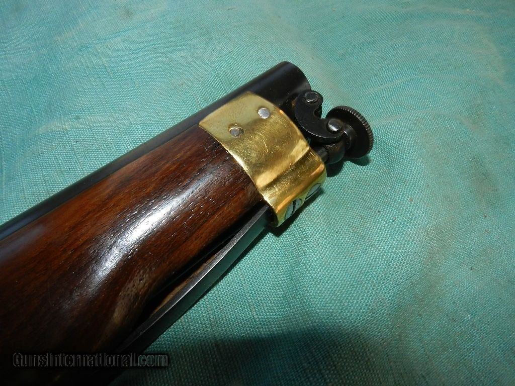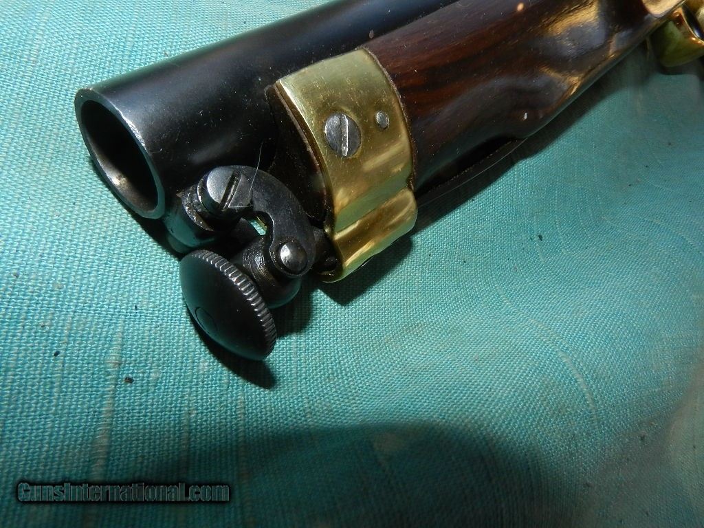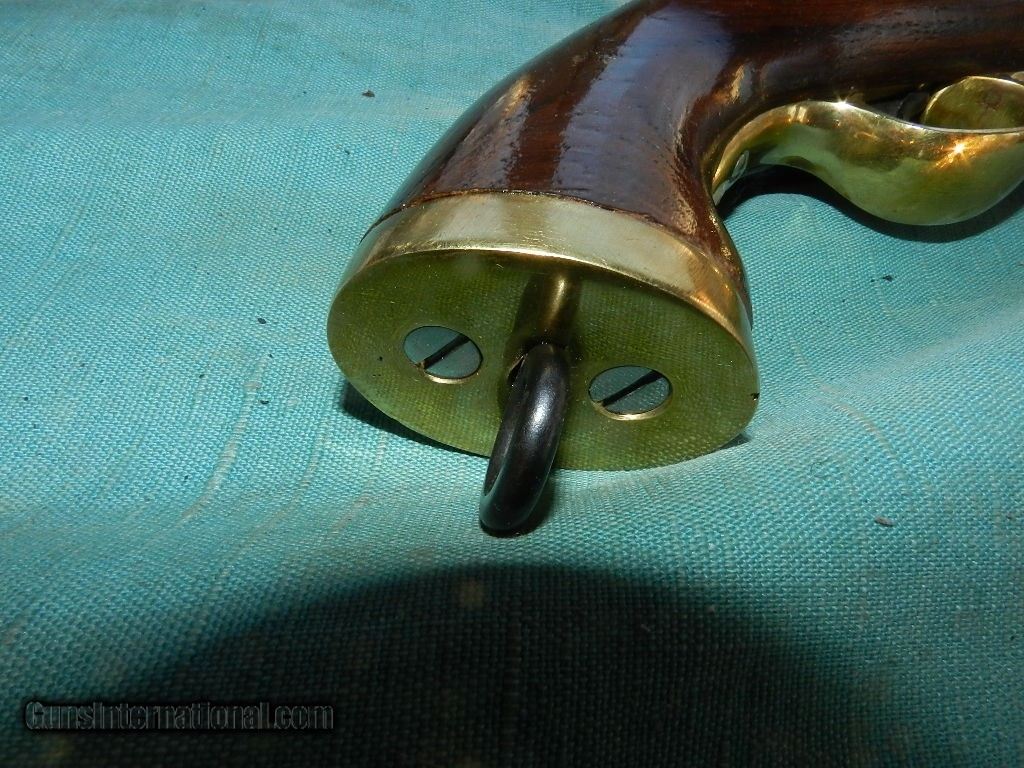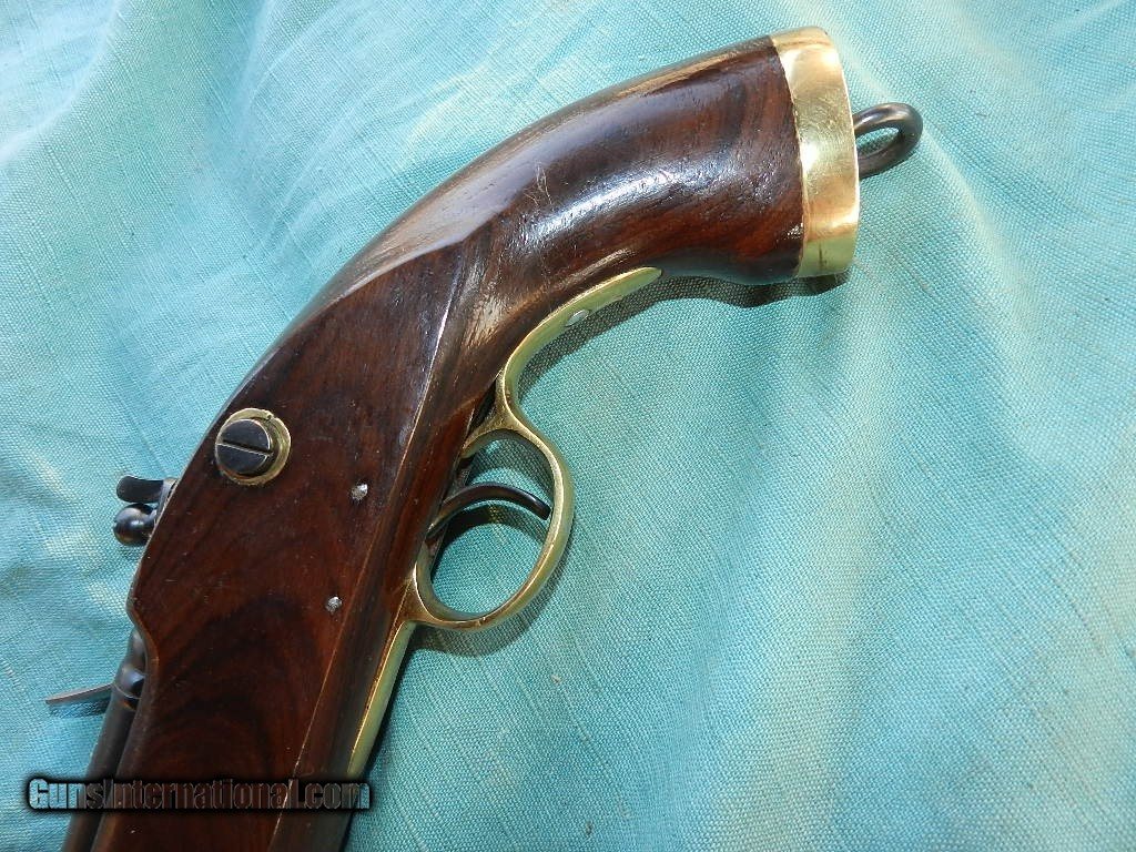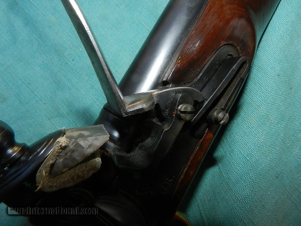 Description: A super high quality firing flintlock English Sea Service called New Service and issued 1805 for the Napoleonic Wars. Overall length is about 15 1/2", with a 9" round barrel, with a .65 smooth bore, that is excellent condition.The action is very good, and the flint showers generous sparks on the frizzen. The exterior metal is arsenal blued. The hardwood stock with a clean finish is excellent. Brass furniture is high polish. Correct lock-plate English markings. A spring mounted captured ram-rod . Overall a very respectiable shooting fintlock pistol of Historic Associaton.A newer made quality flintlock shooter. When buying a gun always have it examined by a competent gunsmith before shooting. To buy a gun from me you must get a direct email for me, with details, and shipping cost. We don’t have a web site .I prefer money orders or a check. Item ships when funds come in. I try to keep guns affordable, which means I make less money than most dealers. You won’t get altitude sickness, or nose bleed, with my prices! I consistently have the best selection of older guns If you attempt to buy, you must still contact us for details . Best to email to buy. Sometimes a local person can stop buy and purchase before the gun is removed. Sometimes not home to get calls. Some guns are required shipment to a gun dealer near you for a transfer to you when it arrives. Otherwise many older or black powder guns ship to your door. With the widest selection of older guns at great prices, We don’t have a store, and sell on the internet only. I’m easy to get along with. Thank You SOLD |
