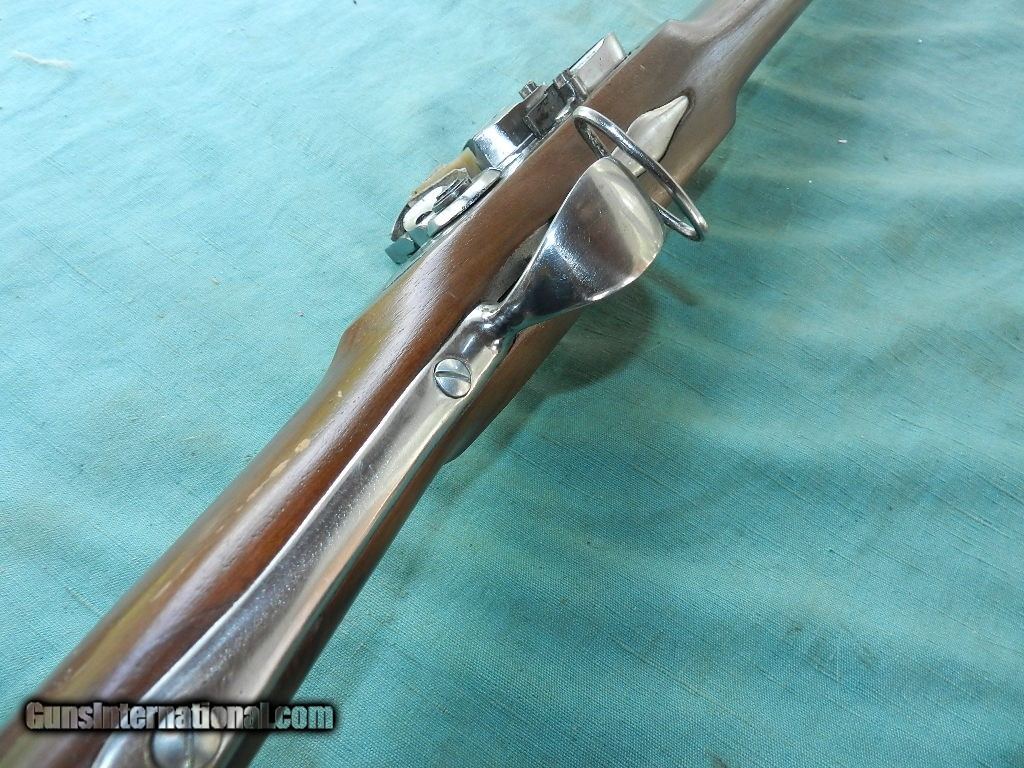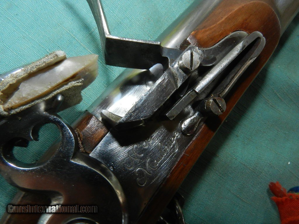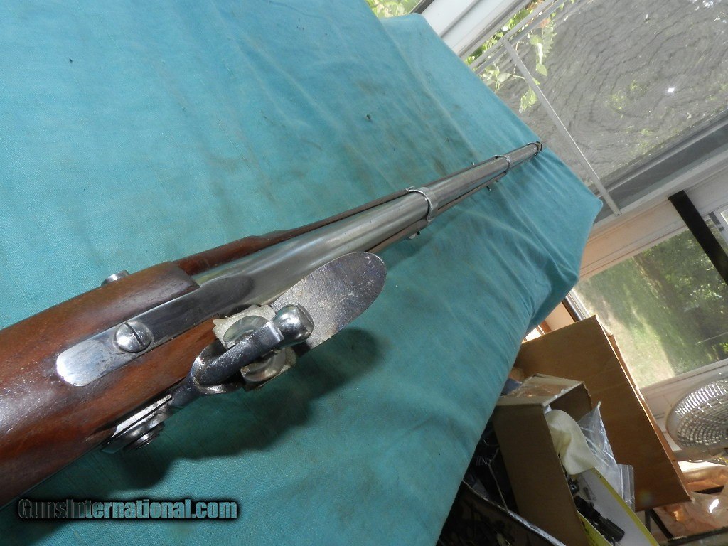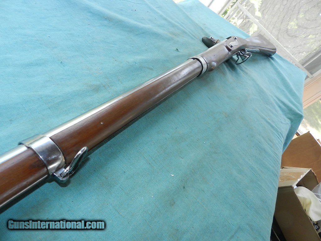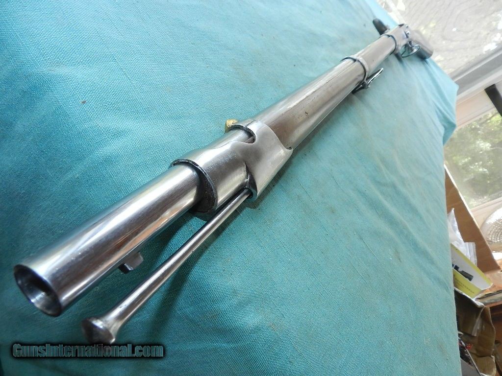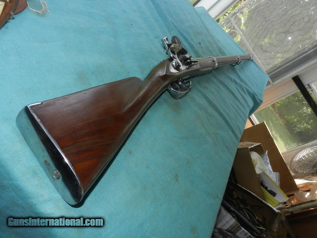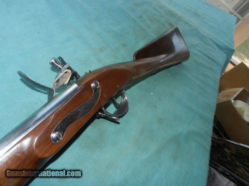 Description: A very fine French Mauberge' 1768 musket chambering the .69 cal smooth bore, and has been test fired only with the frizzen giving a generous shower of sparks. The 44 1/4" long barrel has a clean shiny bore, and the hardwood srock is clean with no wear. All metal parts are in the white as issued with an under barrel muzzle lug for a bayaonet , and an iron trumphet/tulip ram-rod. Action is good but a littel stiff and needs to be broken -in.. A great gun for an re-enactor, with an overlall length of just under 60". Always use a number 9 flint for beat resukts, When buying a gun always have it examined by a competent gunsmith before shooting. To buy a gun from me you must get a direct email for me, with details, and shipping cost. We don’t have a web site .I prefer money orders or a check. Item ships when funds come in. I try to keep guns affordable, which means I make less money than most dealers. You won’t get altitude sickness, or nose bleed, with my prices! I consistently have the best selection of older guns If you attempt to buy, you must still contact us for details . Best to email to buy. Sometimes a local person can stop buy and purchase before the gun is removed. Sometimes not home to get calls. Some guns are required shipment to a gun dealer near you for a transfer to you when it arrives. Otherwise many older or black powder guns ship to your door. With the widest selection of older guns at great prices, We don’t have a store, and sell on the internet only. I’m easy to get along with. Thank You SOLD |