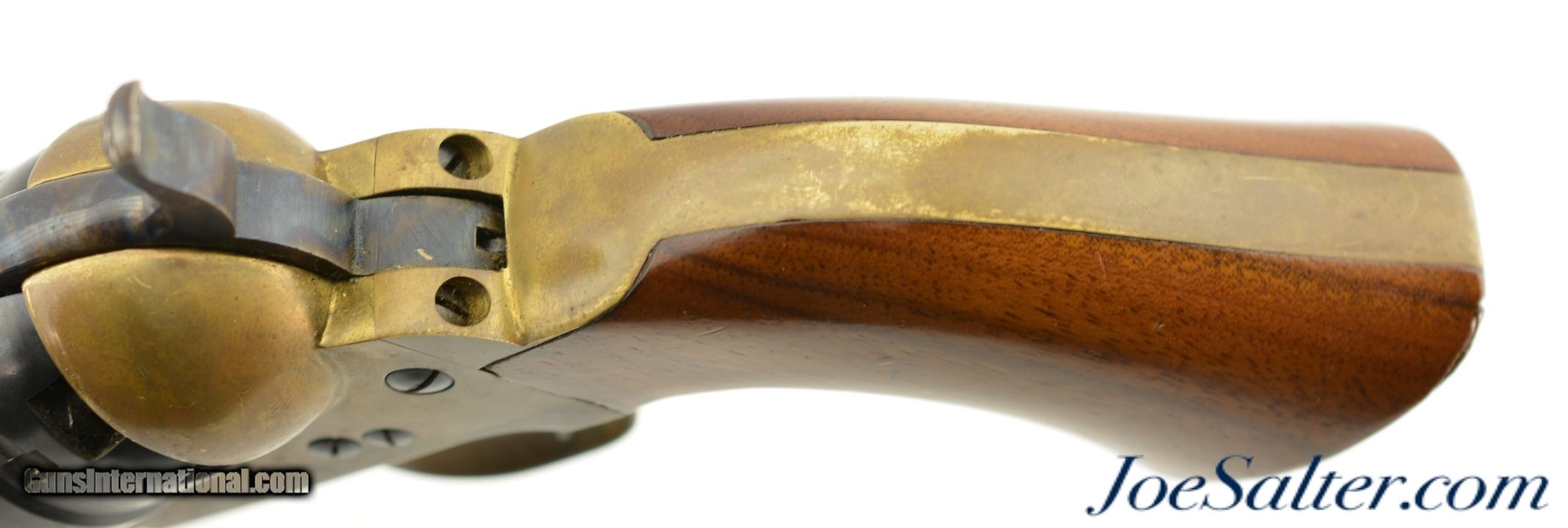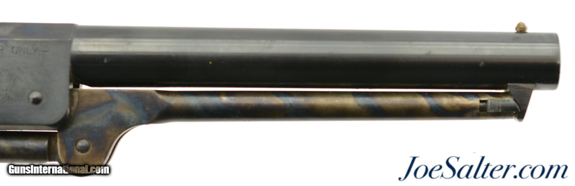 Description: Serial #20526, .44 Caliber black powder percussion, 7.5 inch round barrel with an excellent bore. This is a Navy Arms "Reb Model" 1851 revolver featuring a plain, recessed cylinder manufactured by Uberti in Italy. In excellent condition the barrel and cylinder retain about 95-97% of the original blue finish with some very minor handling and storage marks. The color case-hardened loading lever and hammer show vibrant original case-hardened colors and the brass frame has a pleasing aged patina. The walnut grips rate about excellent with some light use marks. Antique SOLD |