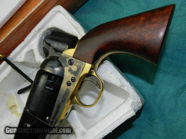 Description: A boxed Colt Navy made by F. LLipietta with a spare cylinder, nipple wrench, and powder flask. This was marketed by Cabela's many years ago and not available at this time. The Gun is all factory blue and wasn't used much with a good bore, and locks up tight. Action is a little stiff from non use and storage. This set-up is a good deal and this gun was made over 20 years ago. Due to the high volume of emails, I can’t keep up with over 200 a day, please be patient, when corresponding thanks . We don’t have asite .I prefer money orders or a check. Item ships when funds come in. If you can only pay with a card let me know. I’m sorry I don’t list my phone number, did that for 30 days, never again.. I can’t talk on the phone all day…who will ship the guns? I’m just one person, and it’s very busy here! I do a brisk volume! I hope you like my wide selection of unusual guns, knives and gun parts. Shipping price determined by zip code. I try to keep the prices affordable, which means I make less money than most dealers. You won’t get altitude sickness with my prices! I consistently have the best selection of older guns If you BUY IT NOW you must still contact us for details buy it now doesn't end the sale, it just sends an email telling us you want to buy this gun. A phone call won’t secure a sale! Not home many times, the first buyer by email buys the gun !Thissite does not close down a sale when you do a BUY IT NOW like Ebay! I can get six buy it nows in an hour, first buyer to email gets the guns, others are in second place! Best to send another email . Sometimes not home to get calls. Some guns are required shipment to a gun dealer near you for a transfer to you when it arrives. With the widest selection of older guns at great prices, We don’t have a store, and sell on the internet only. SOLD |