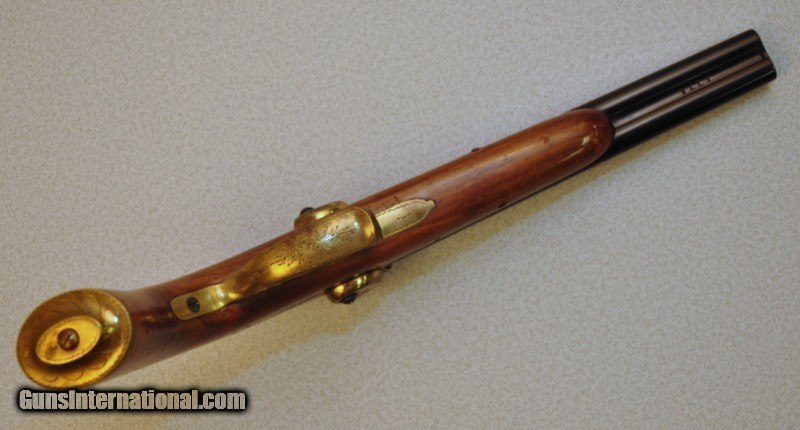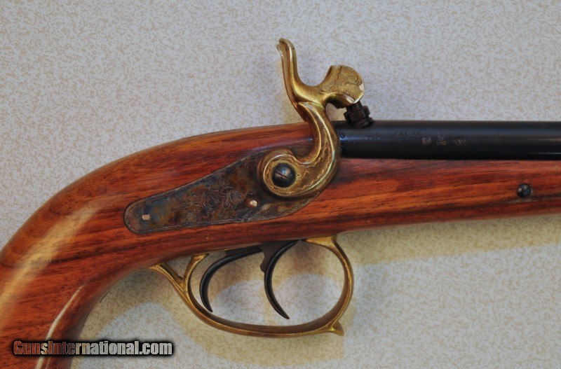 Description: 36 cal. S# 1771. 8" round bbls. with rifled bores. Engraved case colored back action locks. Ornate brass finished hammers. Walnut stock. Brass trigger guard & buttcap. Mfg in Italy. 95% metal finish. Original stock finish showing sttered scratches & mrks. Very good bright bores. Sound locks. SOLD Antique: Yes |