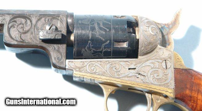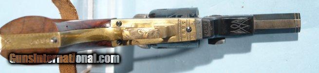 Description: ITALIAN REPRODUCTION ENGRAVED COLT BABY DRAGOON .31 CAL. PERCUSSION 4” REVOLVER ca. 1970’s. Excellent quality copy of the original and in mint condition. Unfired. Fine engraving and very handsome burl walnut grips. SOLD |
