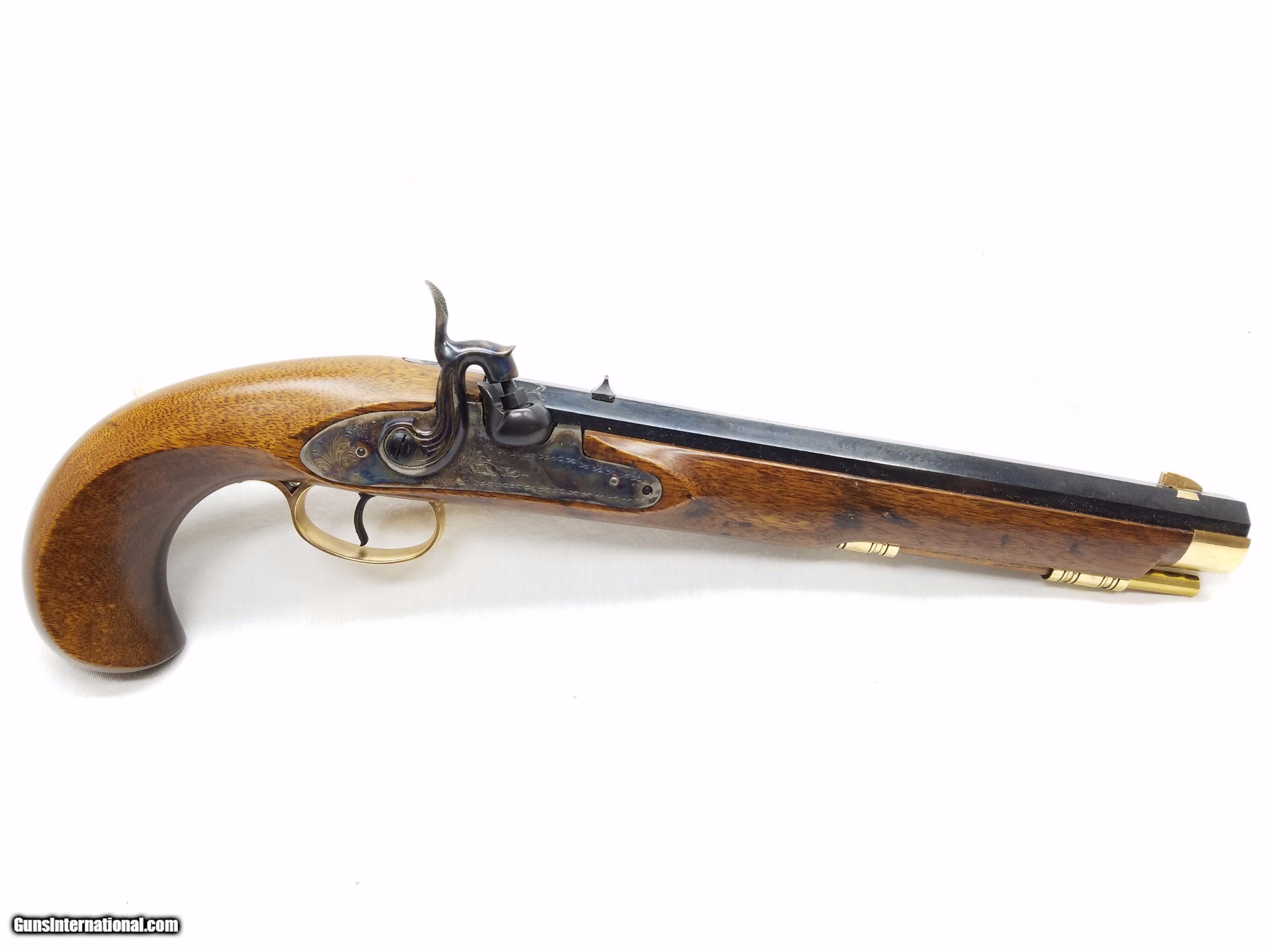 Description: This .45 caliber Kentuckian pistol has a blued octagon 13/16" x 9-3/4" barrel fitted with fixed sights. The bore is very good. The P grade European Walnut stock is mounted with brass furniture. A factory engraved color cased hardened percussion lock is activated by a single trigger. Factory wood to metal fit - made by Investarms. Condition: Good. Our stock #P-27-89 Willing to ship anywhere in the US, buyer pays shipping and insurance. SOLD Manufacturer: Investarms Model: Kentuckian Caliber Info: 45 black powder Bore: Rifled Condition: Good Metal Condition: Good Wood Condition: Good Bore Condition: Very Good Barrels: 1 Action: Percussion Triggers: 1 Stock: European Walnut Sights: Fixed |
