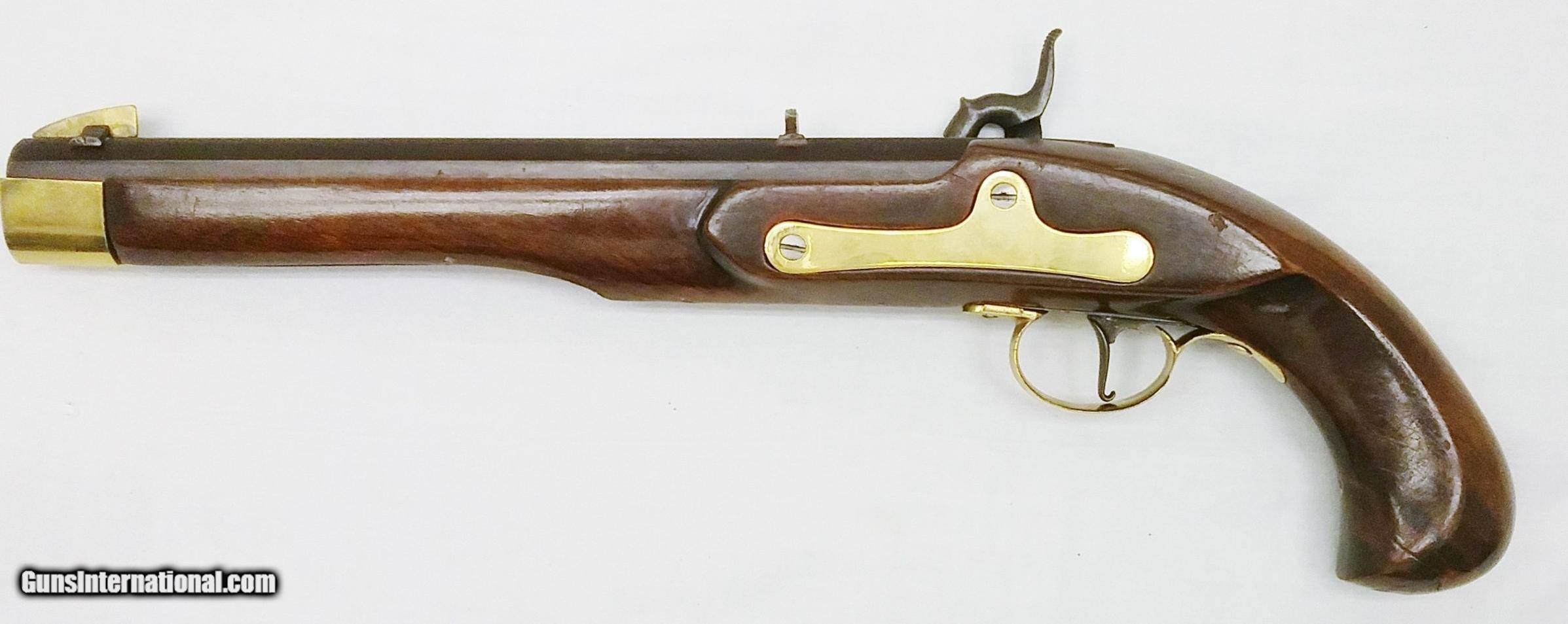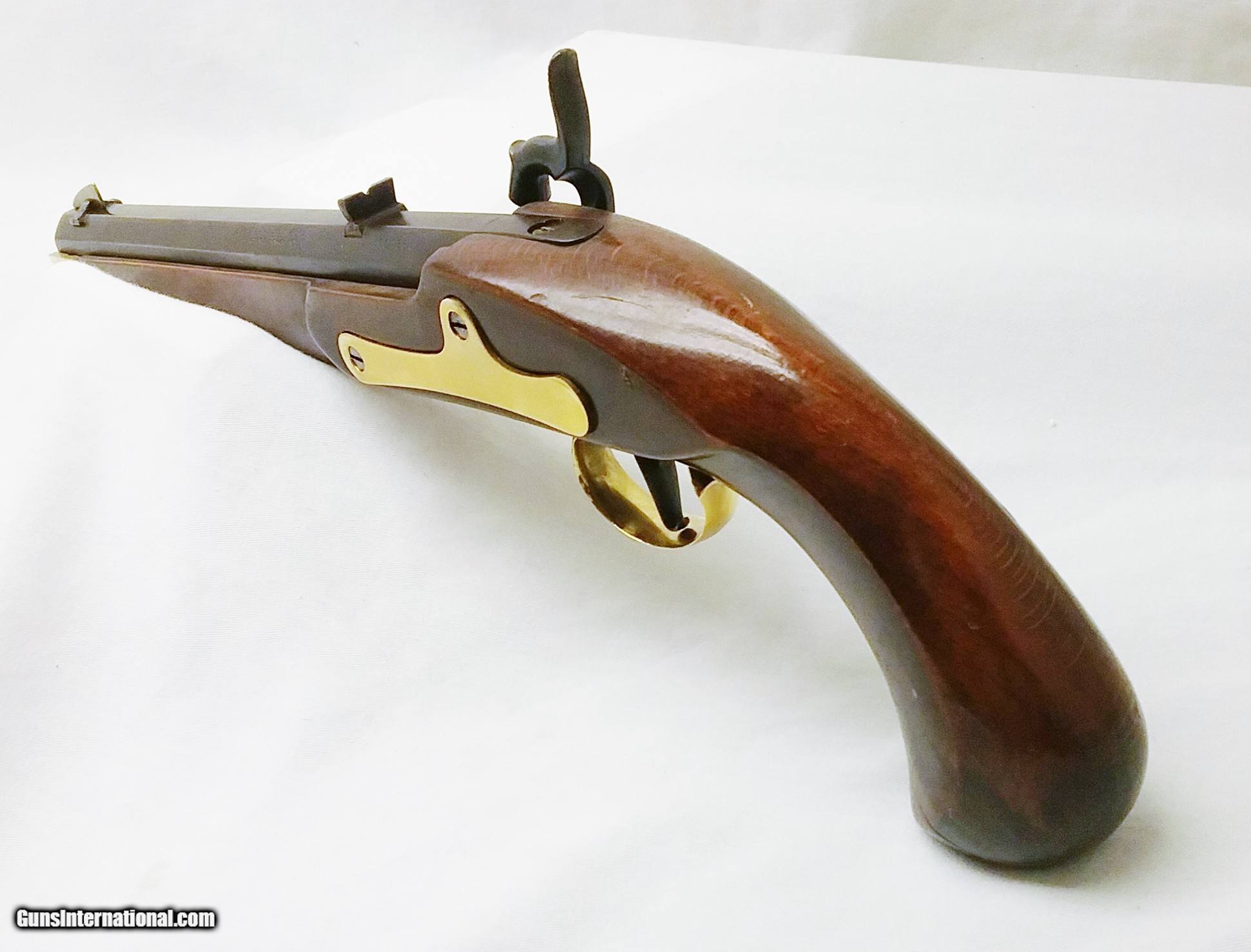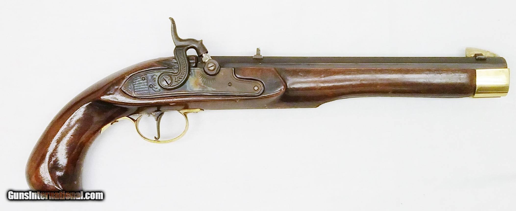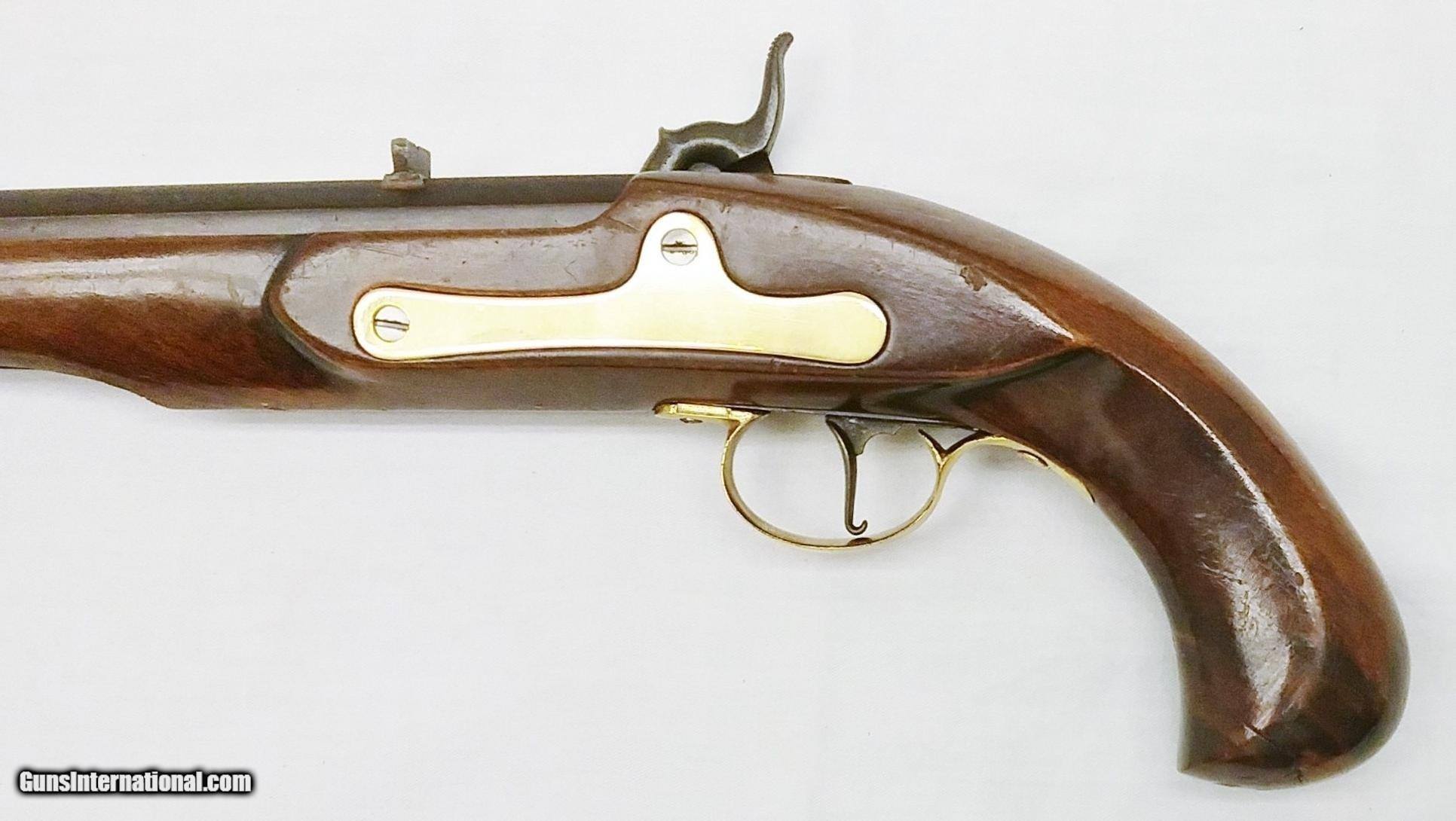 Description: This .45 caliber Kentucky pistol has a browned octagon 7/8" x 9-1/2" barrel that is fitted with fixed sights. The bore is good. The P grade Select Hardwood stock is mounted with brass furniture. A factory engraved percussion lock is activated by a single trigger. Please Note: This is a poorly assembled kit that is missing the ramrod and thimble. The lock functions perfectly and the stock is sound. It is being sold AS-IS. Overall length is 15-1/2", weight is 2 lbs, 6 oz. Factory wood to metal fit - made by Jukar. Condition: Fair to Good - AS-IS. Our stock number is P-29-32. Will ship anywhere in the United States. Buyer pays freight and insurance. SOLD Manufacturer: Jukar Model: Kentucky Caliber Info: 45Cal Bore: Rifled Condition: Fair to Good Metal Condition: Fair to Good Wood Condition: Fair to Good Bore Condition: Good Barrels: One Barrel Type: Octagon Action: Percussion Triggers: Single Stock: Select Hardwood Finish: Browned Weight: 2 lbs, 6 oz Sights: Fixed |