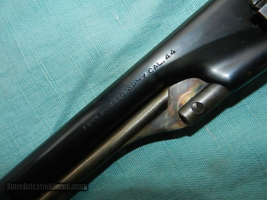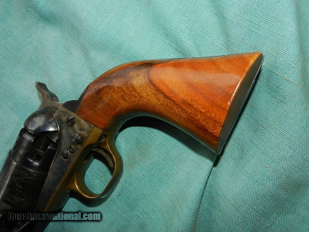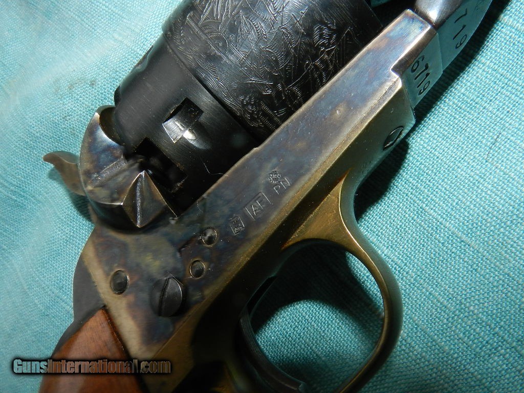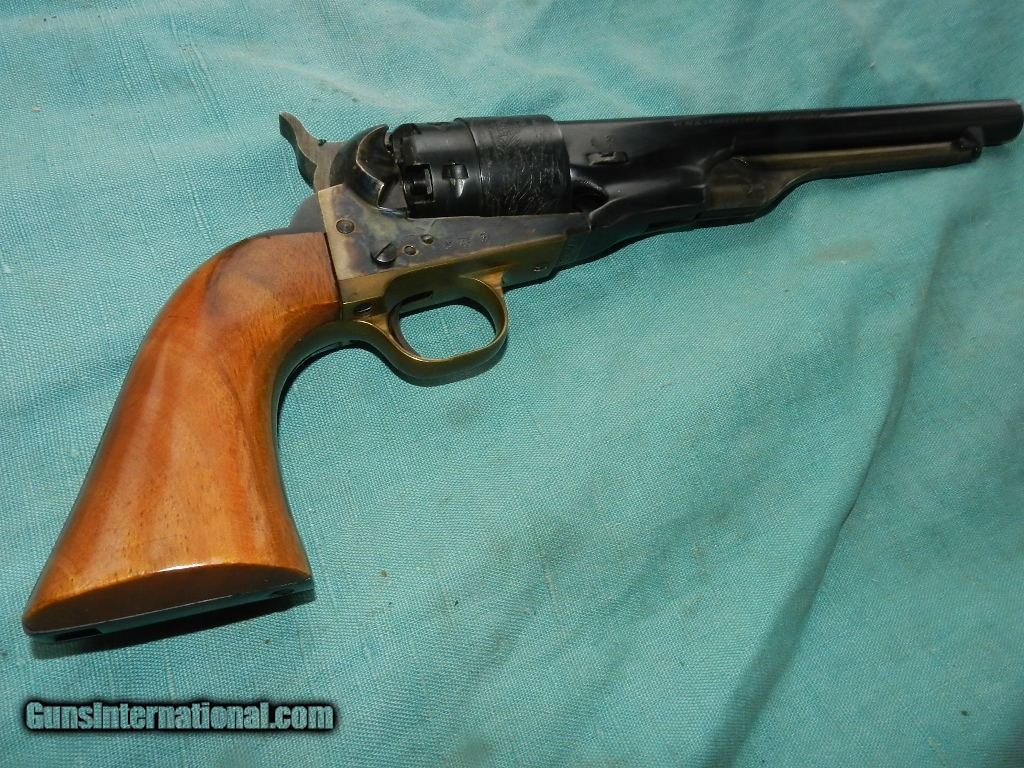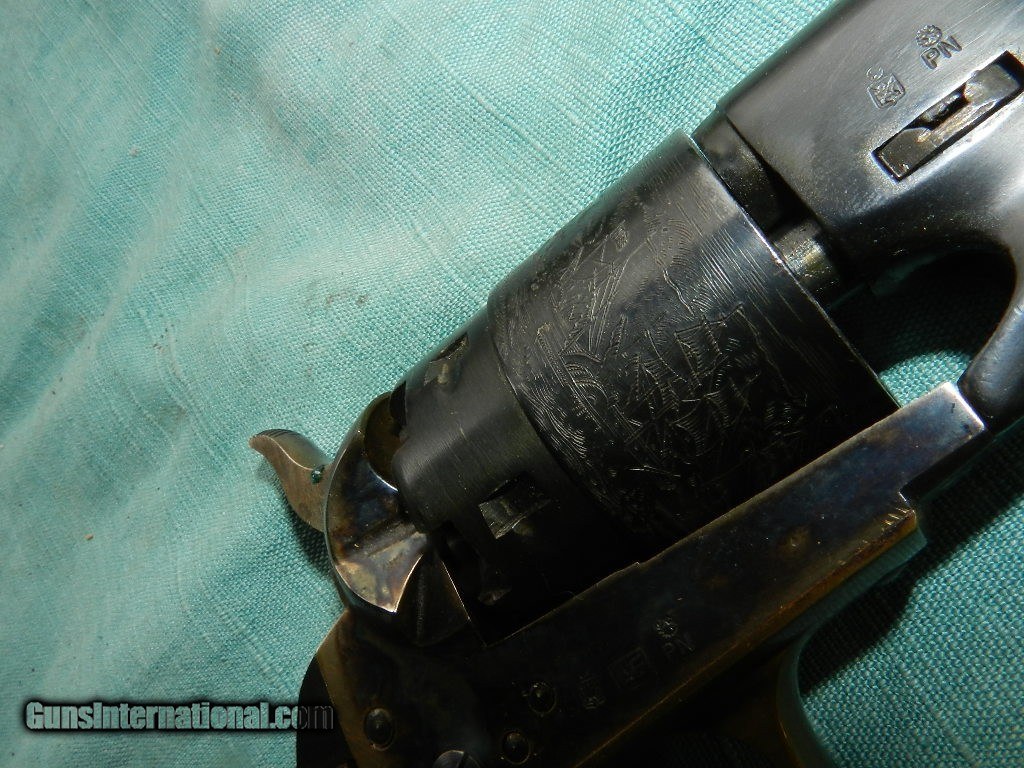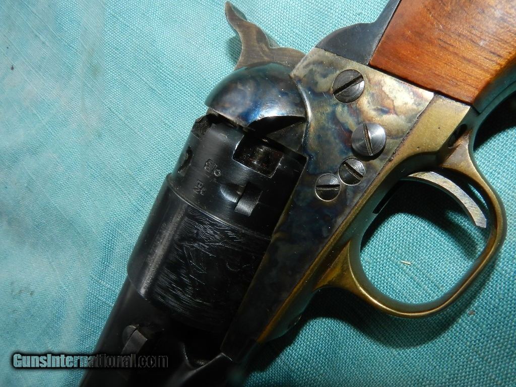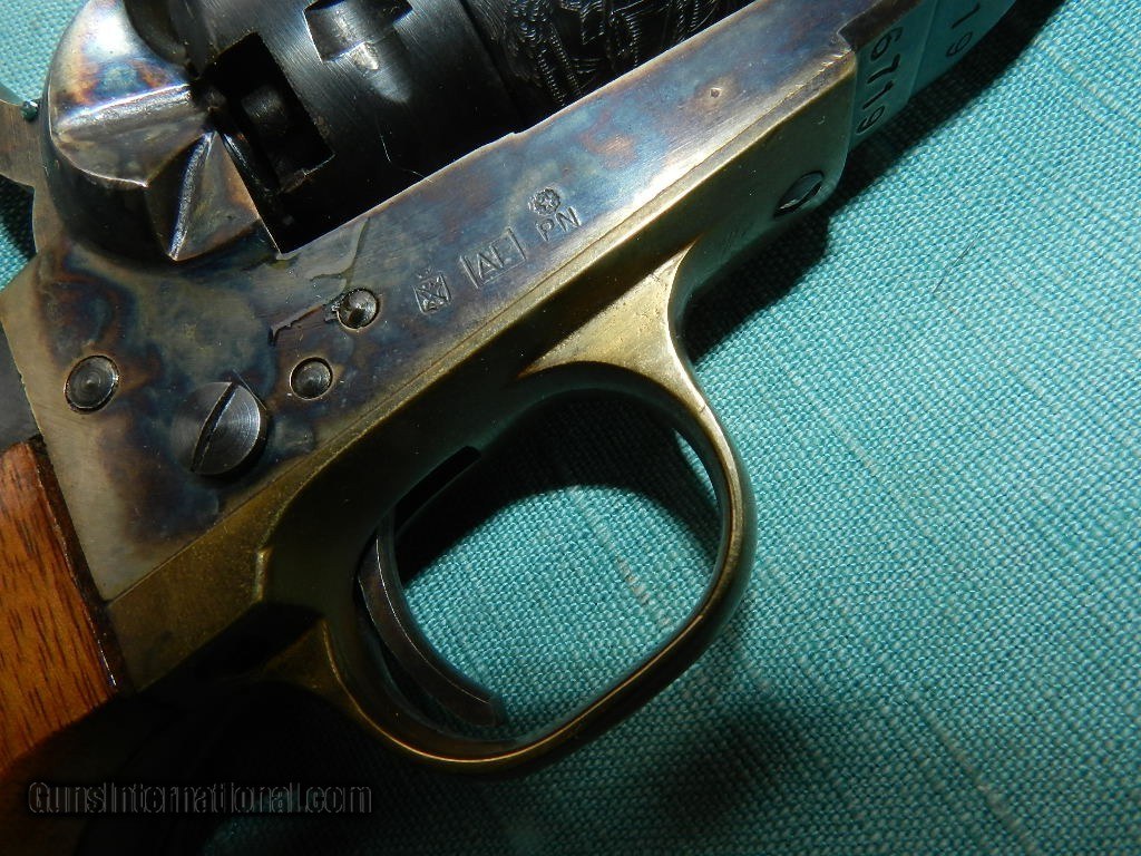 Description: SOLD A very clean older 1980 made Colt 1851 Navy with a serial #194190, and a ..36 cal., 7 1/2" ''octagonal barrel with an excellent bore. The metal surfaces of the barrel, backstrap and cylinder retain about 99% original blue with a few handling marks, the case-hardened colors of the frame and hammer remain vibrant with a few handling marks and the loading lever has toned to pewter with the ram retaining vibrant colors. The brass triggerguard strap has toned to an even dark ochre. The smooth one-piece factory Italian walnut grips rate excellent. The gun still functions mechanically with good timing and lock up, with clean clear nipples, appears to have not been fired. These fine guns were imported by Navy Arms that selected all thier firearms for fit and finish, from Uberti, and L.lPietta. An all steeel coor cased hardened frame like the original Colt.When buying a gun always have it examined by a competent gunsmith before shooting. To buy a gun from me you must get a direct email for me, with details, and shipping cost. We don’t have a web site .I prefer money orders or a check. Item ships when funds come in. I try to keep guns affordable, which means I make less money than most dealers. You won’t get altitude sickness, or nose bleed, with my prices! I consistently have the best selection of older guns If you attempt to buy, you must still contact us for details . Best to email to buy. Sometimes a local person can stop buy and purchase before the gun is removed. Sometimes not home to get calls. Some guns are required shipment to a gun dealer near you for a transfer to you when it arrives. Otherwise many older or black powder guns ship to your door. With the widest selection of older guns at great prices, We don’t have a store, and sell on the internet only. I’m easy to get along with. Thank You SOLD |