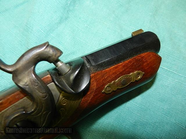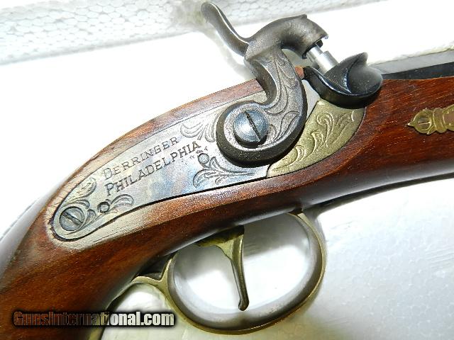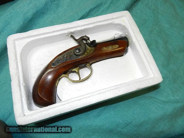 Description: NOS fine condition, and good working percussion Derringer , with lock plate engraved : PHILDELPHIA DERRINGER.Octagonal blued barrel is 3 " long and is color case hardened. and stamped Spain.Caliber is .45. Hardwood stock is very good condition, with varnish. Brass furniture is good. Barrel held into stock with a pin, and escutcheon plate.!Bore is rifled and very good condition, and appears unfired. Comes with a CVA box and sleeve. We don’t have asite .I prefer money orders or a check. Item ships when funds come in. If you can only pay with a card let me know. I hope you like my wide selection of unusual guns, knives and gun parts. Shipping price determined by zip code. I try to keep the prices affordable, which means I make less money than most dealers. You won’t get altitude sickness with my prices! I consistently have the best selection of older guns If you BUY IT NOW you must still contact us for details buy it now doesn't end the sale, it just sends an email telling us you want to buy this gun. A phone call won’t secure a sale! Not home many times, the first buyer by email buys the gun !Thissite doesnot close down a sale when you do a BUY IT NOW like Ebay!I can get six buy it nows in an hour, first buyer to email gets the guns, others are in second place! Best to send another email . Sometimes not home to get calls. Some guns are required shipment to a gun dealer near you for a transfer to you when it arrives. With the widest selection of older guns at great prices, We don’t have a store, and sell on the internet only. SOLD |