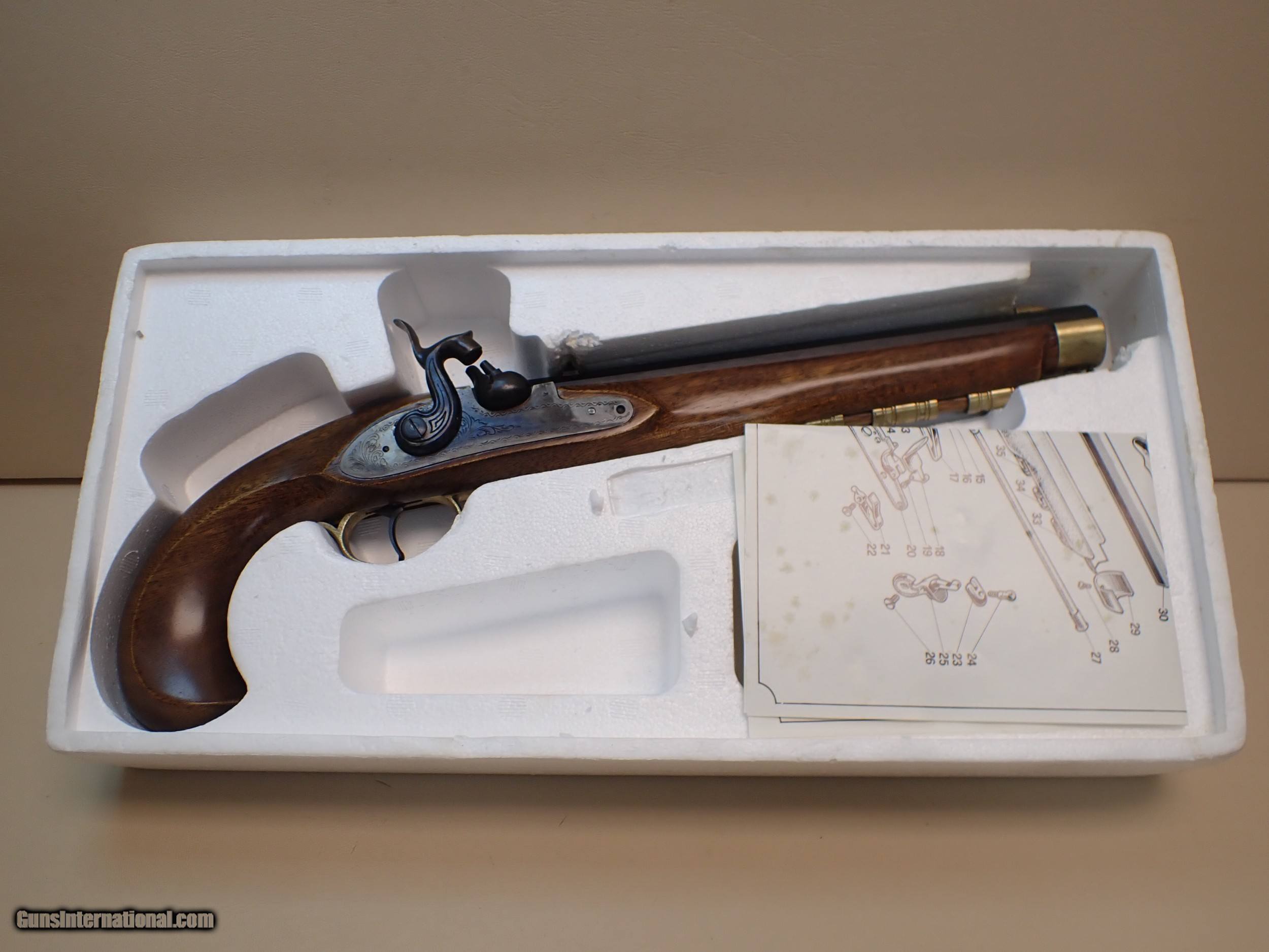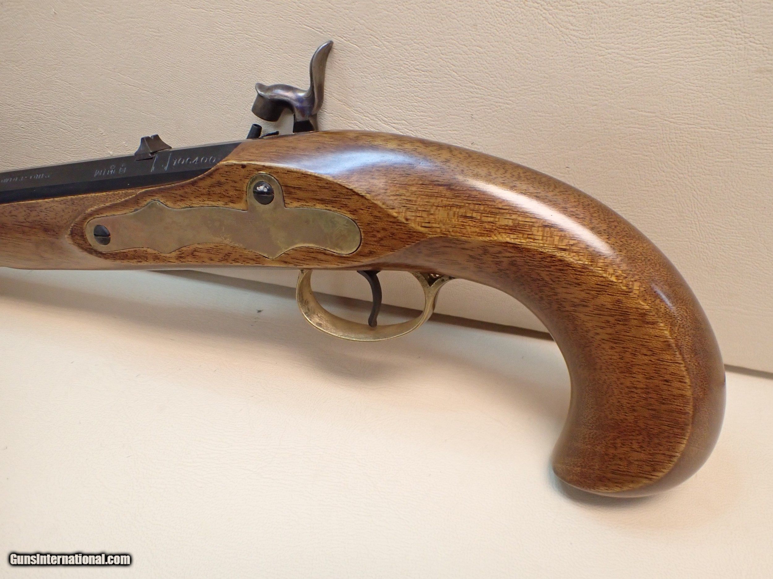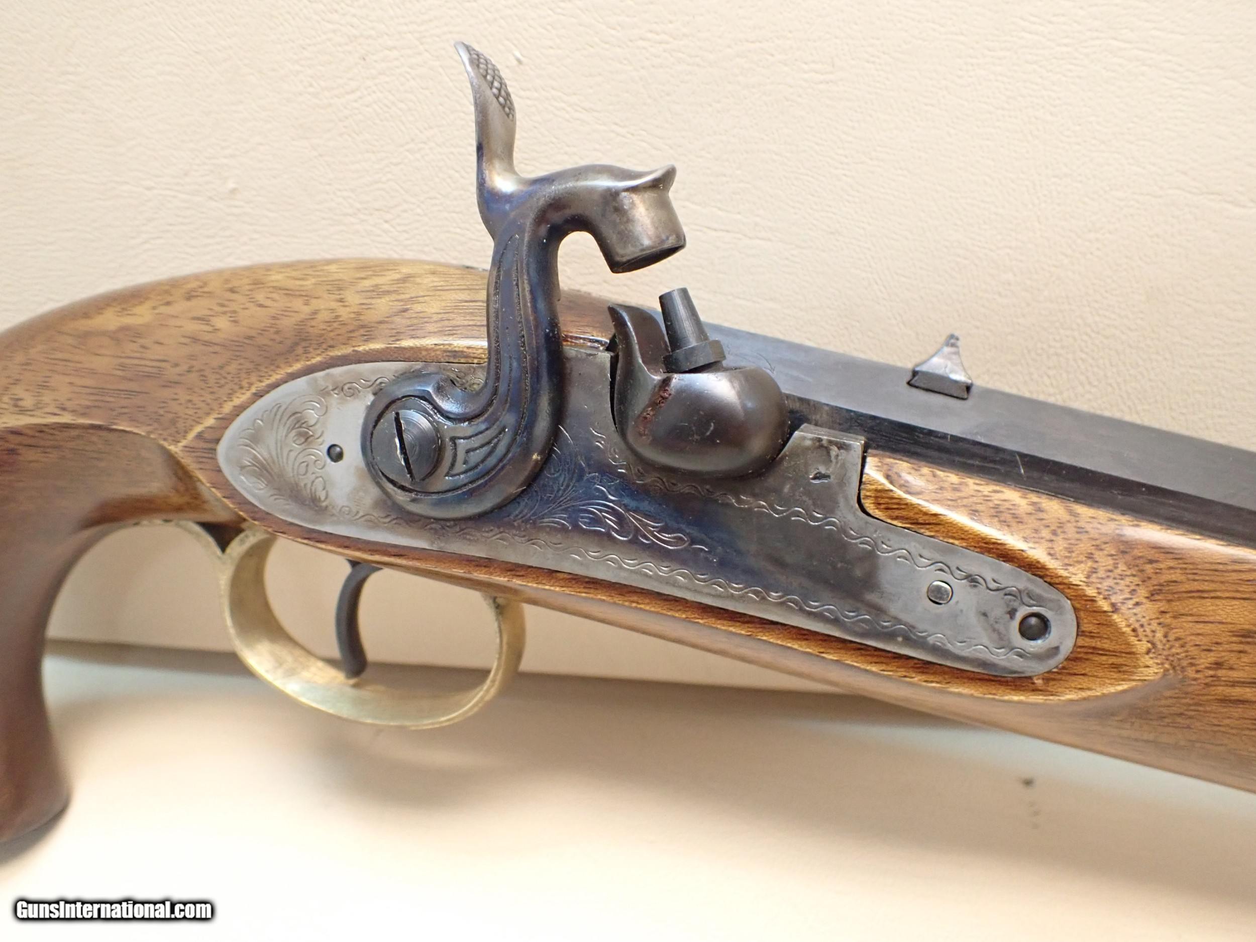 Description: Italian-Made "Kentucky Pistol" .45 caliber black powder percussion pistol, most likely manufactured by Pietta. This pistol features a hardwood stock with a blued octagonal barrel, and color case hardened lock plate, and brass fittings, making a very attractive and handy little pistol. The pistol is in great overall condition and appears to have seen very little use, as shown. The lock operates properly and the bore looks great. Includes the factory box and manual. Please refer to the photos prior to purchase. A great pistol for some black powder fun! No FFL required, proof of age required. SOLD Manufacturer: Pietta Model: Kentucky Serial Number: 21542 |