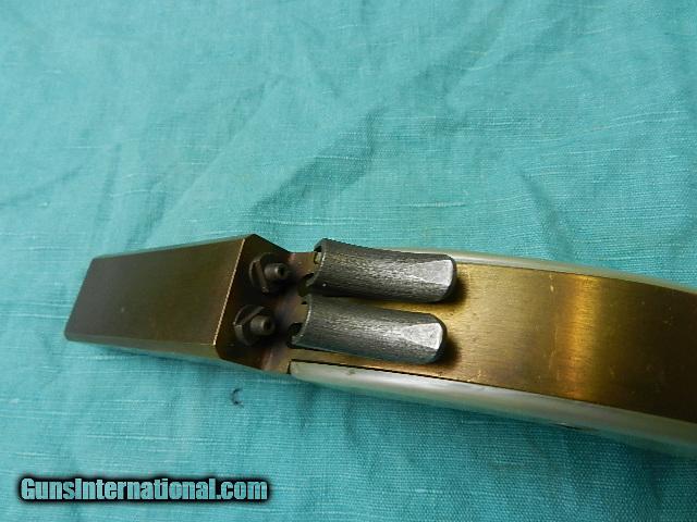 Description: SNAKE EYE DERRINGER with clean smooth bores on the 3 1/8" barrels. Metal is mellow brass, and the smooth bores look un-fired. Has very clean white hard plastic grips that look like a mother of pearl look. Gun measures about 7" overall, and the nipples look like the gun hasn't been fired. Hammers pulled back with one single trigger right barrel fires first then the left barrel fires secondly. A rugged, tough .hide away 36 cal. muzzle loader. Due to the high volume of emails, I can’t keep up with over 200 a day, please be patient, when corresponding thanks . We don’t have asite .I prefer money orders or a check. Item ships when funds come in. If you can only pay with a card let me know. I’m sorry I don’t list my phone number, did that for 30 days, never again.. I can’t talk on the phone all day…who will ship the guns? I’m just one person, and it’s very busy here! I do a brisk volume! I hope you like my wide selection of unusual guns, knives and gun parts. Shipping price determined by zip code. I try to keep the prices affordable, which means I make less money than most dealers. You won’t get altitude sickness with my prices! I consistently have the best selection of older guns If you BUY IT NOW you must still contact us for details buy it now doesn't end the sale, it just sends an email telling us you want to buy this gun. A phone call won’t secure a sale! Not home many times, the first buyer by email buys the gun !Thissite does not close down a sale when you do a BUY IT NOW like Ebay! I can get six buy it nows in an hour, first buyer to email gets the guns, others are in second place! Best to send another email . Sometimes not home to get calls. Some guns are required shipment to a gun dealer near you for a transfer to you when it arrives. With the widest selection of older guns at great prices, We don’t have a store, and sell on the internet only. SOLD |