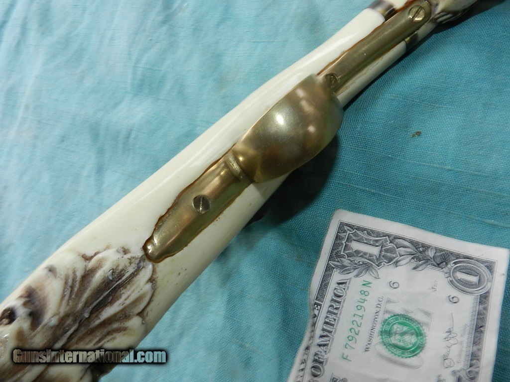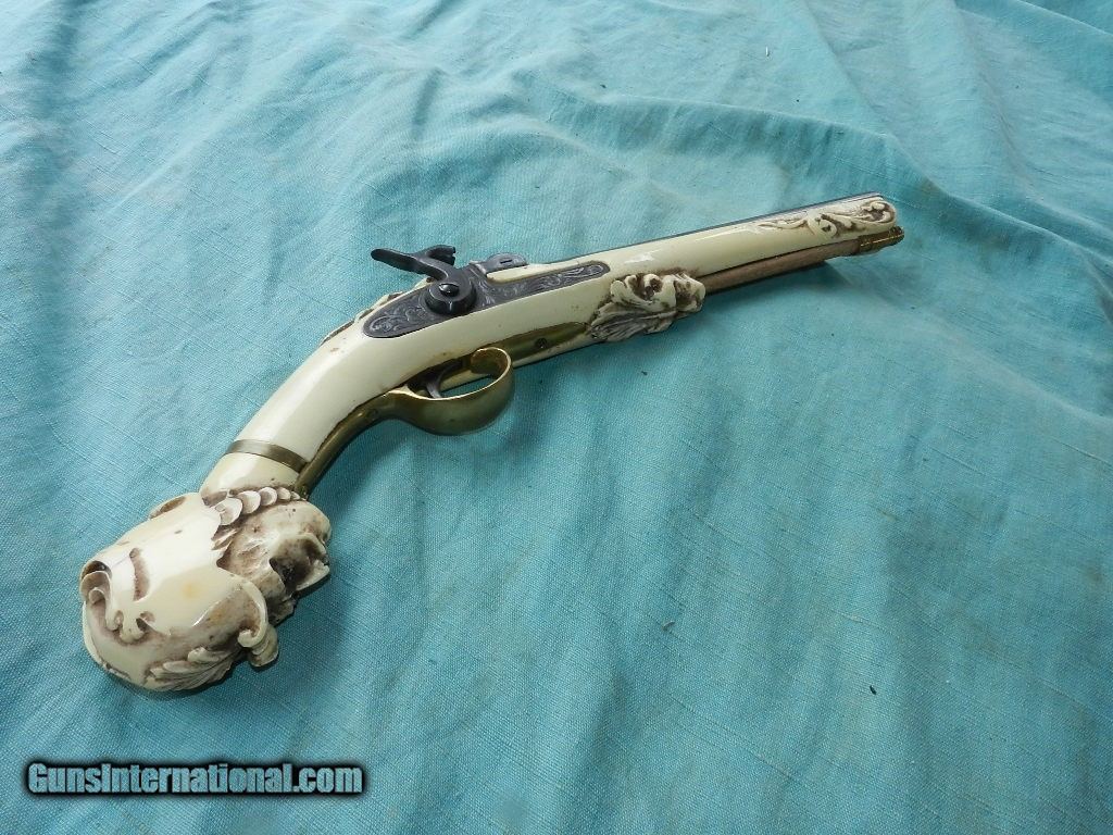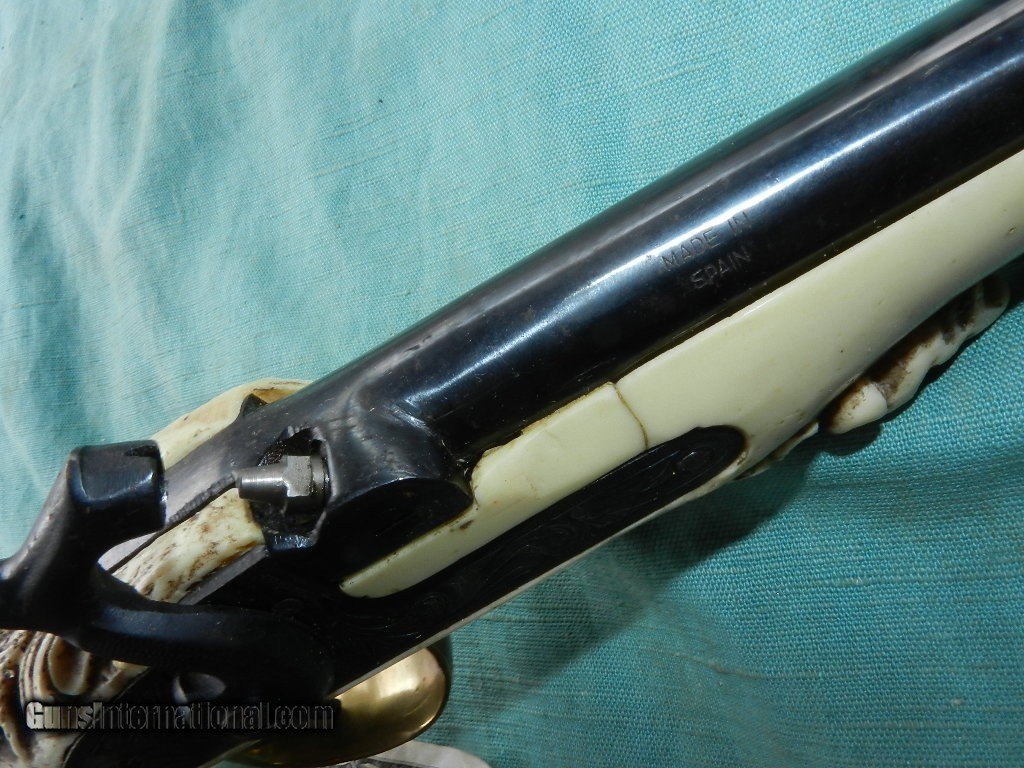 Description: I have seen two of these in my life and they were imported from Spain in the 1950's thru 1960's and they are a firing model, with a blued round barrel of about 9", and a smooth bore of .45cal/ This fine percussion has a fully blued barel and chisel engraved lock. Looks like it may never have been fired. The action works well, and the stock mayerial appears to be some time of aged mellow white nylon/plastic with a Conquistador head on the pommel and the lion's head for the ram-rod ferrule. Comes with a hardwood ram-rod with a brass tip. Brass trigger guard and ram-rod ferrule.Condition overall is clean with some agestress cracks, but solid , one above the front of the lock-plate and near the front wedge/pin.Would make a great pirate display. When buying a gun always have it examined by a competent gunsmith before shooting. To buy a gun from me you must get a direct email for me, with details, and shipping cost. We don’t have a web site .I prefer money orders or a check. Item ships when funds come in. I try to keep guns affordable, which means I make less money than most dealers. You won’t get altitude sickness, or nose bleed, with my prices! I consistently have the best selection of older guns If you attempt to buy, you must still contact us for details . Best to email to buy. Sometimes a local person can stop buy and purchase before the gun is removed. Sometimes not home to get calls. Some guns are required shipment to a gun dealer near you for a transfer to you when it arrives. Otherwise many older or black powder guns ship to your door. With the widest selection of older guns at great prices, We don’t have a store, and sell on the internet only. I’m easy to get along with. Thank You SOLD |
