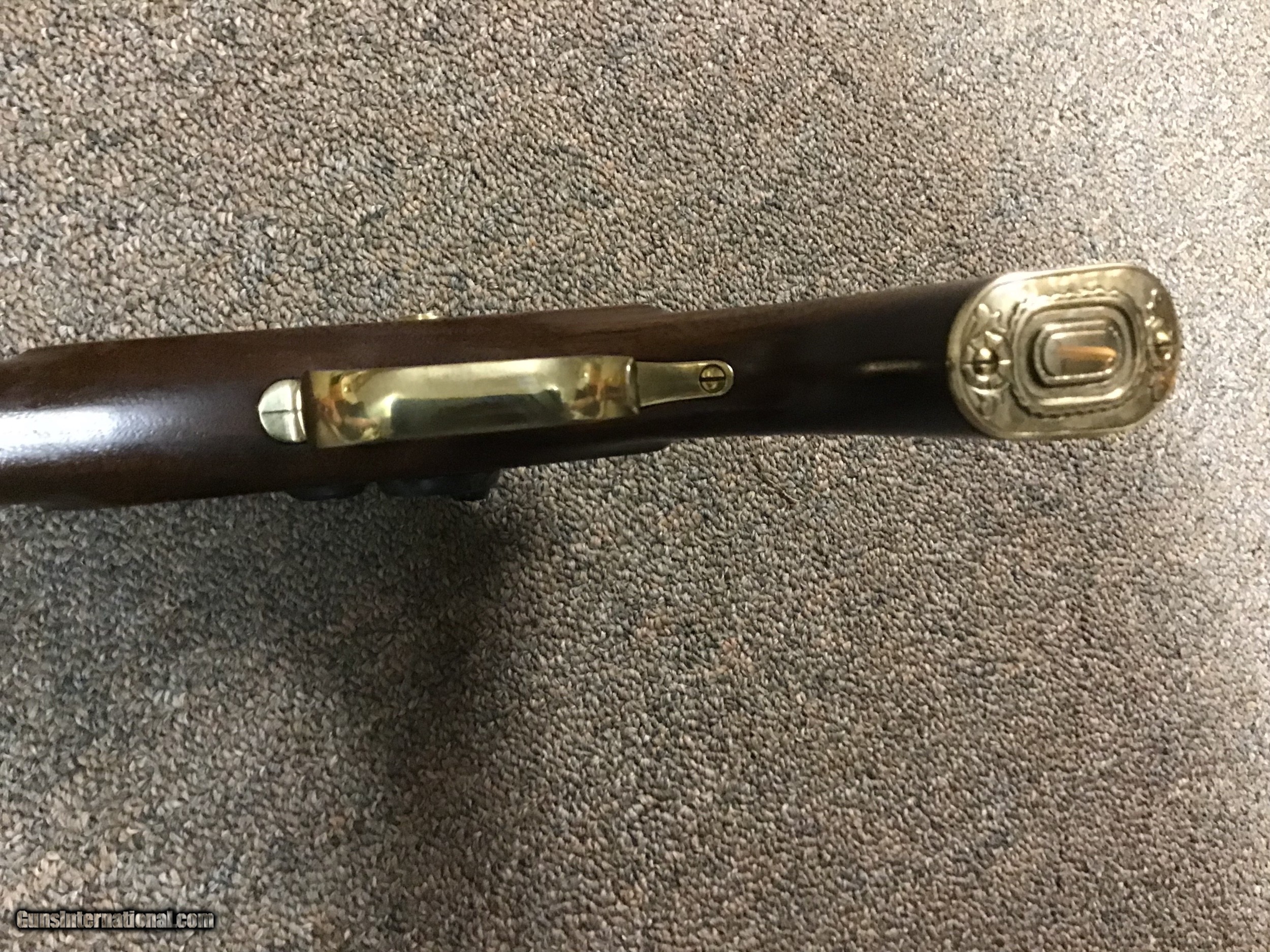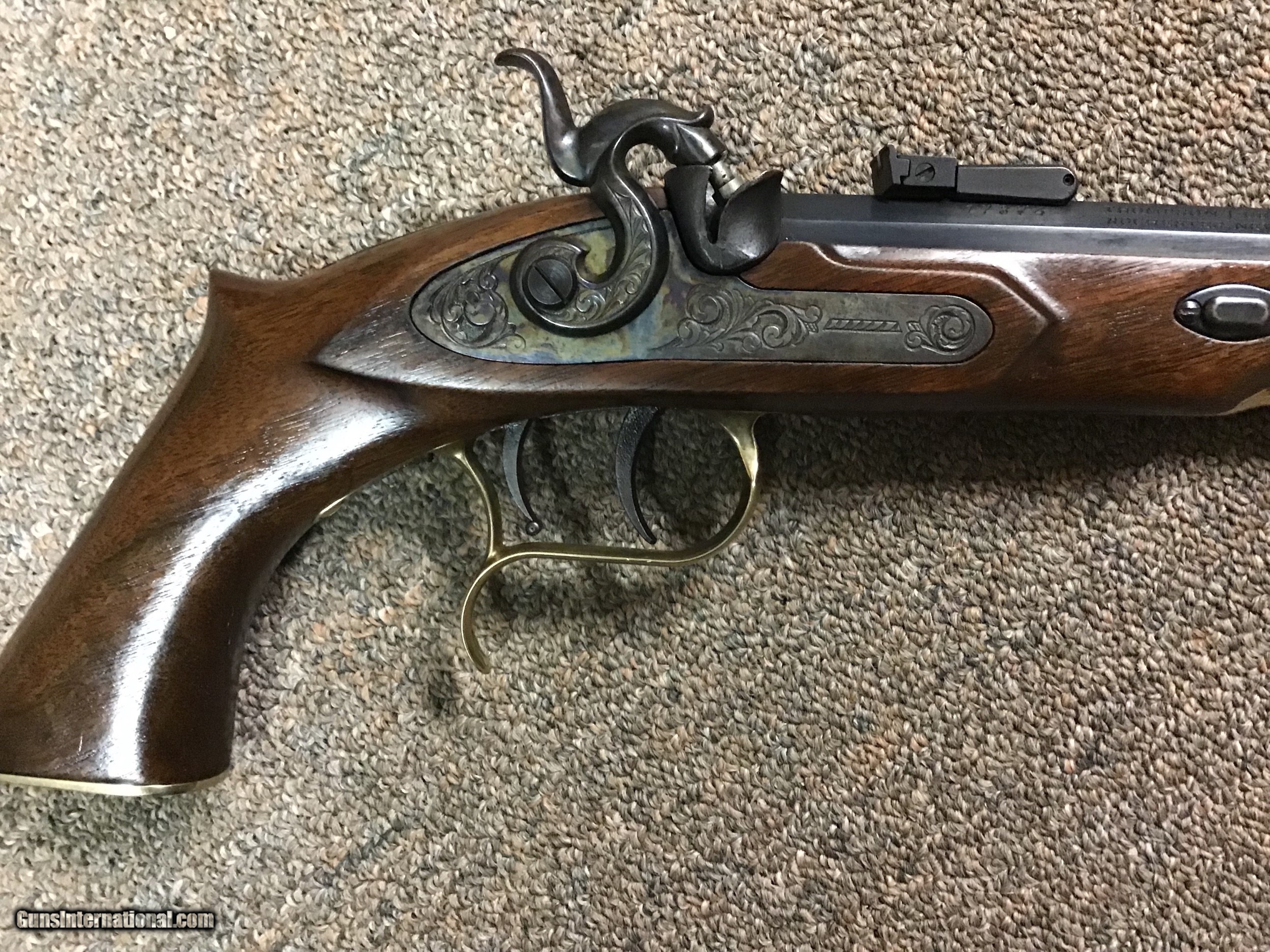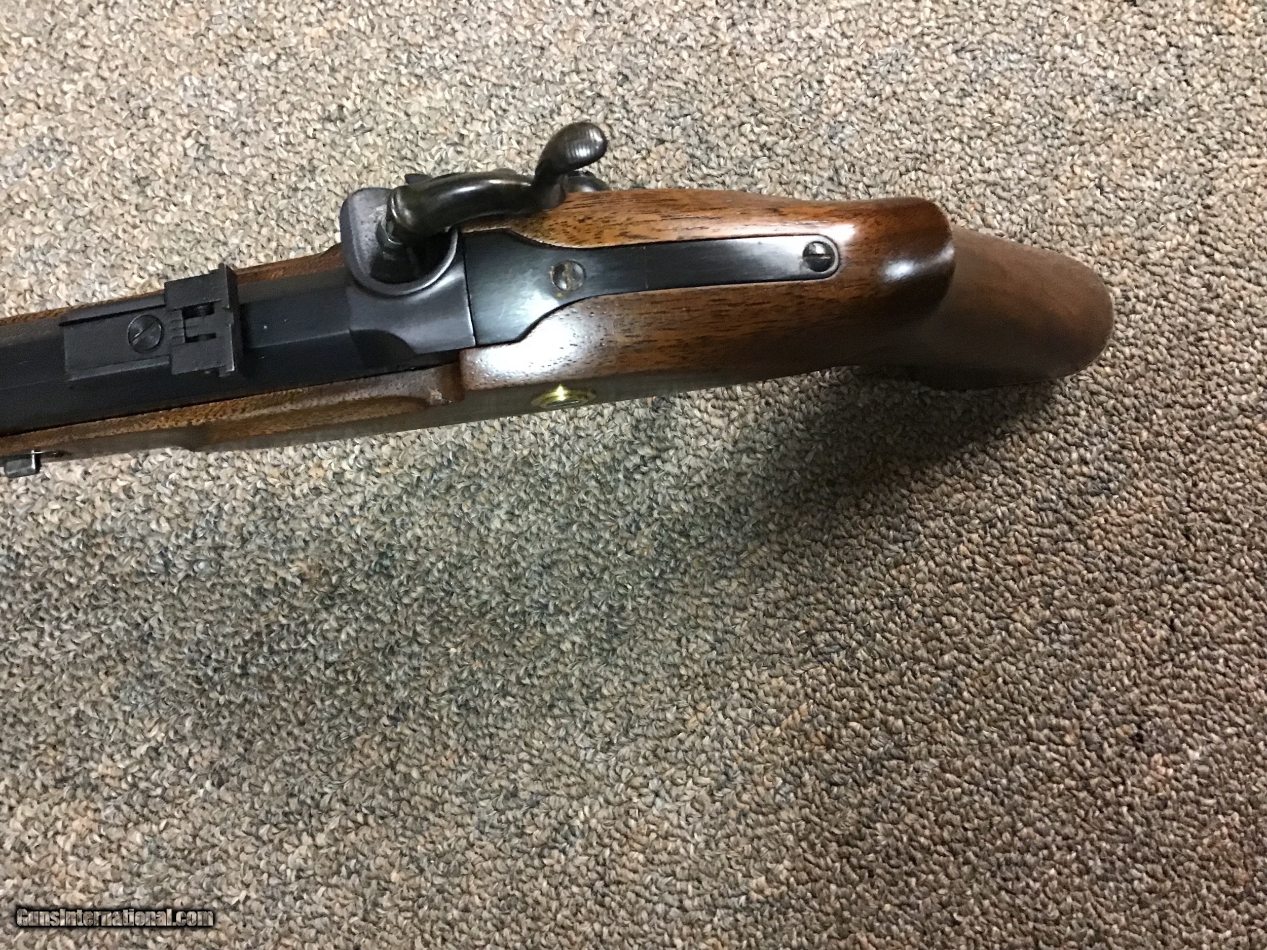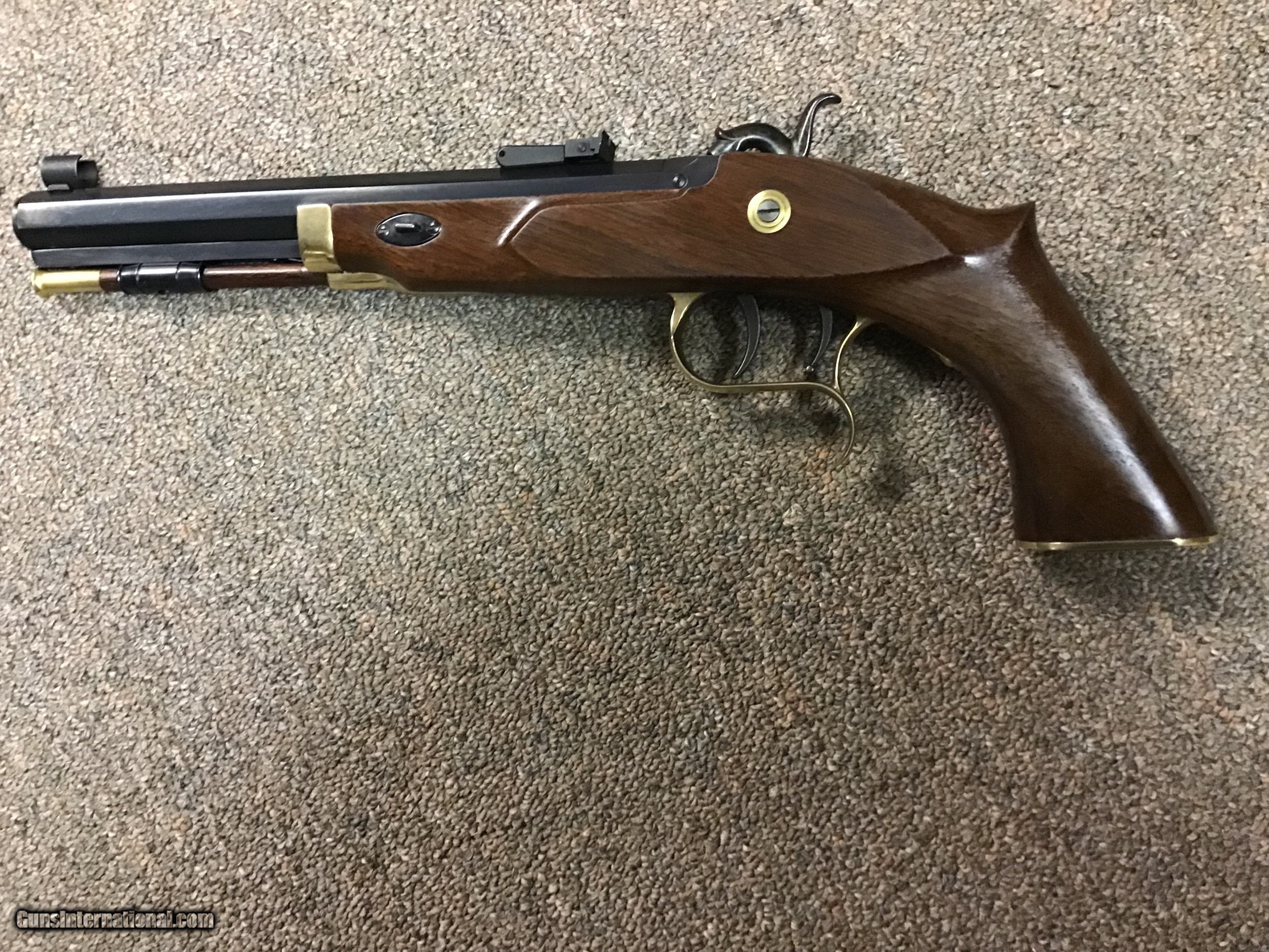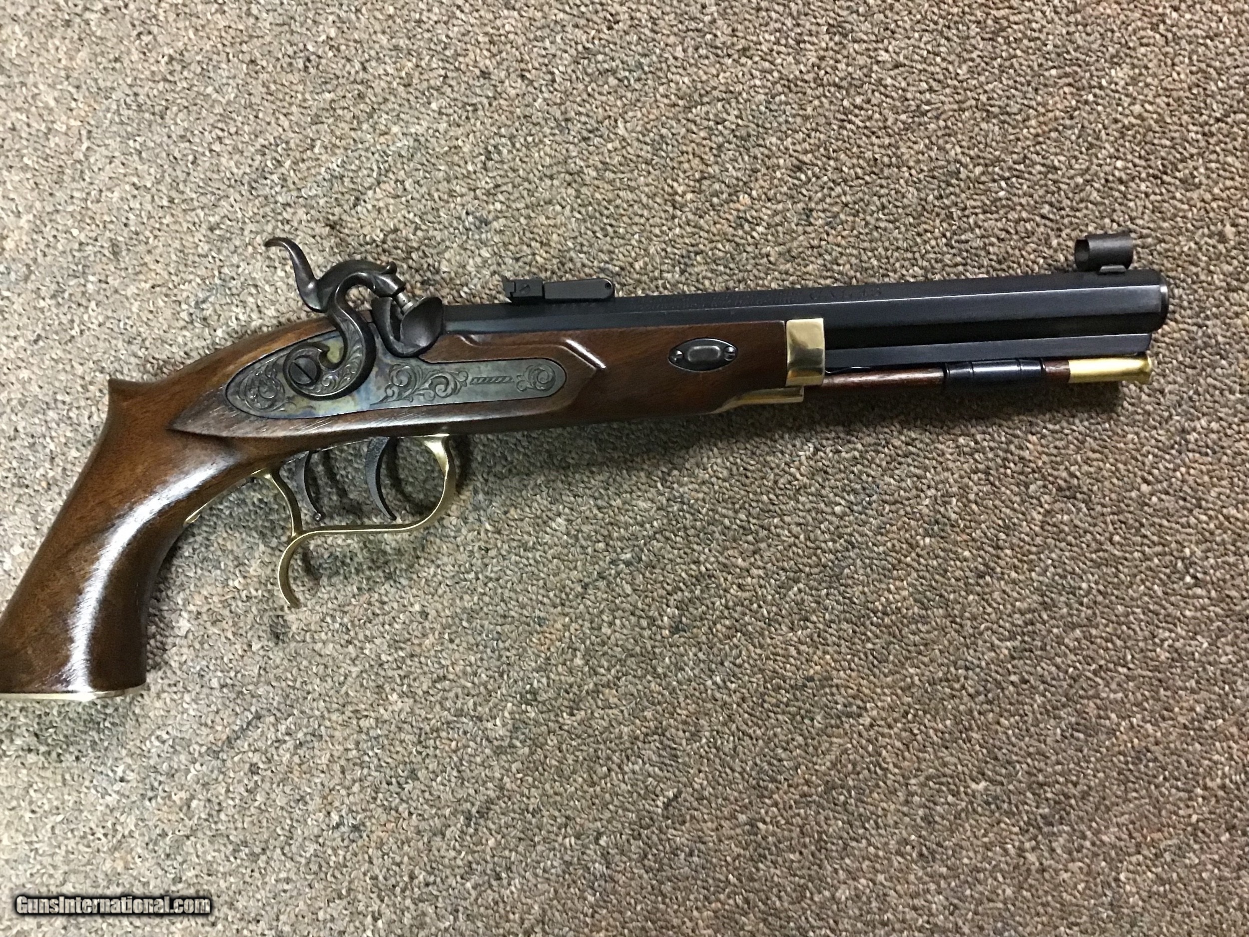 Description: Long considered one of the most accurate black powder pistols, this specimen has been primarily used as a display. Features are the brass nosepiece on stock which are on the later more desirable specimens, double set triggers, 9" octagon barrel in .45 CAL. MFG from approximately 1987 to 1996 when production ceased due to factory fire in NH which destroyed machinery and tooling. Buyer pays shipping. SOLD |