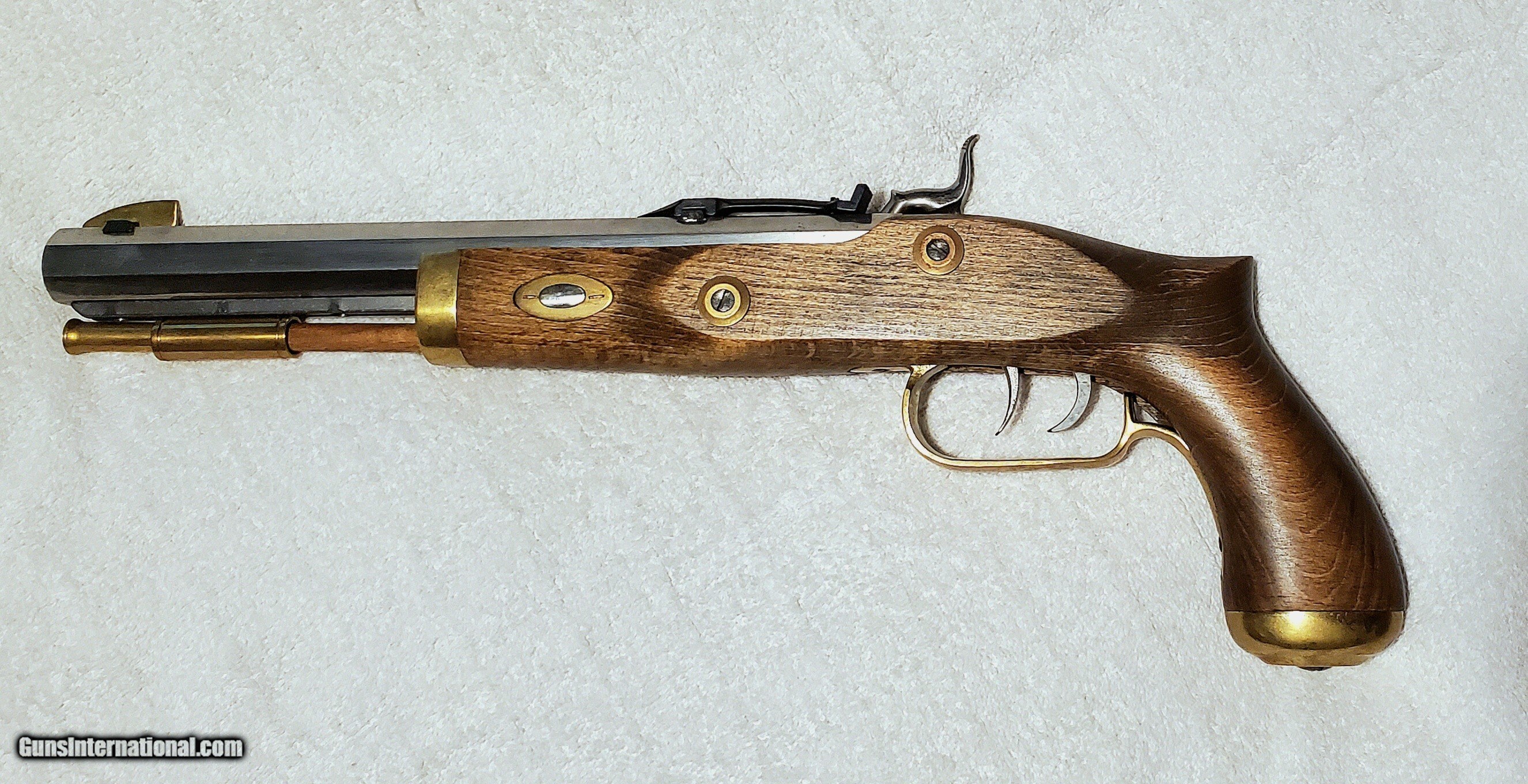 Description: Traditions Trapper pistol, built from a kit. In .50 calibur percussion. 9.75" barrel and 15.5" overall length. barrel has been filed smooth and polished in the white as well as other parts. Features a double set trigger and adjustable rear sight. Very clean excellent condition inside and out. comes with the printed manual and lead ball is available, will throw in free if wanted. Produced in Ardesa, Spain Buyer pays actual shipping cost Handgun Caliber: .50 Manufacturer: Traditions Model: Trapper pistol Serial Number: N/A Barrel Length: 9.75 Condition: Excellent Metal Condition: Excellent Wood Condition: Excellent Bore Condition: Excellent Action: Percussion Triggers: Set Stock: Hardwood Finish: In the white Price: $425.00 Buy Now Contact Seller |