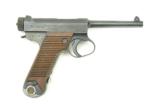 Description: Nagoya Type 14 Nambu 8mm Caliber Pistol. Excellent Late War Japanese Nambu Type 14 with holster. Dated April of 1944. Gun is in remarkable condition with just about all of the original finish. Gun is all matching including magazine. Bolt still has case colors. Grips are excellent. Holster is excellent. Very fine rig! SOLD Curio/Relic: Yes |