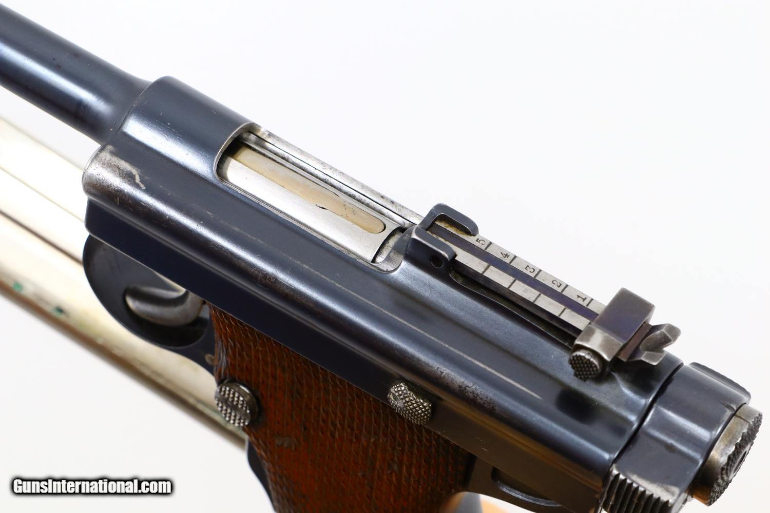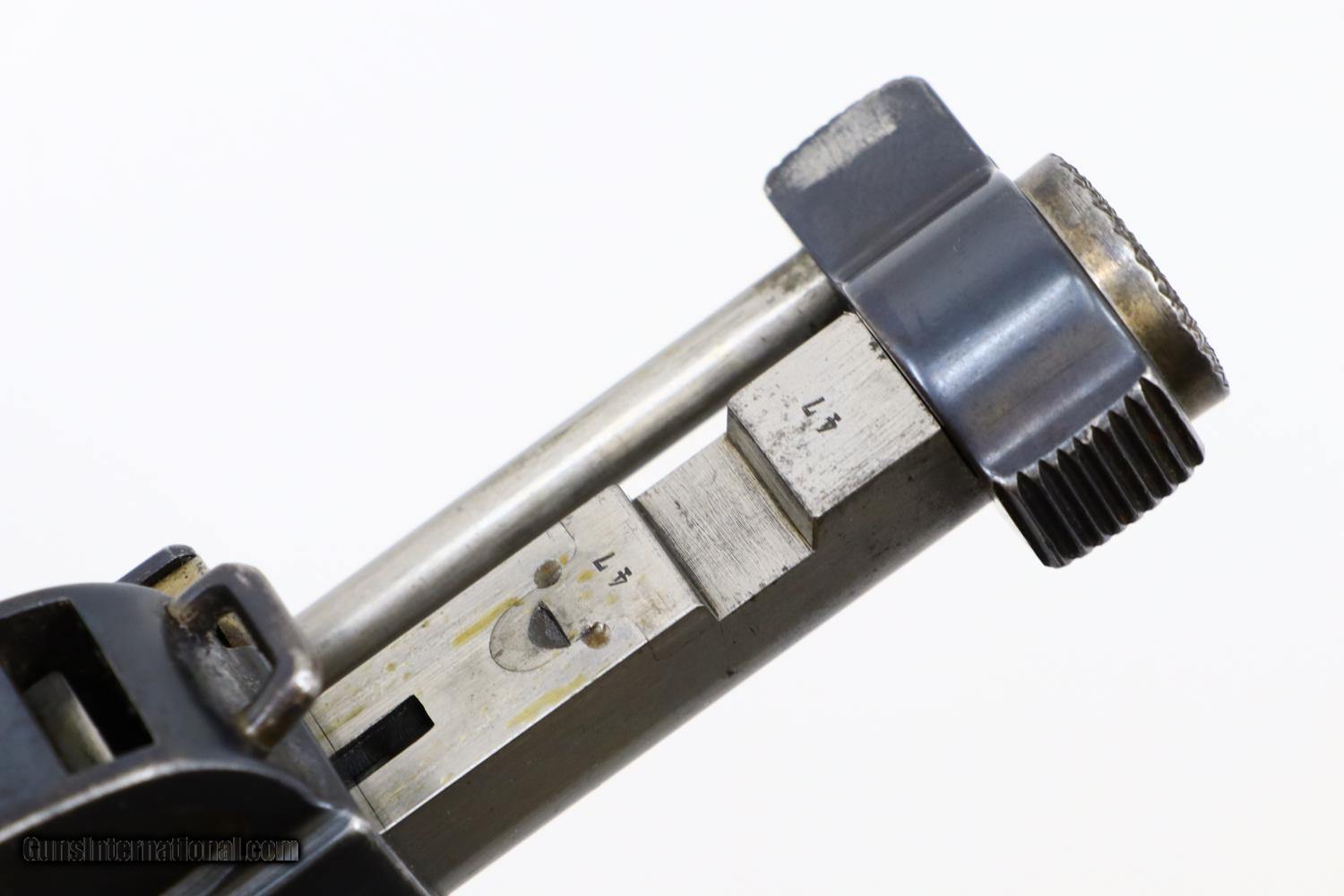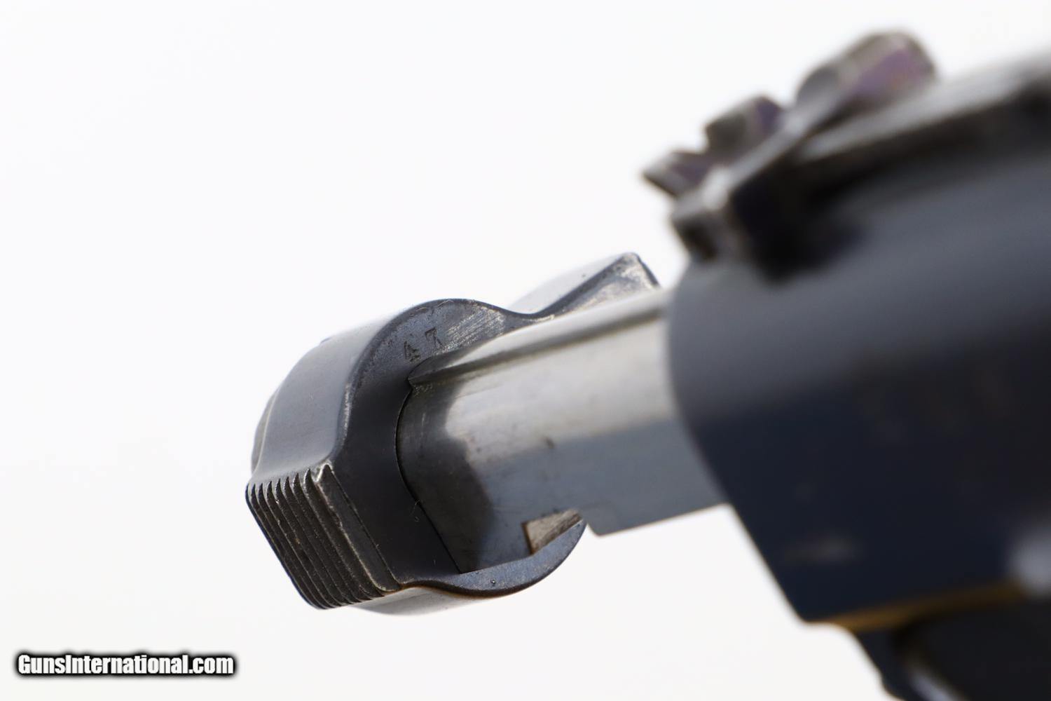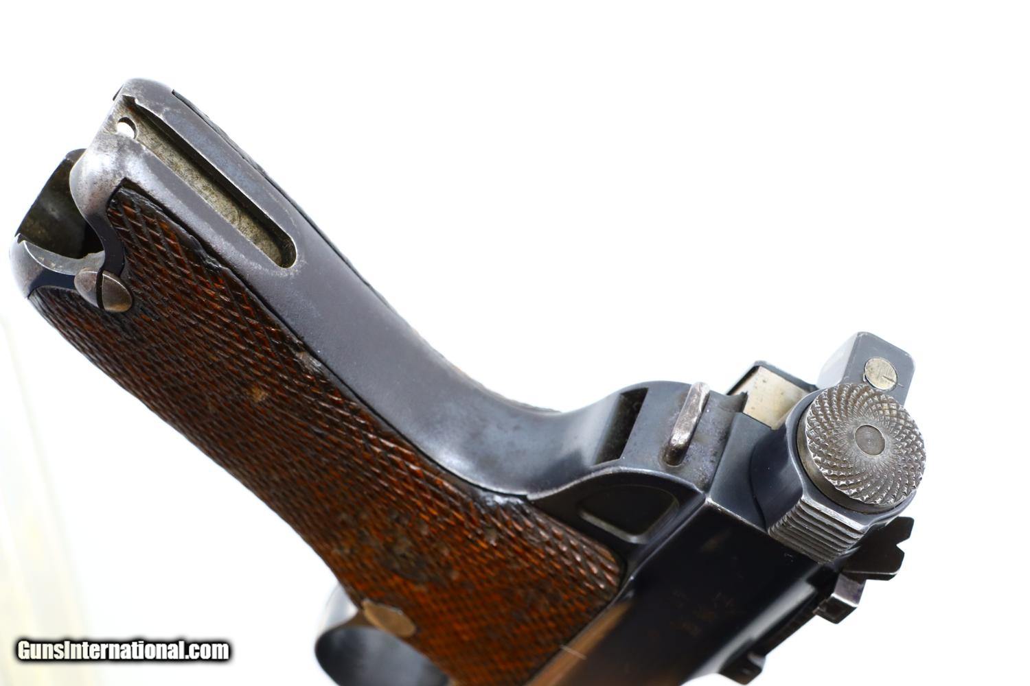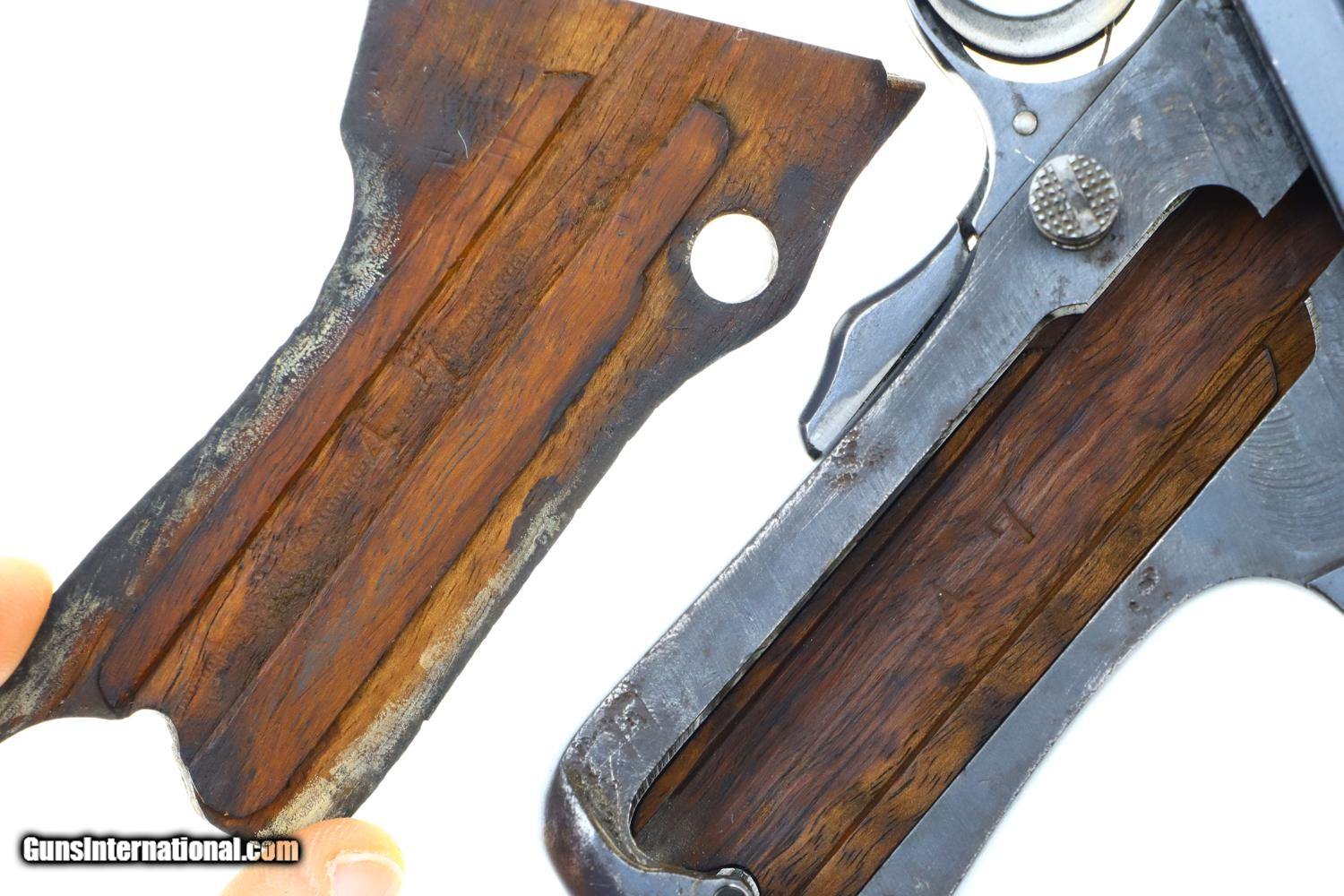 Description: Standard configuration Grandpa Nambu w/ 4.75" bbl., drift adjustable front sight & tangent rear sight graded from 1-5. Kanji markings on right side of bbl. extension over the S# 47 that is repeated on the firing pin retainer, cocking piece, firing pin, mag. latch, mag. latch retainer, bottom of bolt (twice), bbl. extension, locking block, cocking piece guide rod, tangent sight & each of the grips. Major components rust blued. Fire blued rear sight components; strawed extractor, trigger & mag. release. Original wood checkered grips. Matching 8 rd. nickel plated mag. w/ original wood plug checkered on each side. Synopsis: Japanese Tokyo Arsenal, 1902, Grandpa Nambu, low SN, original finish and all matching including the magazine. Condition: VG-Excellent original rust blue w/most of the rub marks on right side of bbl. & bbl. extension & front of trigger guard, areas that would have been in contact w/ stock. Grips w/ stains & blunted checkering, the right panel w/ numerous indents as photographed. Bright bore w/ sharp rifling. Perfect manual mechanics, though heavily greased internals make for a sluggish return. One of the nicer all original 1902 Grandpas, this one with two digit SN, especially when all matching including the mag! ~~Insured shipping fee of $155; most packages shipped using FedEx 2nd Day.~~ SOLD Curio/Relic: Yes Manufacturer: Tokyo Arsenal Serial Number: 47 Caliber Info: 8mm |