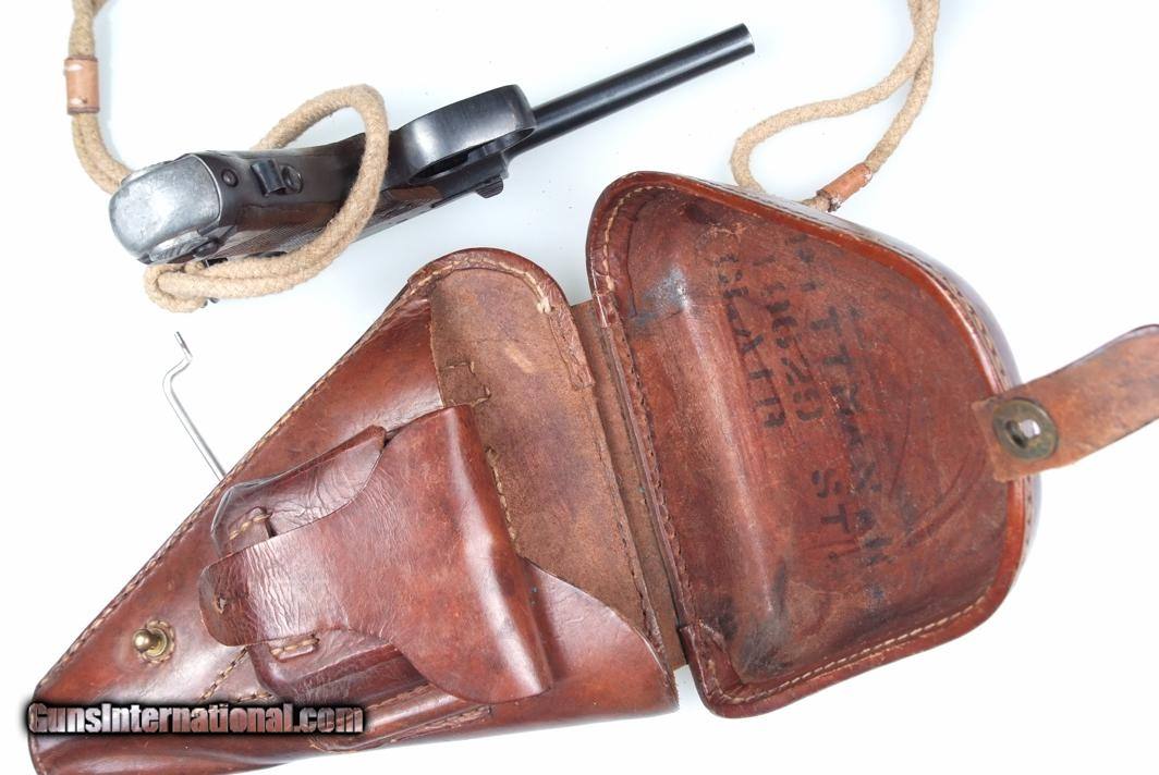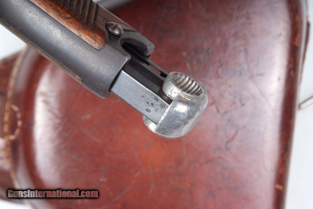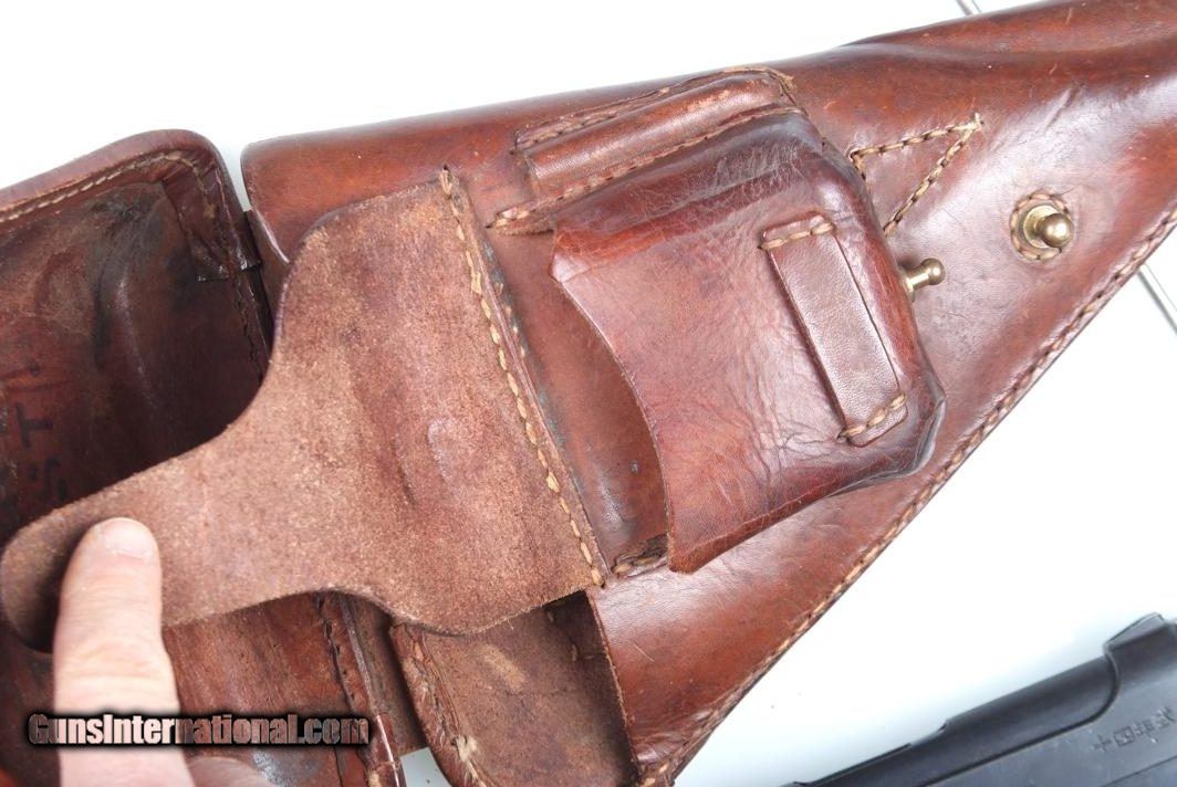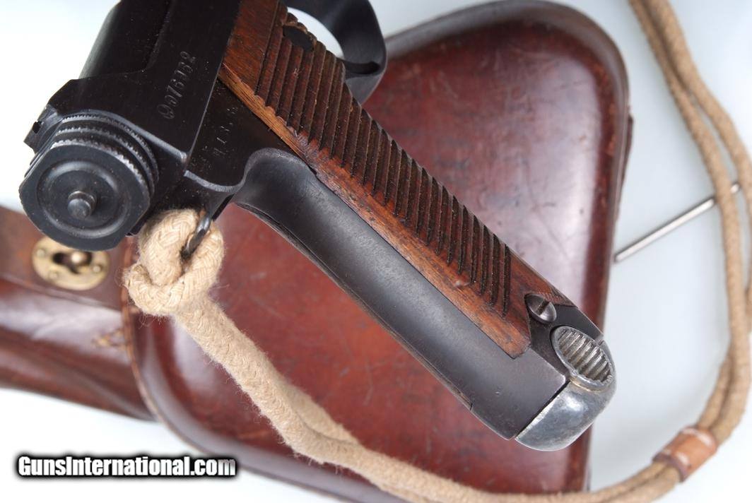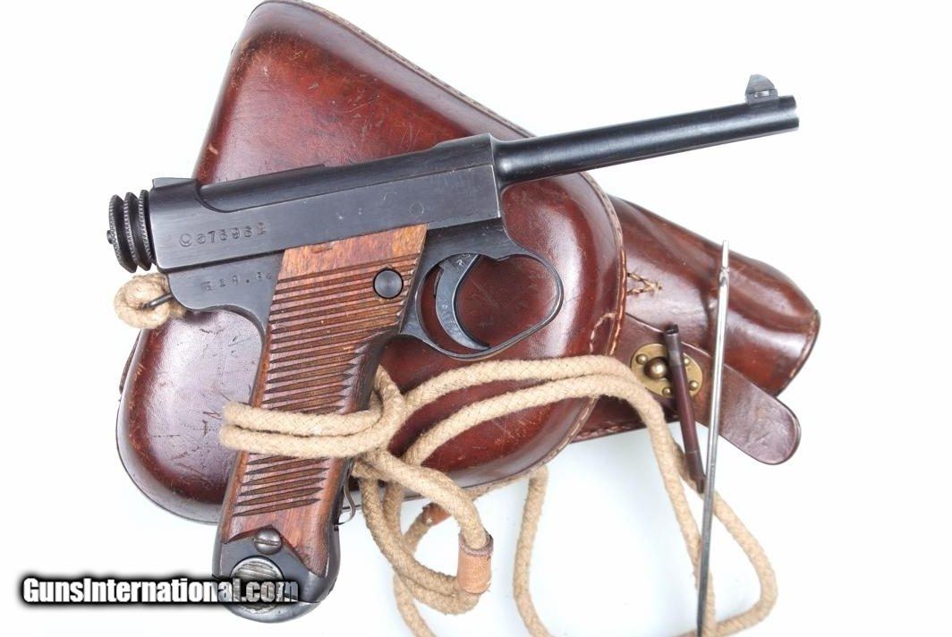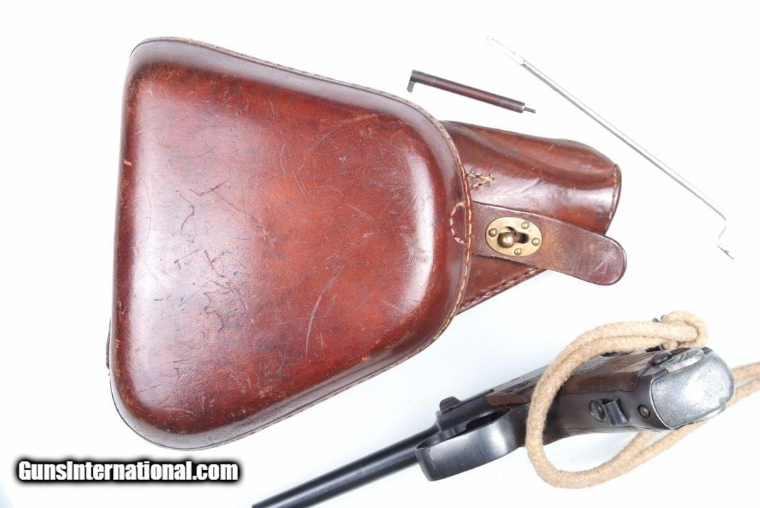 Description: Late war Japanese T14, first series Toriimatsu, 8mm Nambu, standard cocking nob, made 18.6 (June 1943), all matching including magazine. Reproduction lanyard cord. Leather holster with solid securing tab, previous ownership stenciled on both sides of lid. Reproduction chrome/nickled cleaning rod. Spare firing pin, likely a reproduction, is unmarked. Synopsis: Toriimatsu, Japanese, Nambu T14, First Series. All Matching, Leather Holster, Cleaning Rod, Spare Firing Pin. Condition: Near excellent with minor holster wear and fine speckling of backstrap. Comparable condition grips and magazine. Bright bore with sharp rifling. Perfect manual mechanics. VG+ leather holster with stenciling as previously noted. Excellent cleaning rod. ~~Insured shipping fee of $55; most packages shipped using FedEx 2nd Day.~~ SOLD Curio/Relic: Yes Manufacturer: Toriimatsu Serial Number: 76962 Caliber Info: 8mm Nambu |
