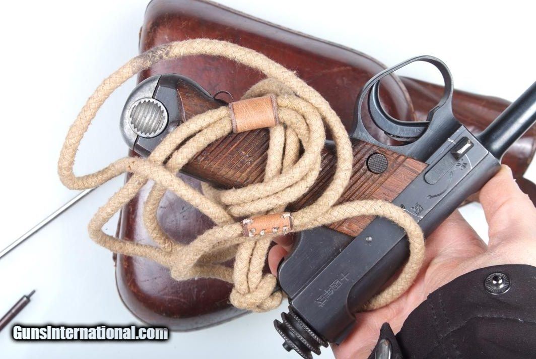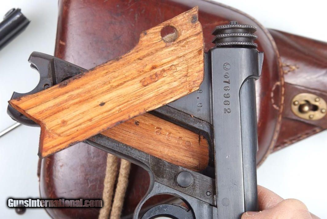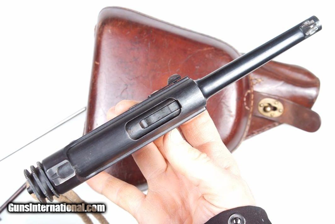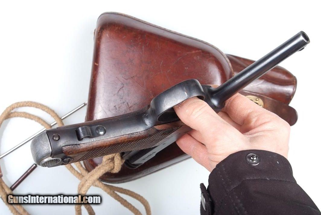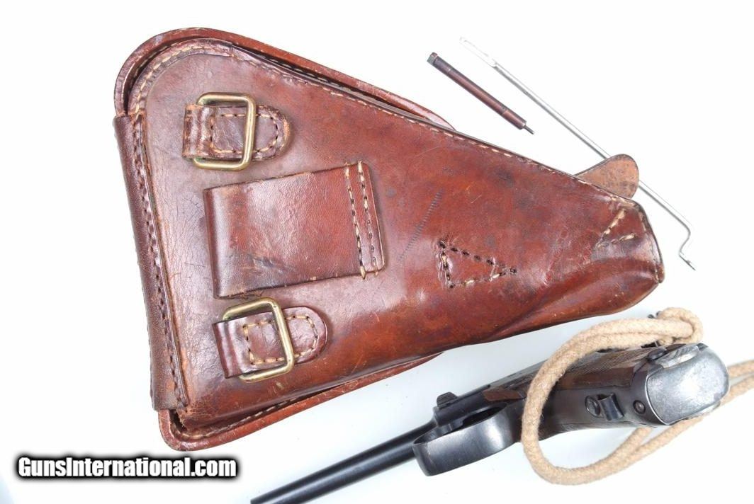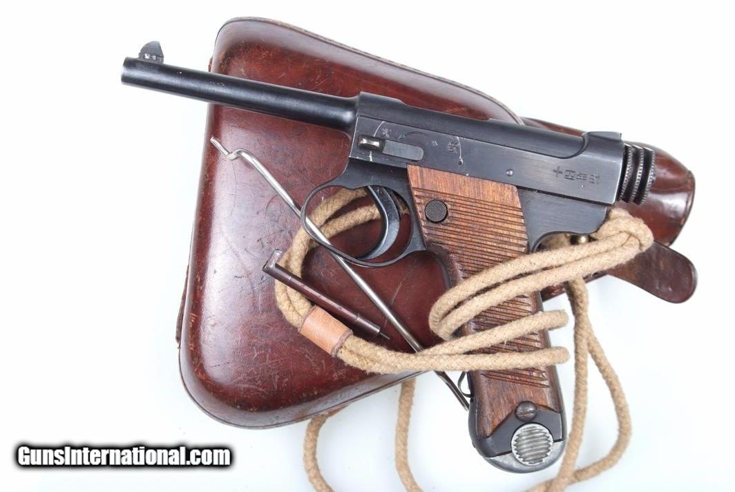 Description: Late war Japanese T14, first series Toriimatsu, 8mm Nambu, standard cocking nob, made 18.6 (June 1943), all matching including magazine. Reproduction lanyard cord. Leather holster with solid securing tab, previous ownership stenciled on both sides of lid. Reproduction chrome/nickled cleaning rod. Spare firing pin, likely a reproduction, is unmarked. Synopsis: Toriimatsu, Japanese, Nambu T14, First Series. All Matching, Leather Holster, Cleaning Rod, Spare Firing Pin. Condition: Near excellent with minor holster wear and fine speckling of backstrap. Comparable condition grips and magazine. Bright bore with sharp rifling. Perfect manual mechanics. VG+ leather holster with stenciling as previously noted. Excellent cleaning rod. ~~Insured shipping fee of $55; most packages shipped using FedEx 2nd Day.~~ SOLD Curio/Relic: Yes Manufacturer: Toriimatsu Serial Number: 76962 Caliber Info: 8mm Nambu |